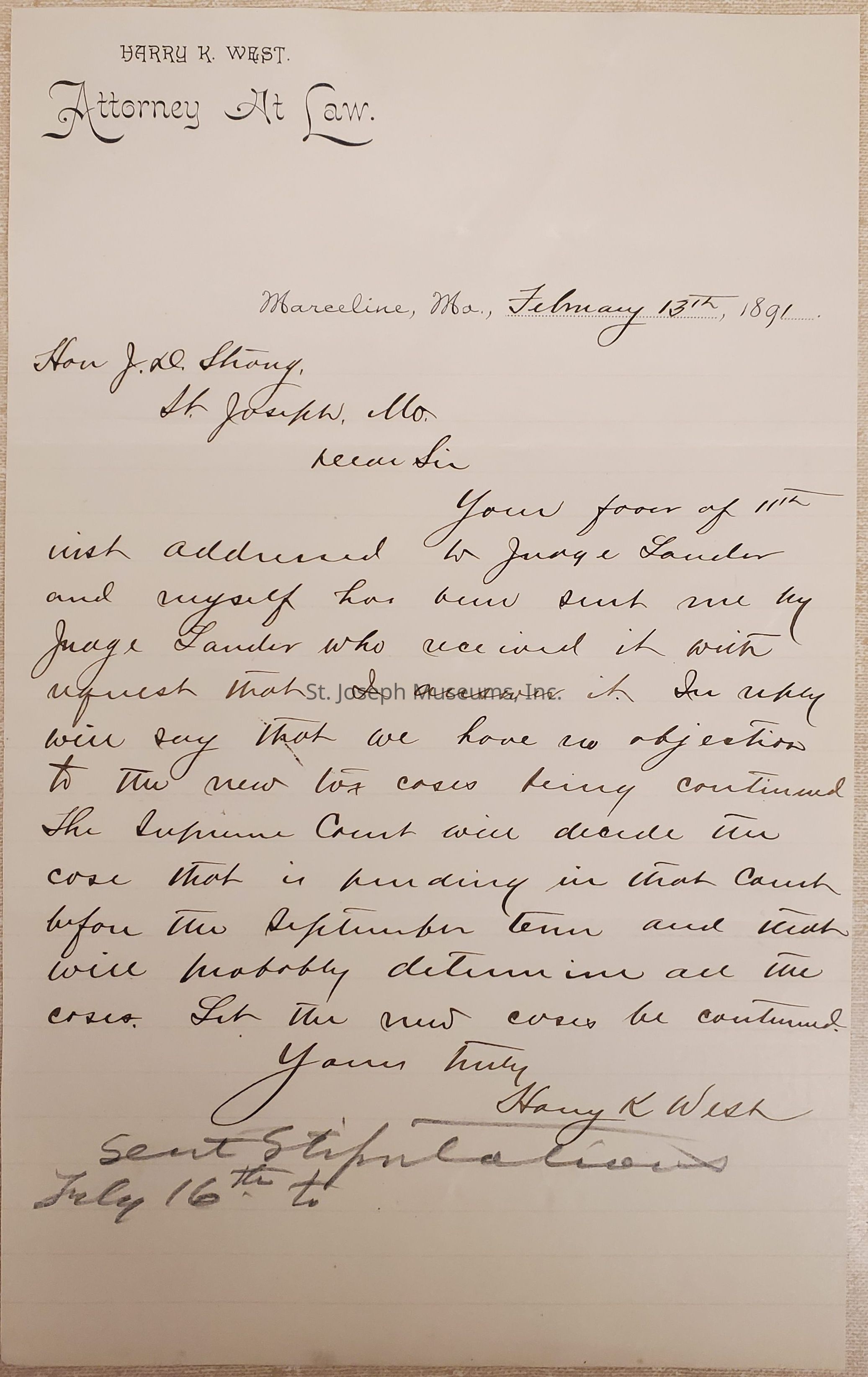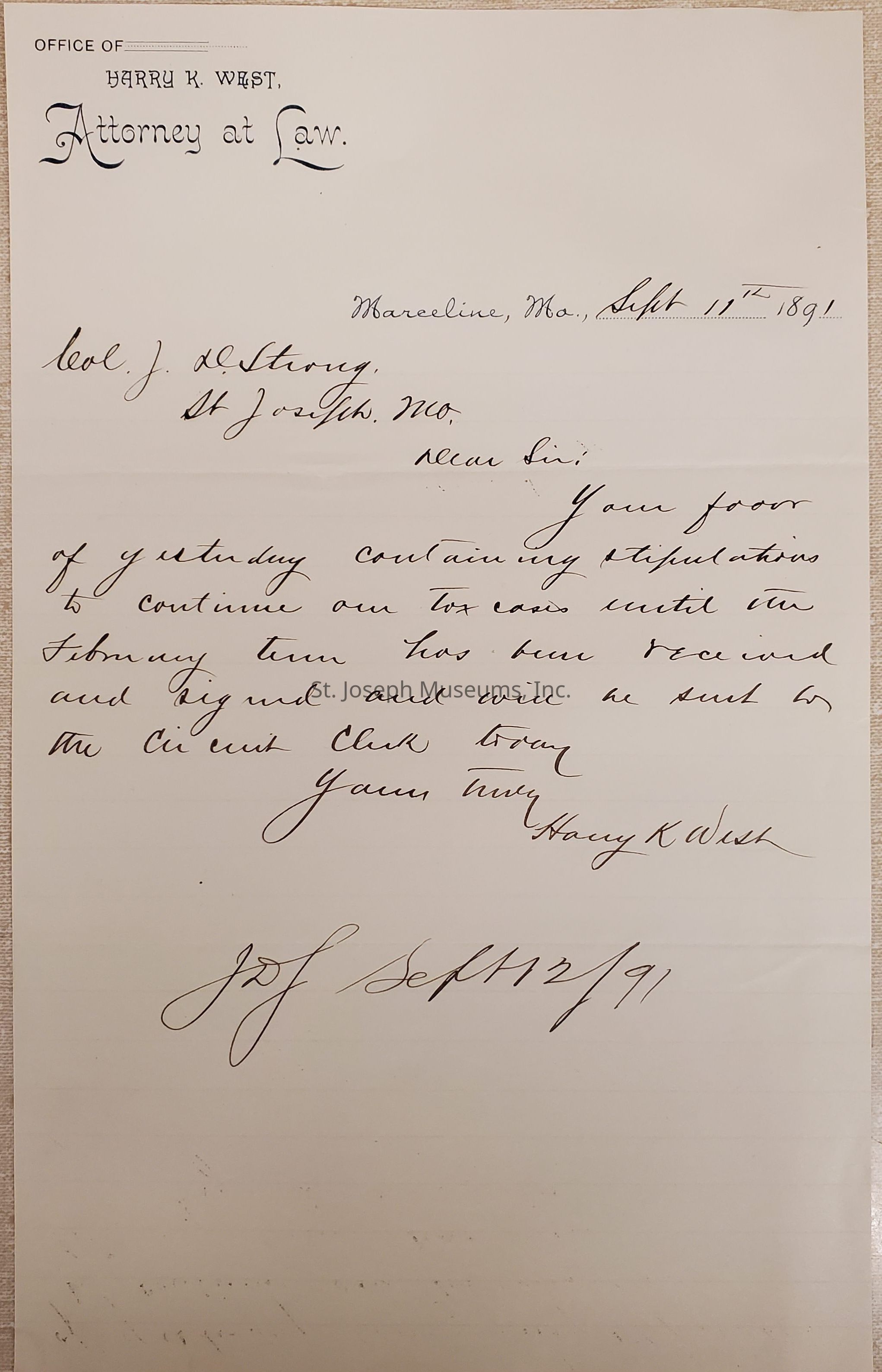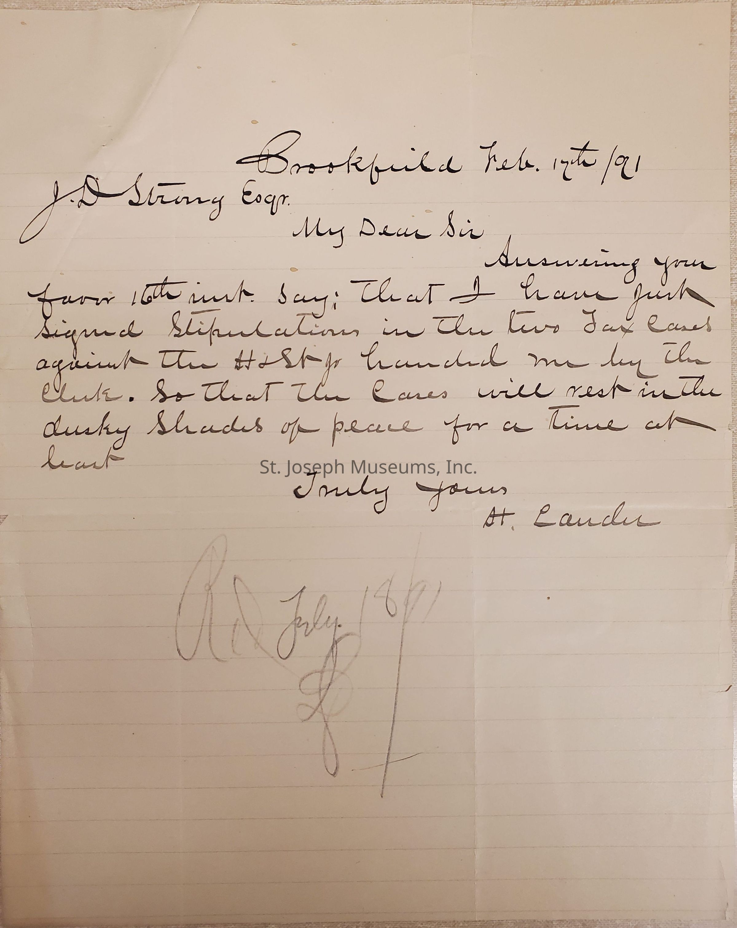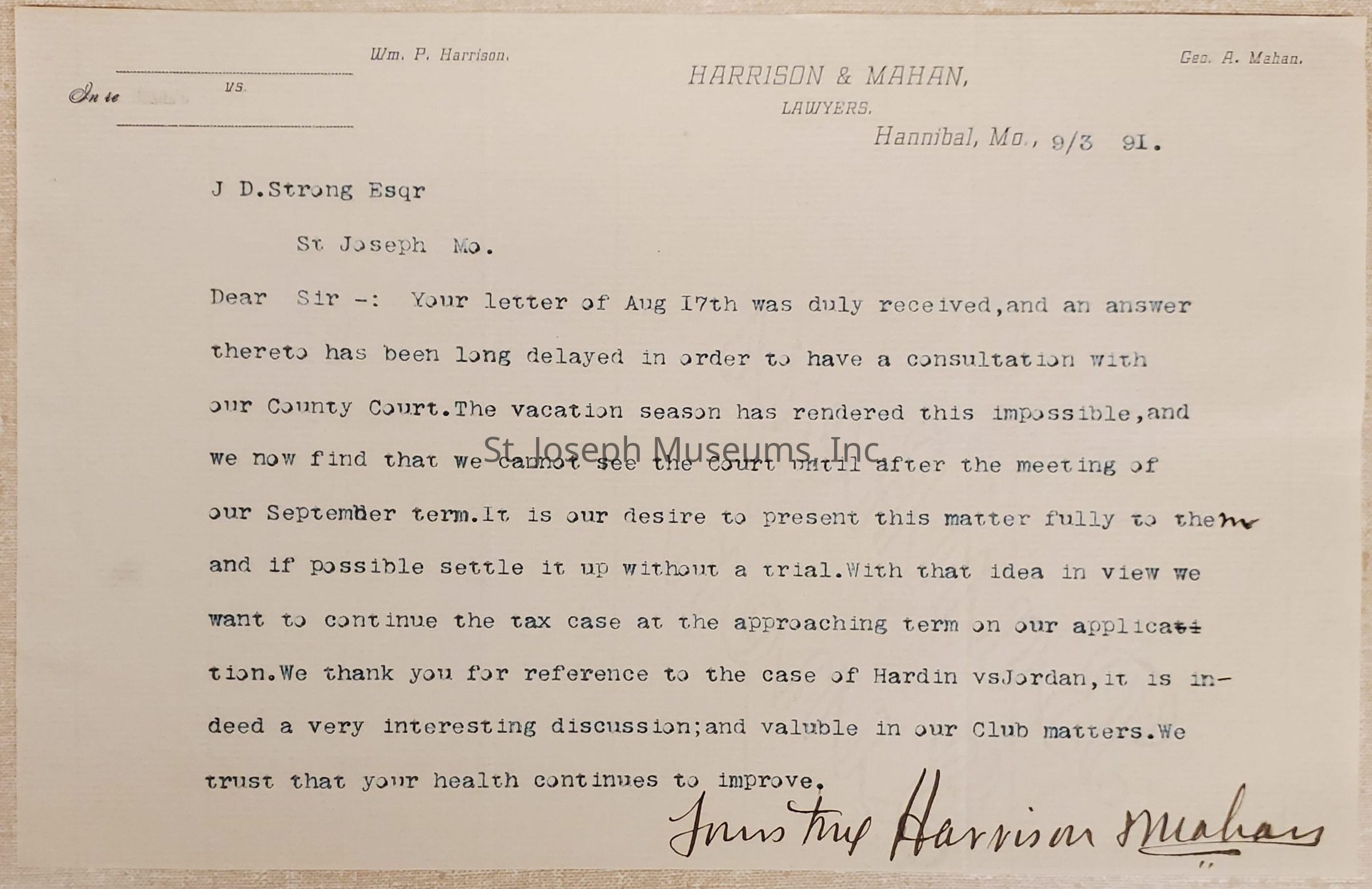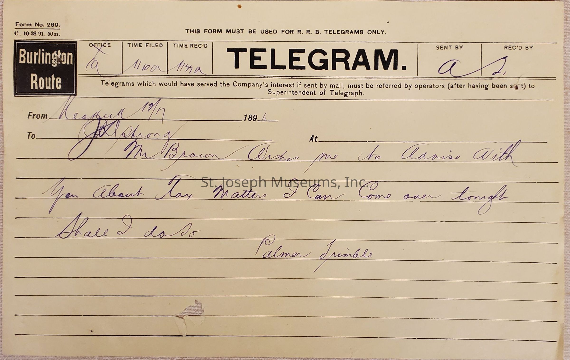 J. D. Strong was an attorney in St. Joseph. He was also a Judge, perhaps a U. S. Judge, as his cases are digested in Central Law Journal, 1880. At one time he was in the law department of the St. Joseph Kansas City and Council Bluff's Railroad. He lived on the south side of Felix Street between 13th and 14th Street. He was married to Mary E. Strong and had two sons, also lawyers, John W. and James W.