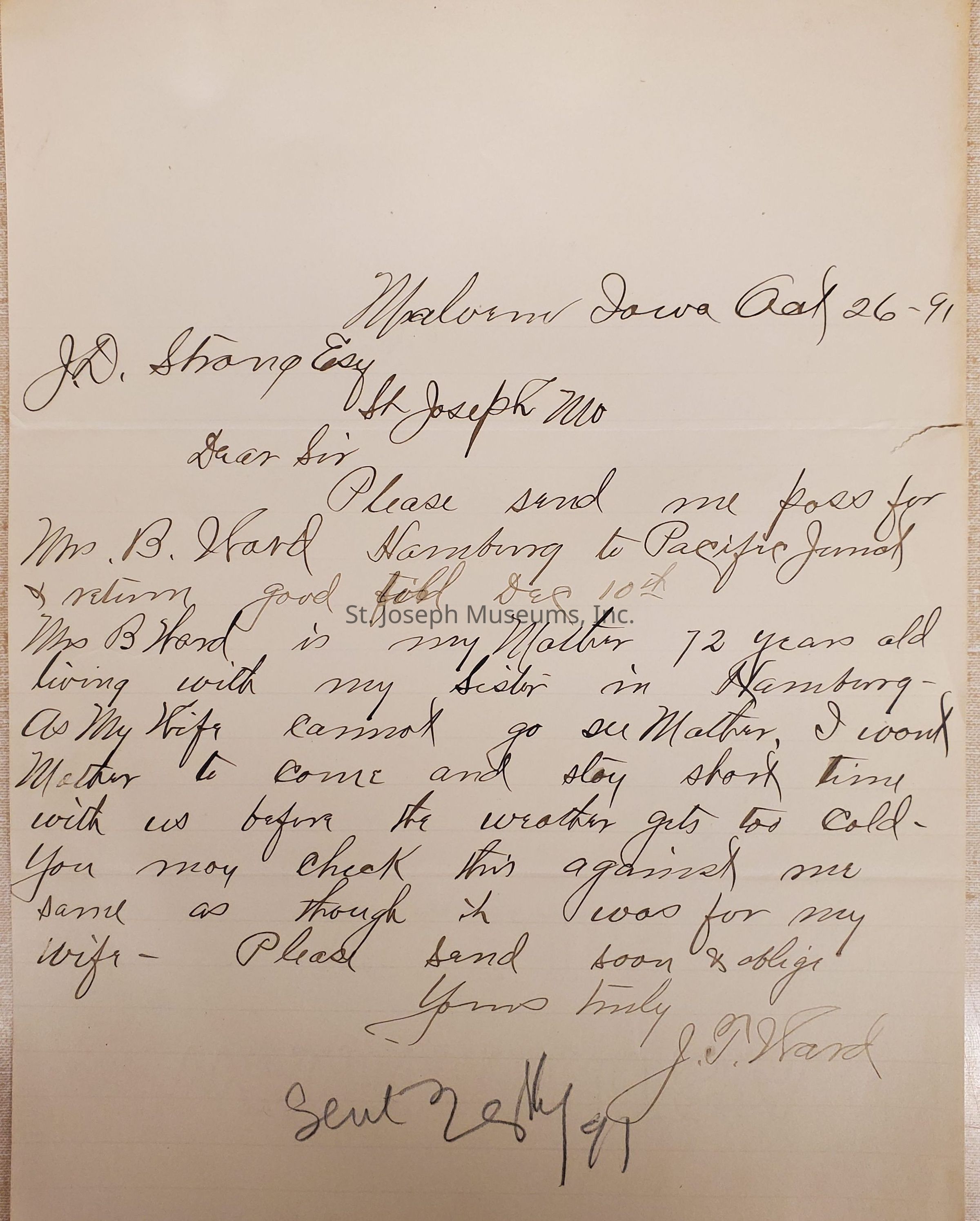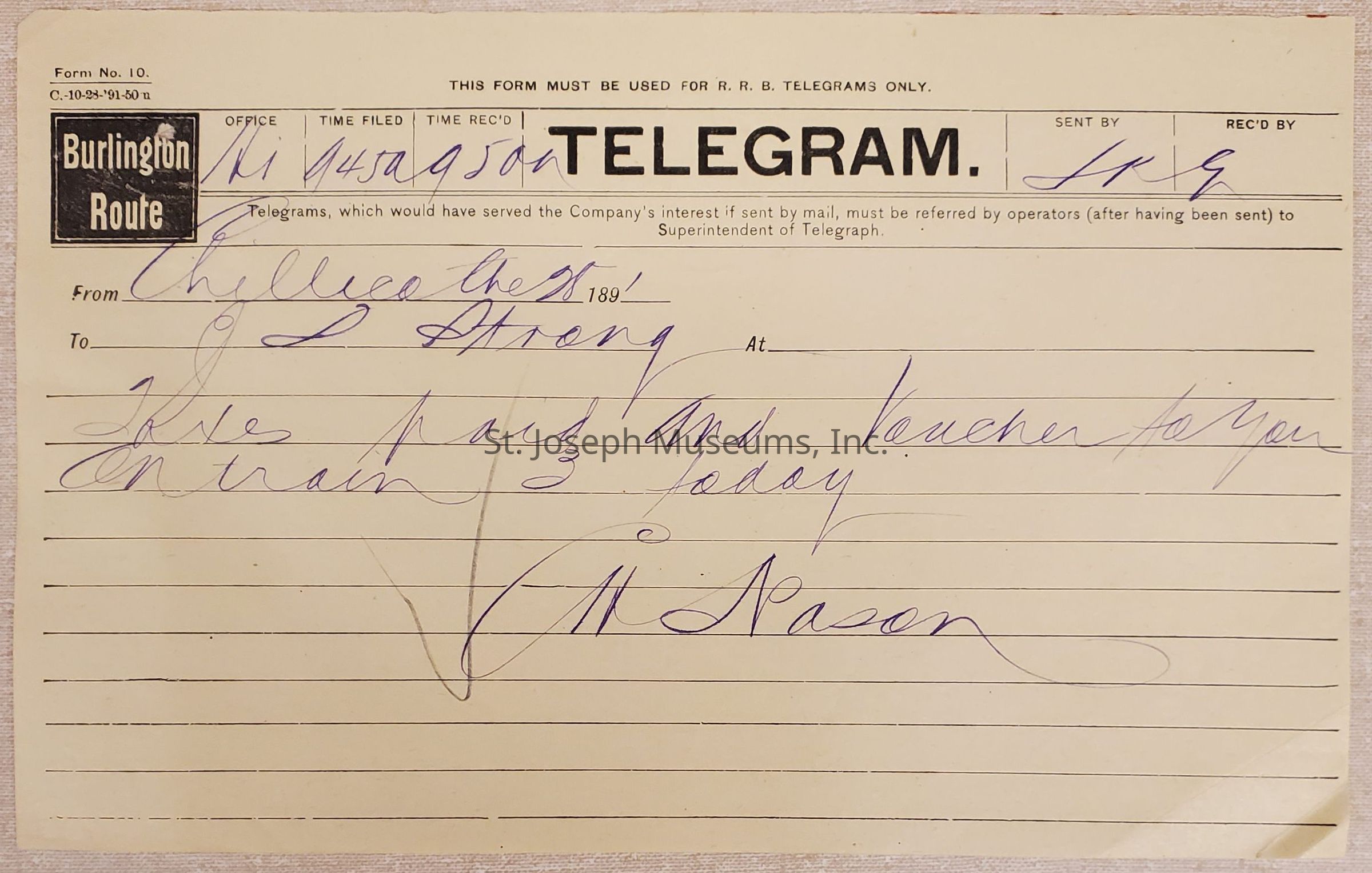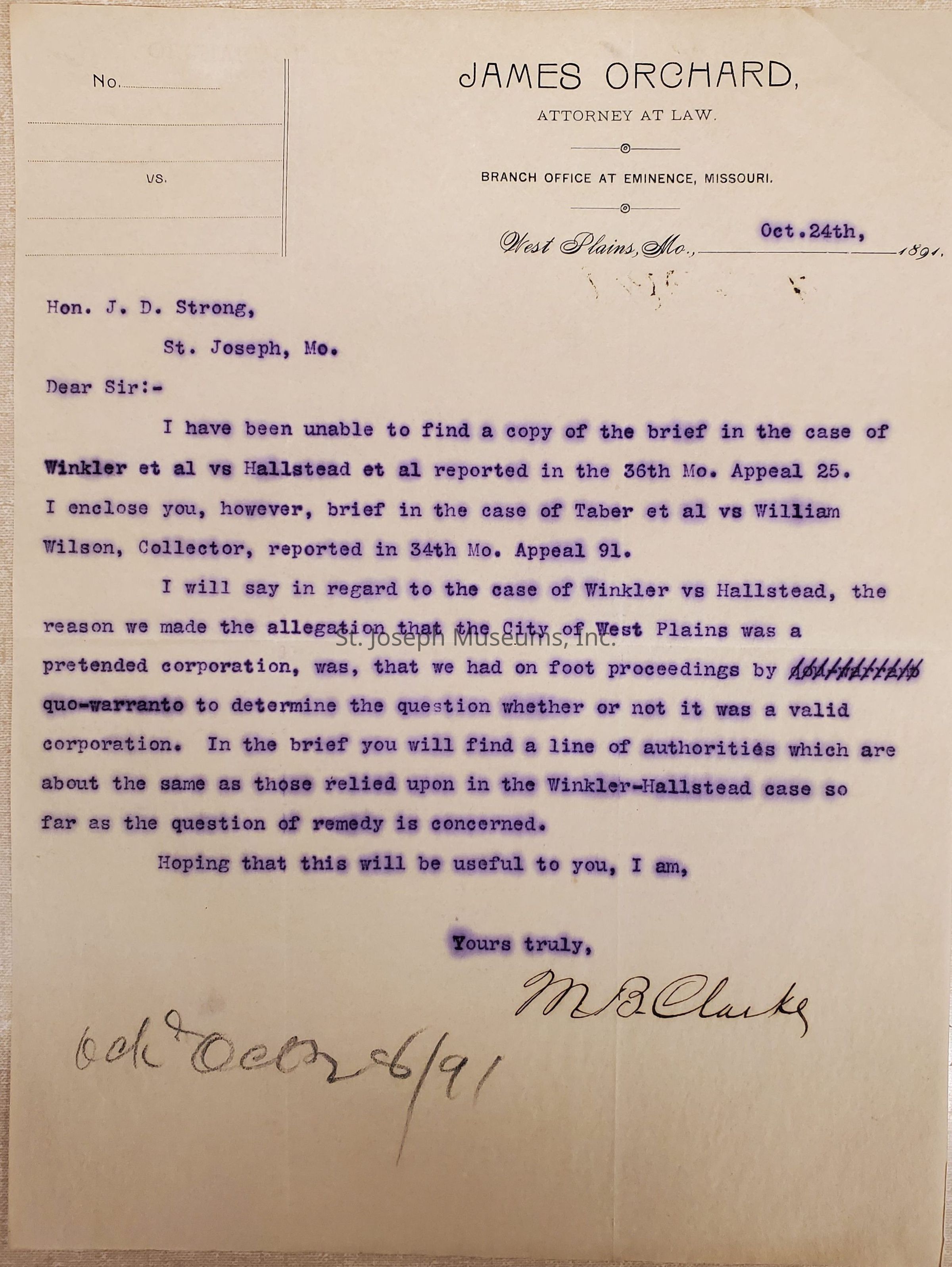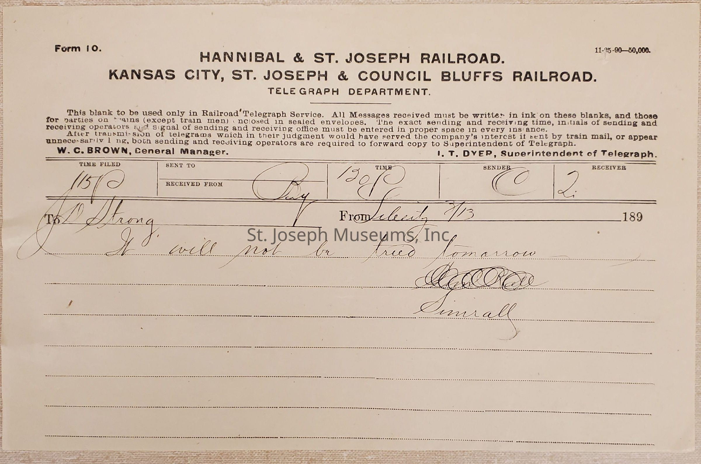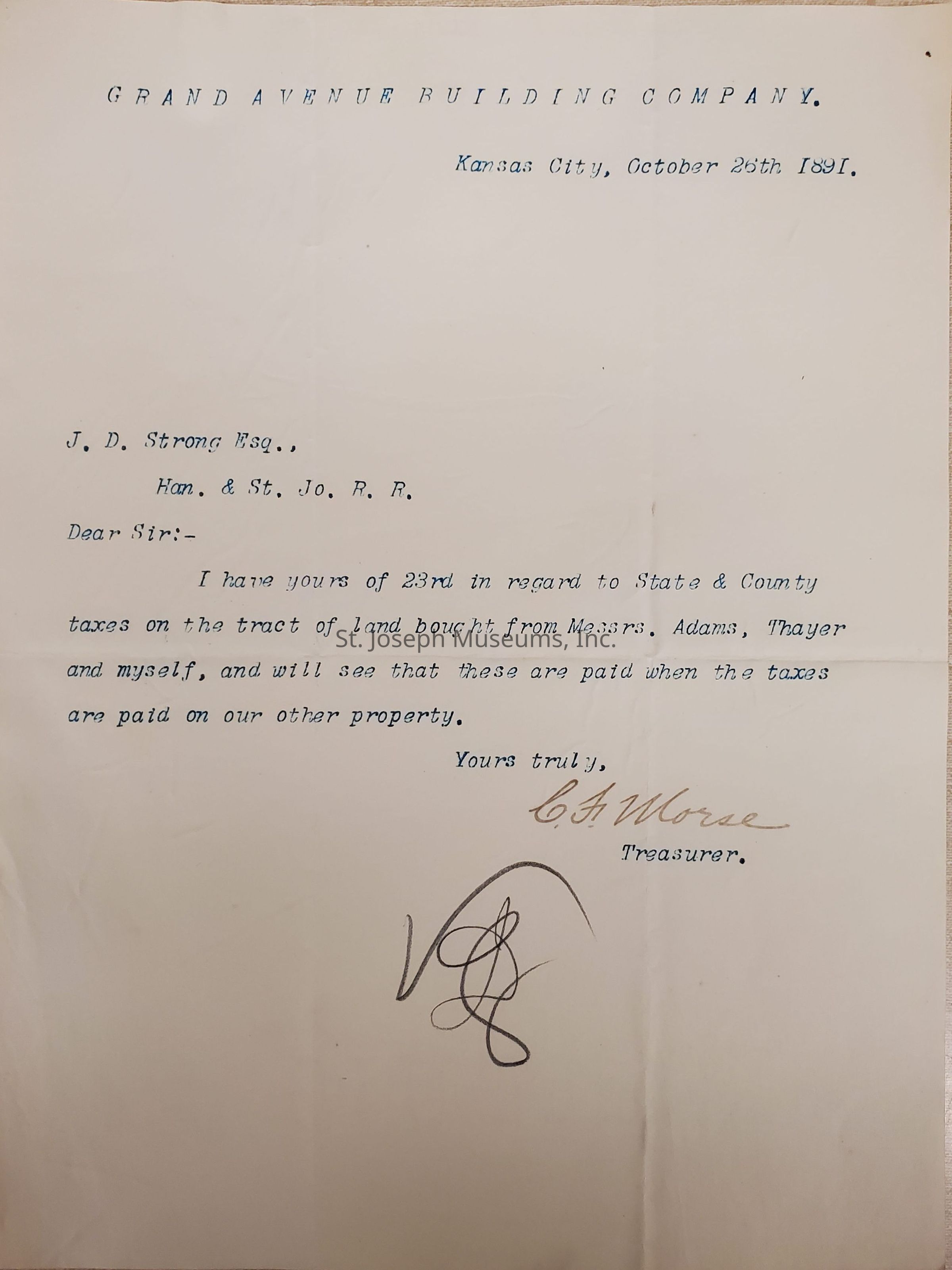 J. D. Strong was an attorney in St. Joseph. He was also a Judge, perhaps a U. S. Judge, as his cases are digested in Central Law Journal, 1880. At one time he was in the law department of the St. Joseph Kansas City and Council Bluff's Railroad. He lived on the south side of Felix Street between 13th and 14th Street. He was married to Mary E. Strong and had two sons, also lawyers, John W. and James W.