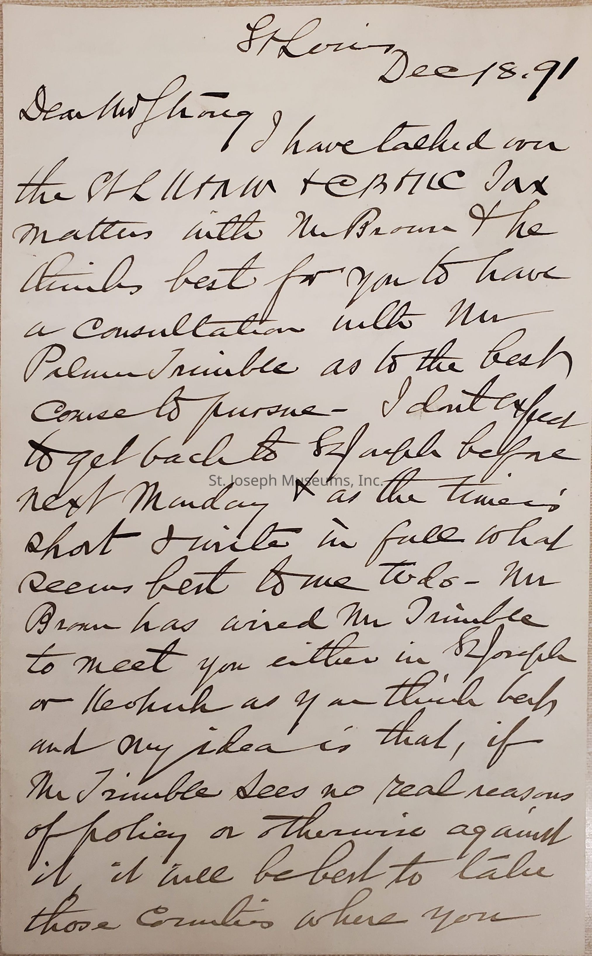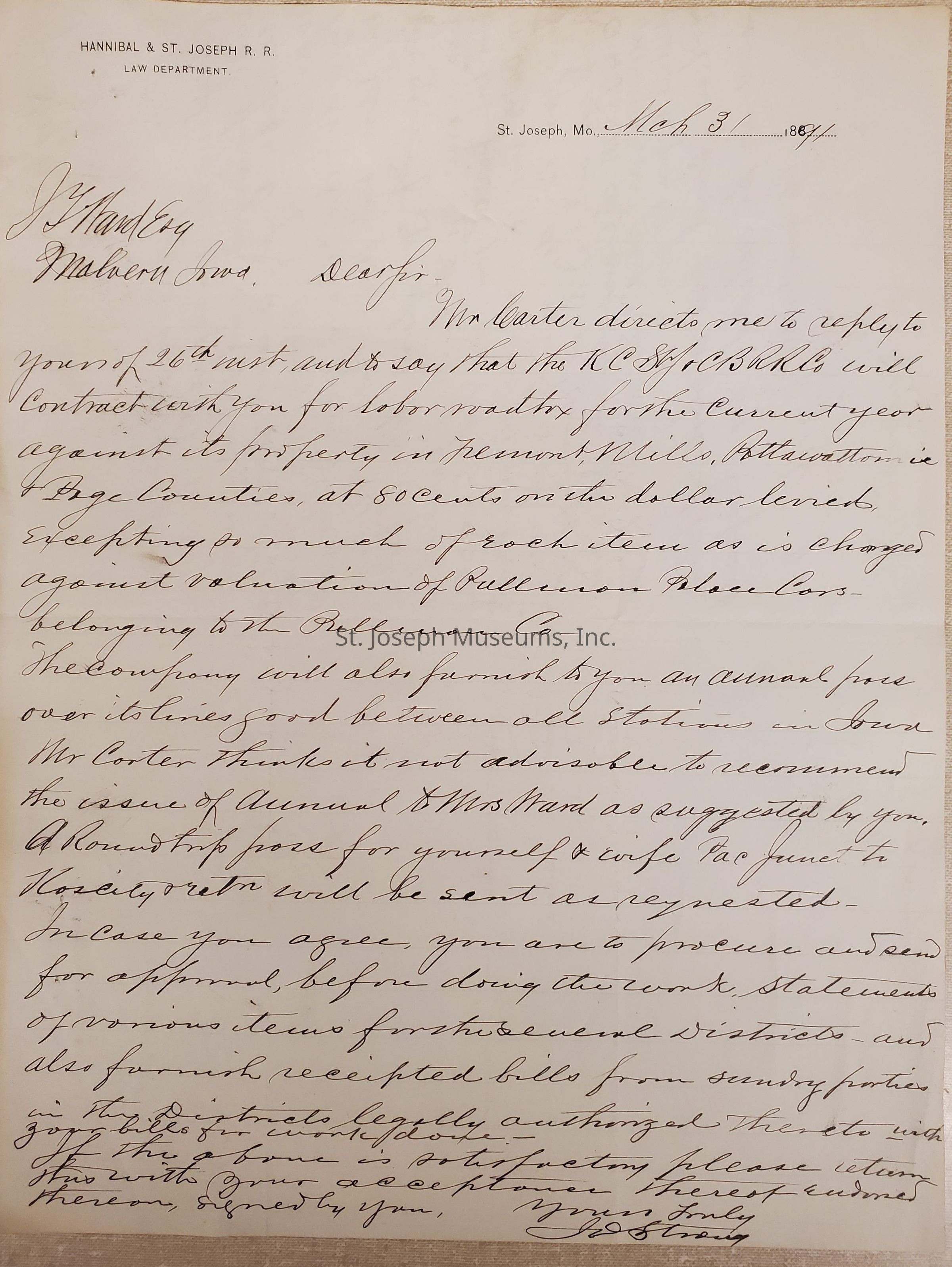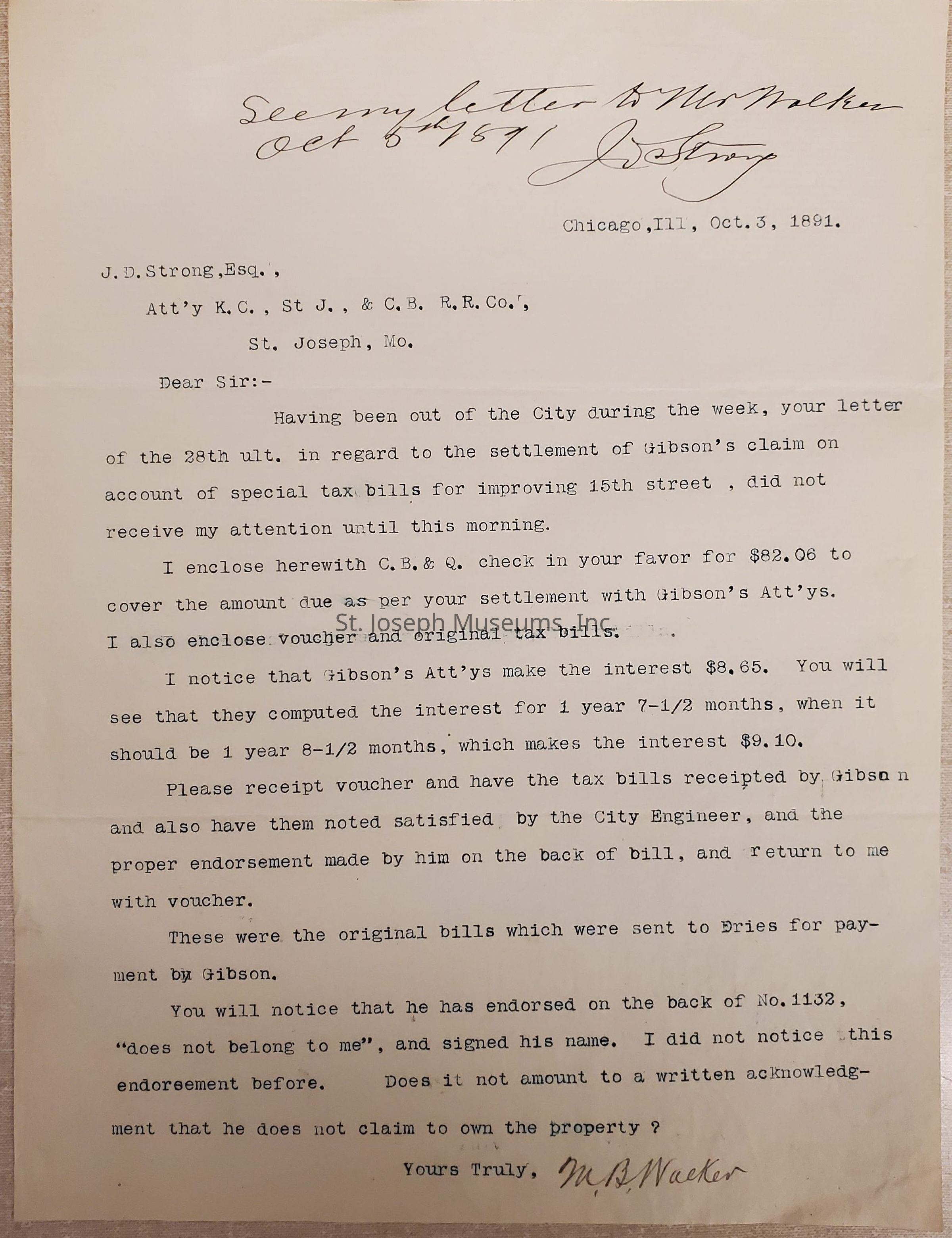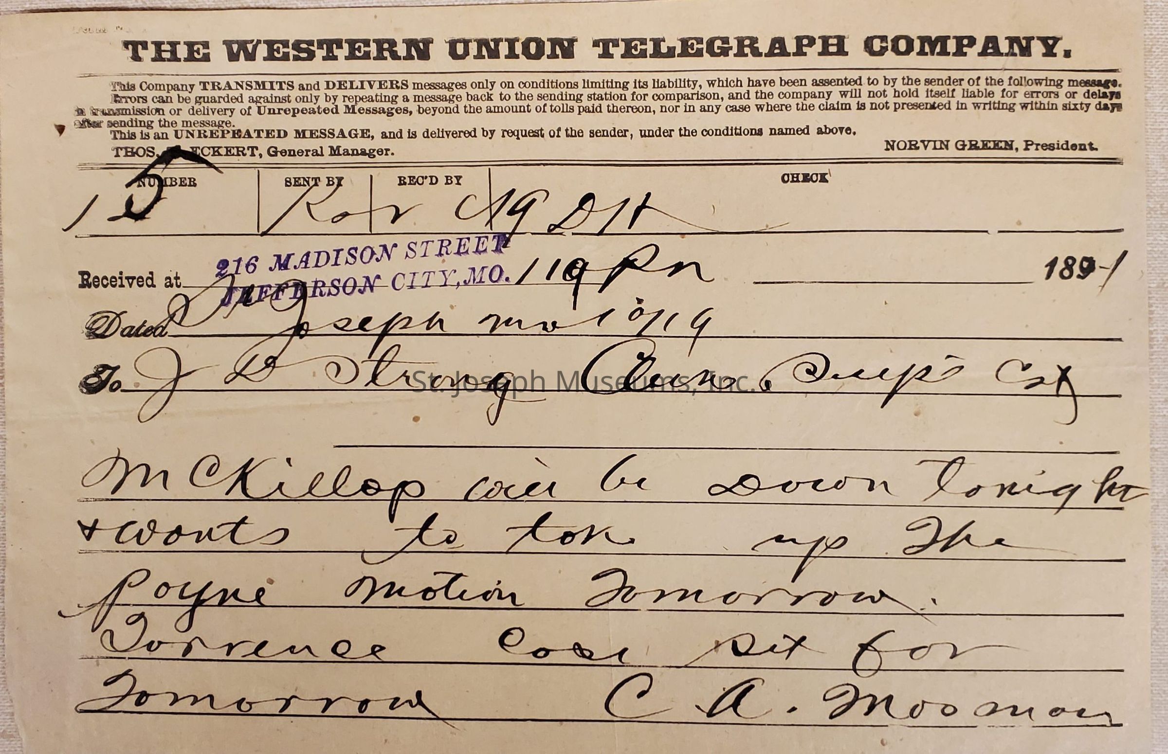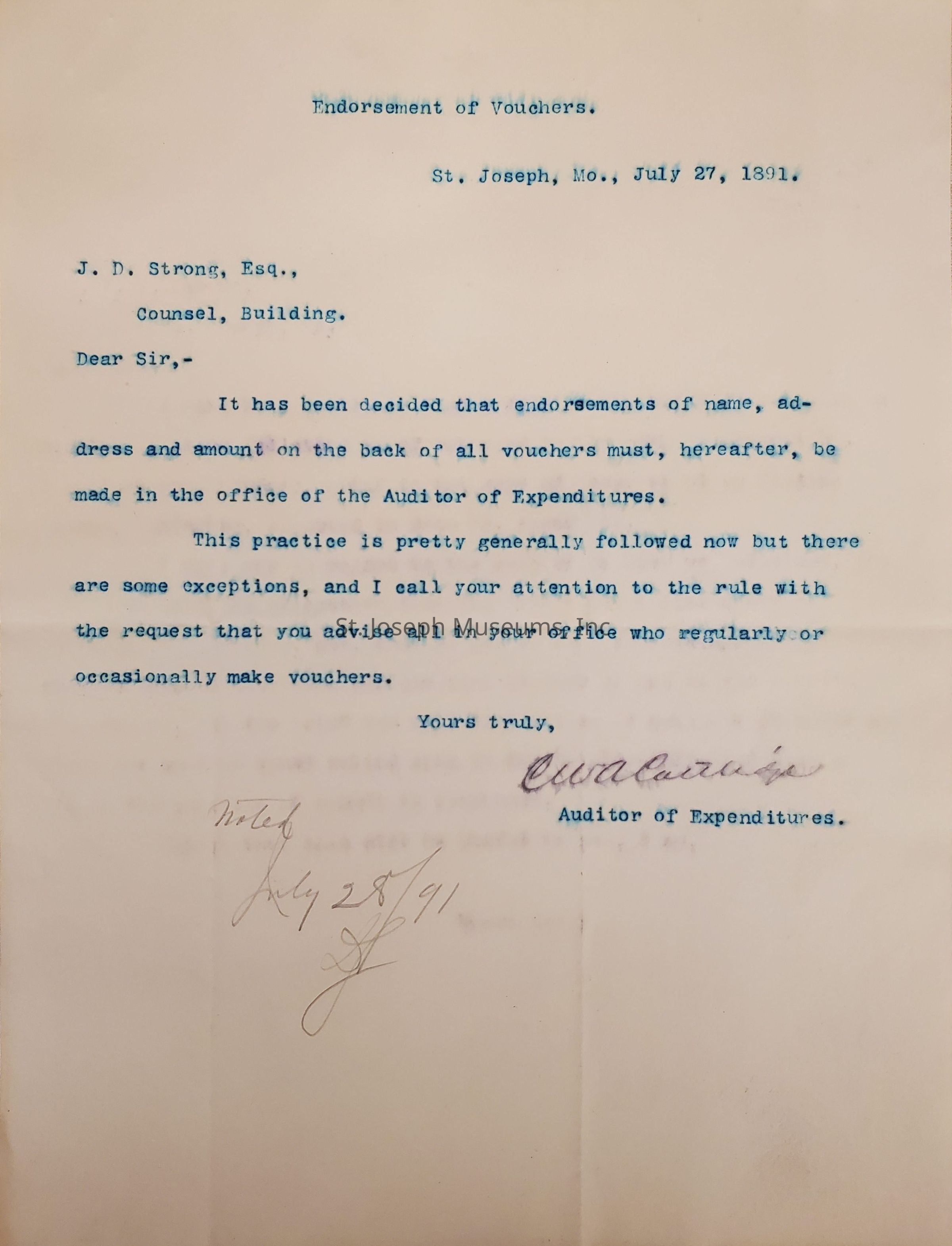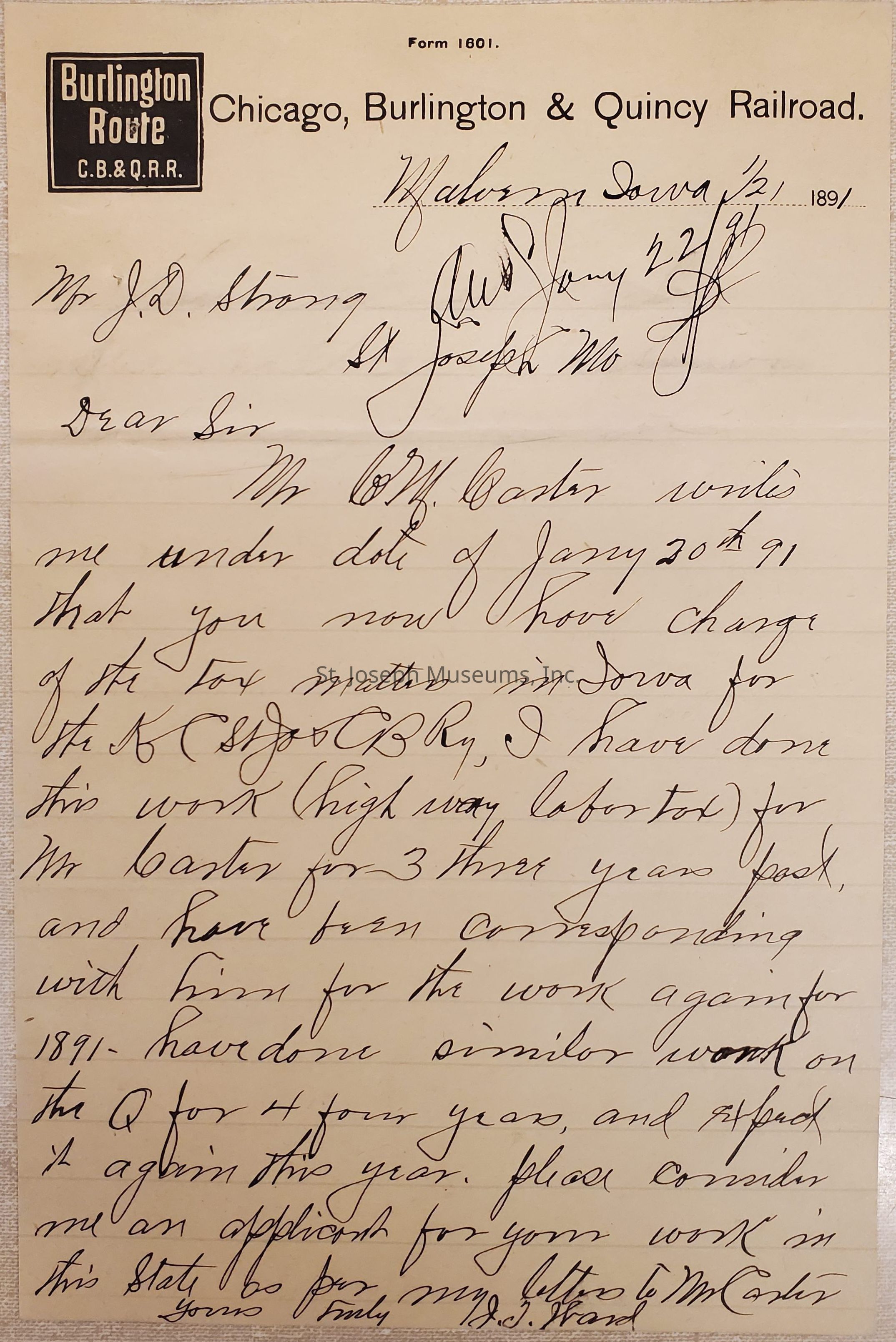 J. D. Strong was an attorney in St. Joseph. He was also a Judge, perhaps a U. S. Judge, as his cases are digested in Central Law Journal, 1880. At one time he was in the law department of the St. Joseph Kansas City and Council Bluff's Railroad. He lived on the south side of Felix Street between 13th and 14th Street. He was married to Mary E. Strong and had two sons, also lawyers, John W. and James W.