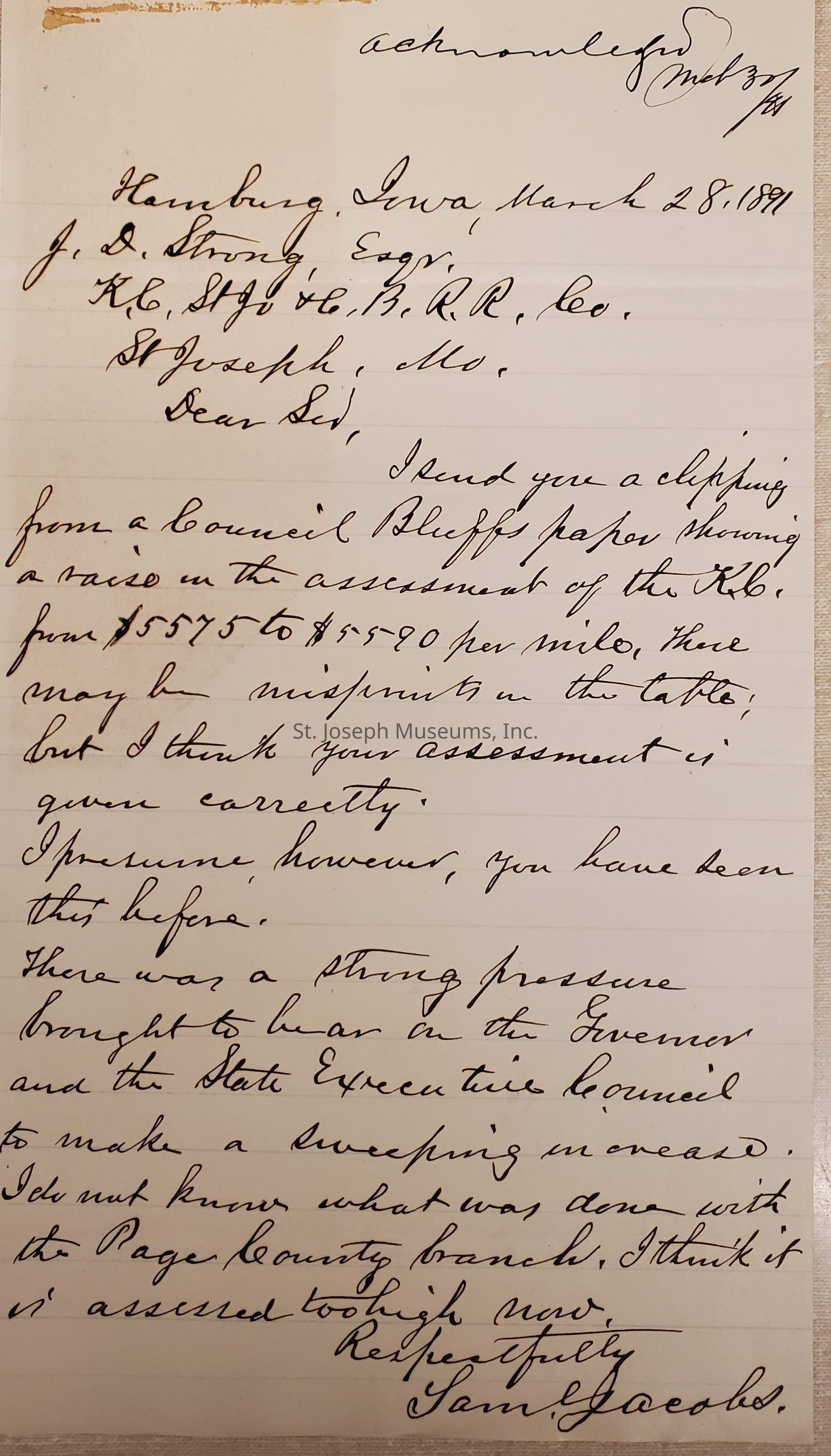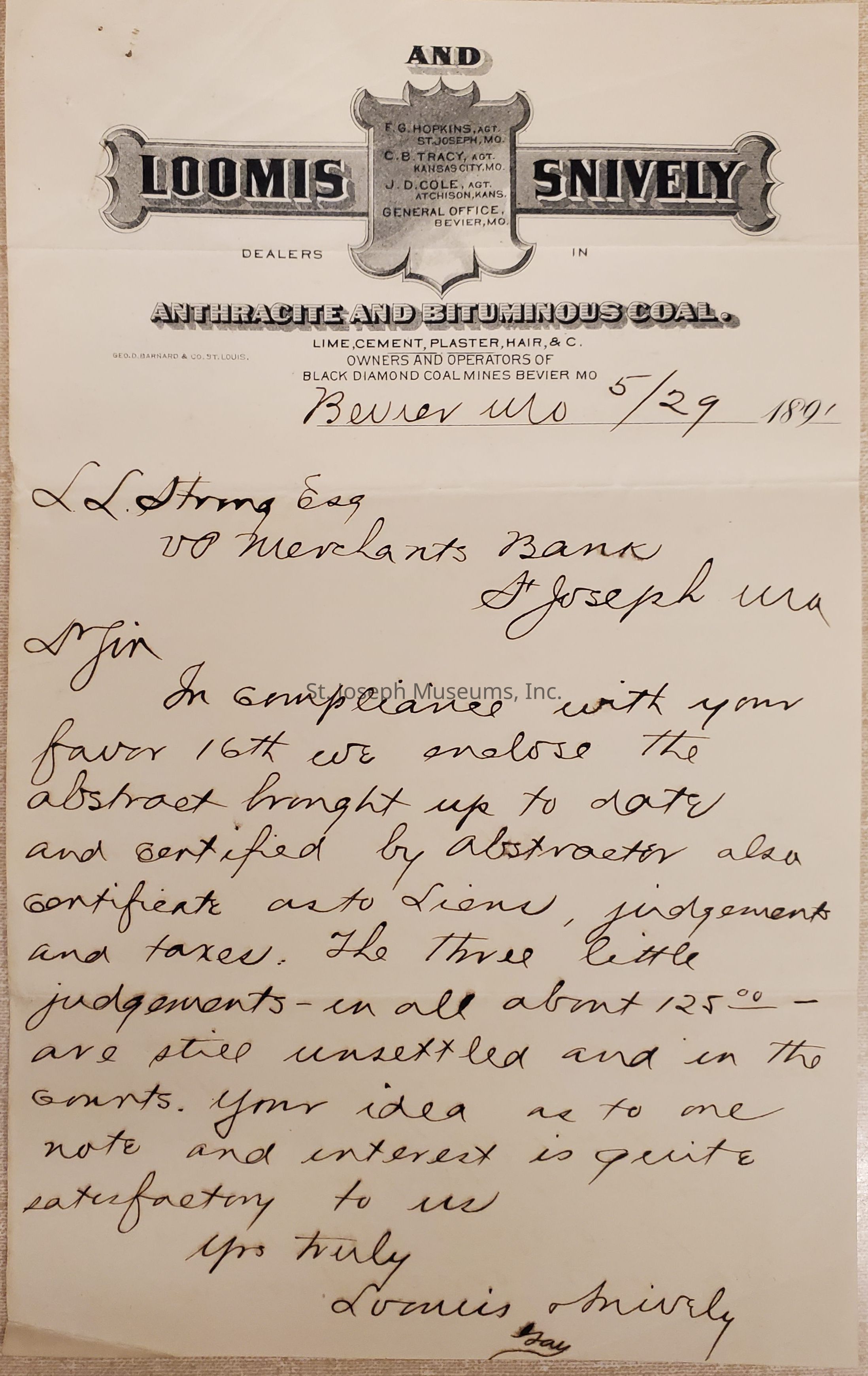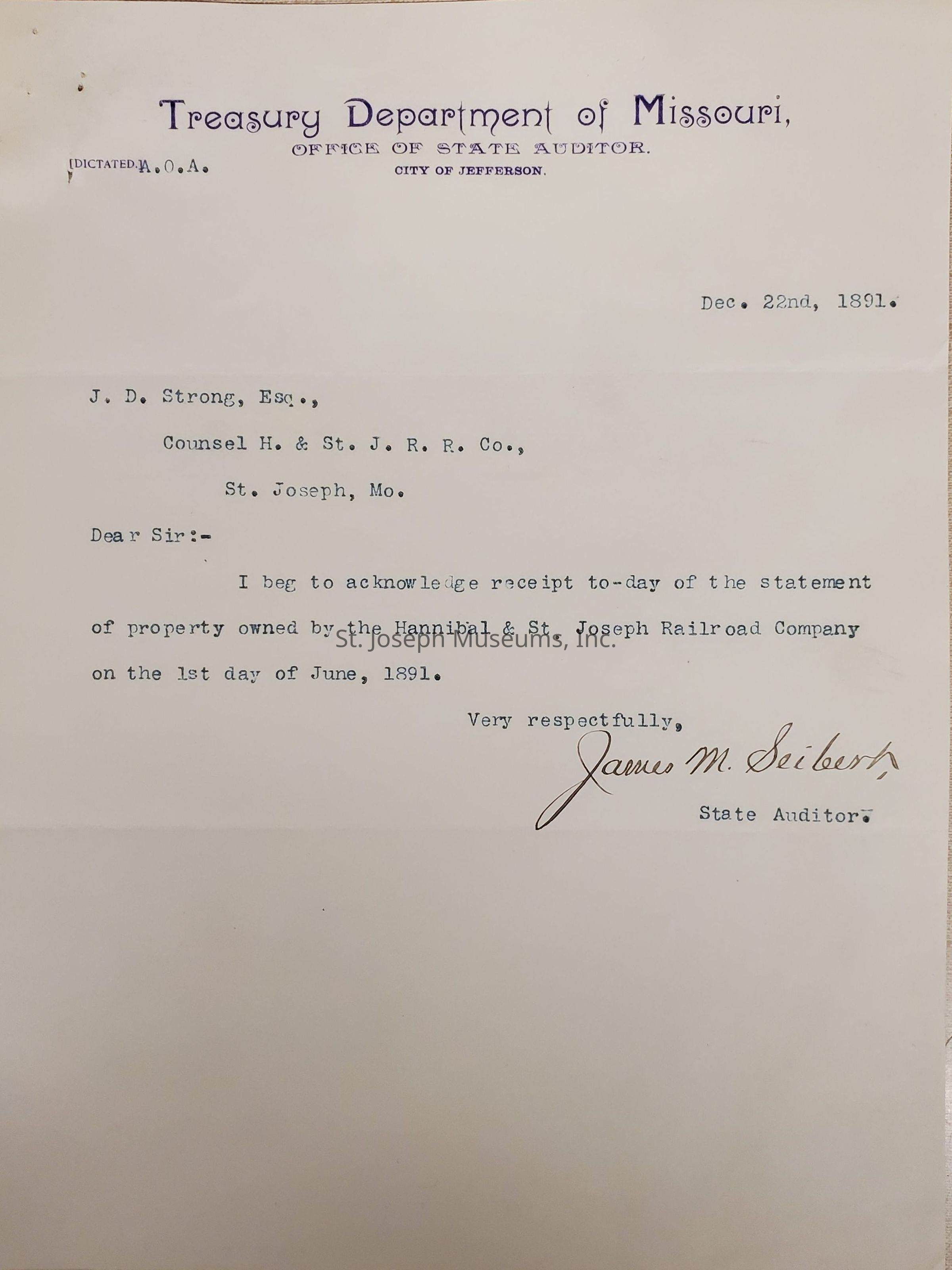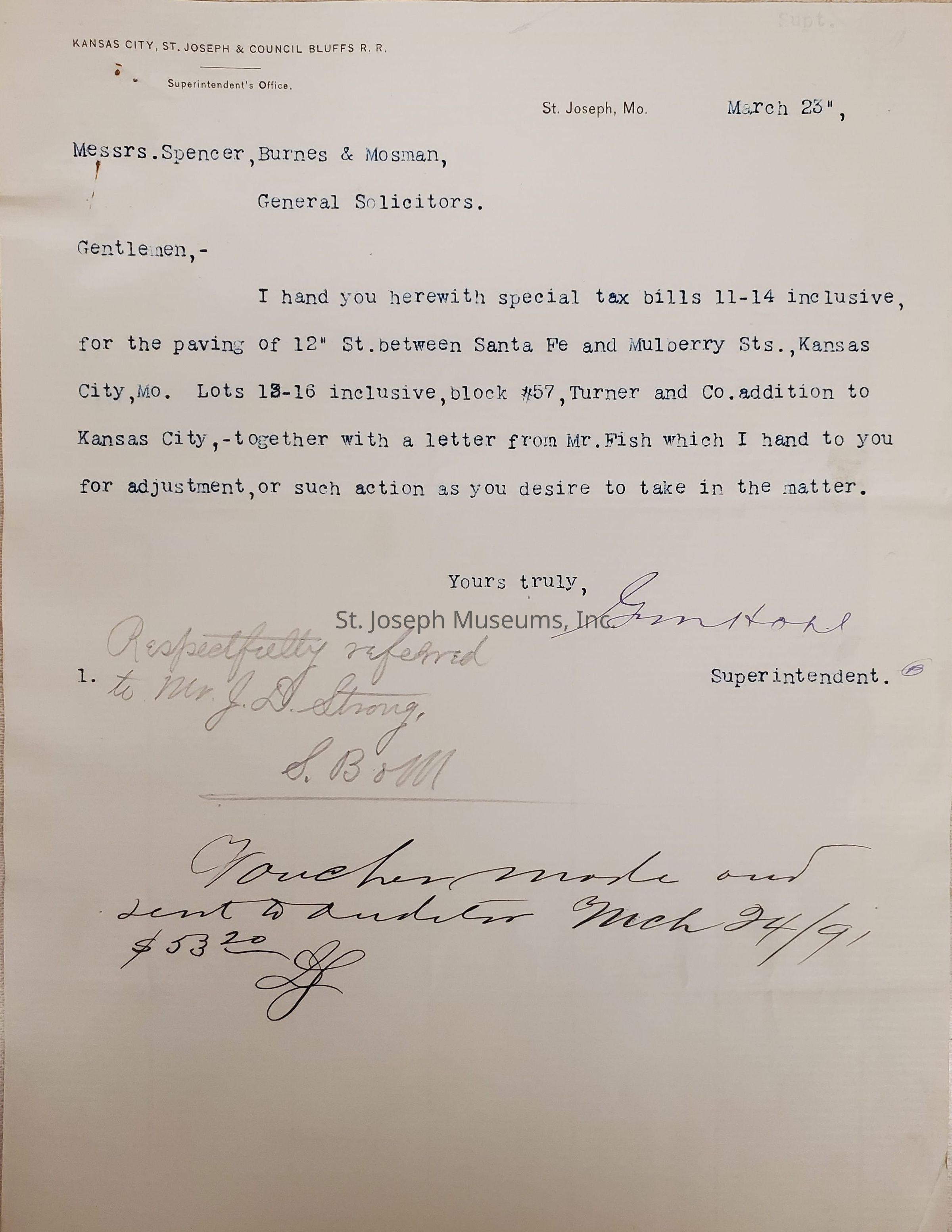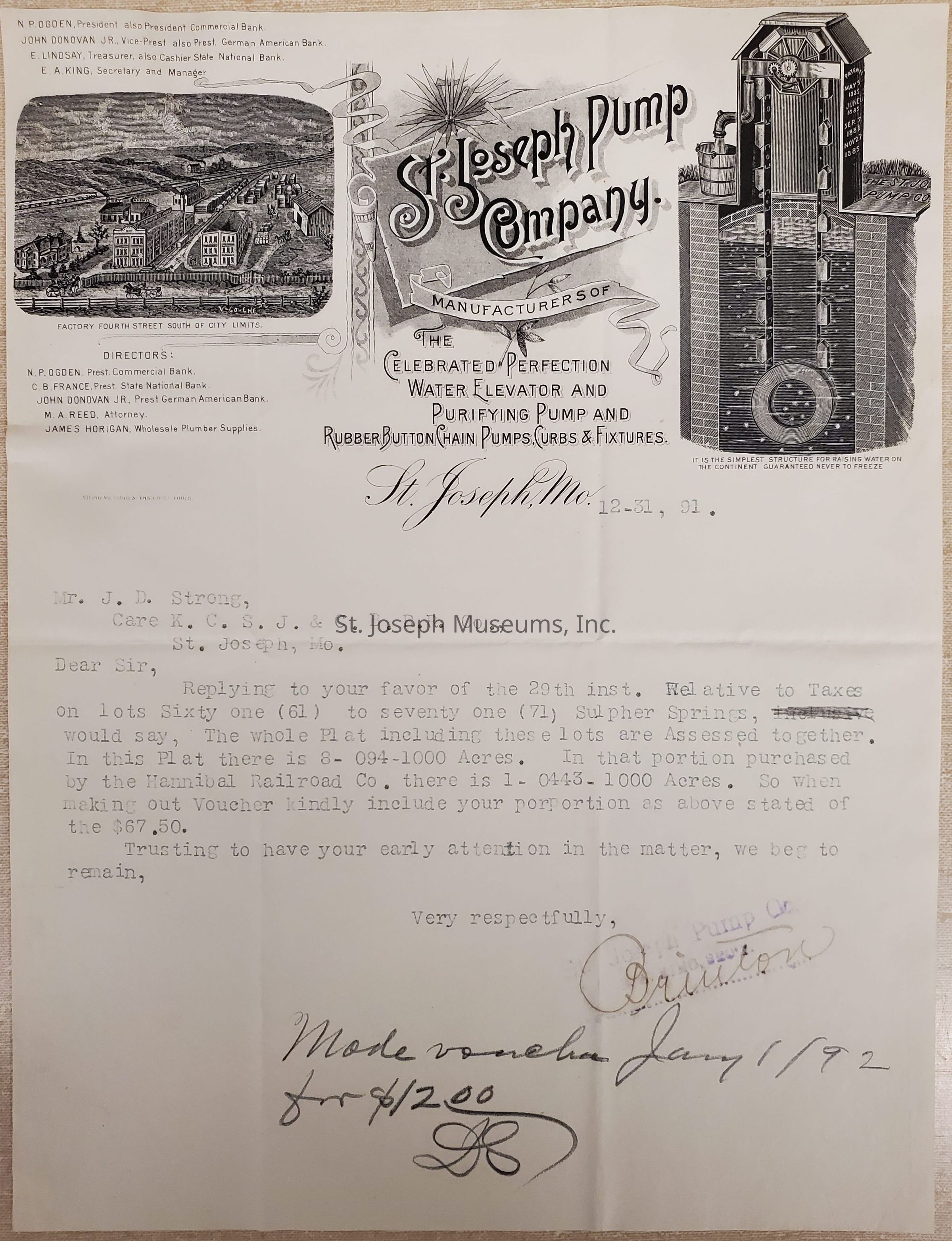 J. D. Strong was an attorney in St. Joseph. He was also a Judge, perhaps a U. S. Judge, as his cases are digested in Central Law Journal, 1880. At one time he was in the law department of the St. Joseph Kansas City and Council Bluff's Railroad. He lived on the south side of Felix Street between 13th and 14th Street. He was married to Mary E. Strong and had two sons, also lawyers, John W. and James W.