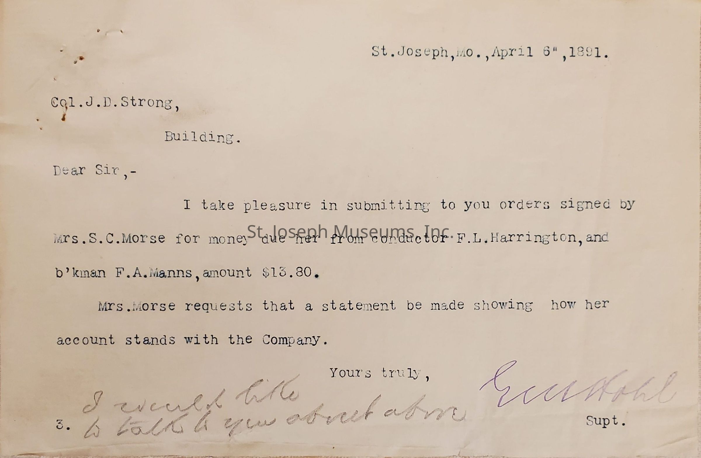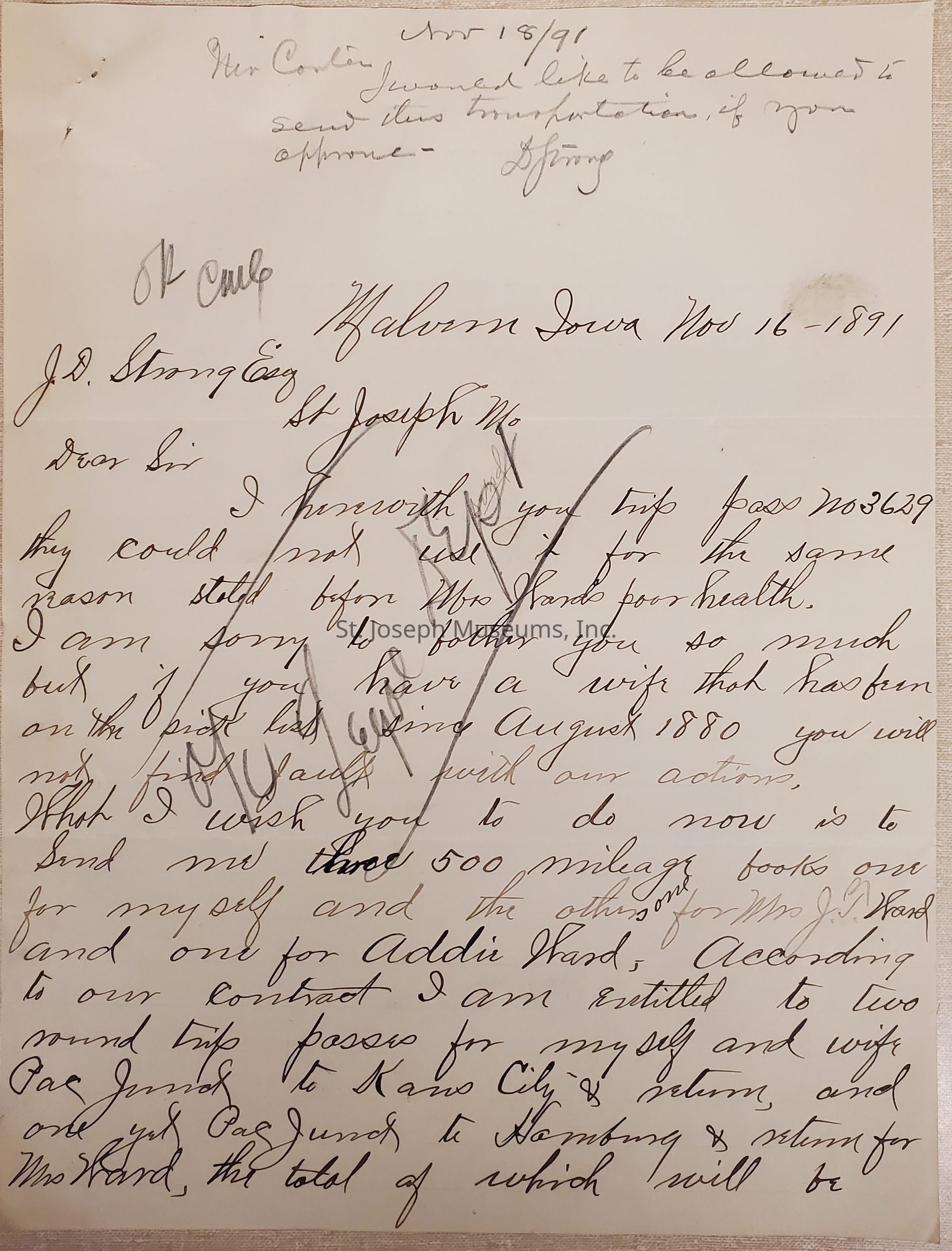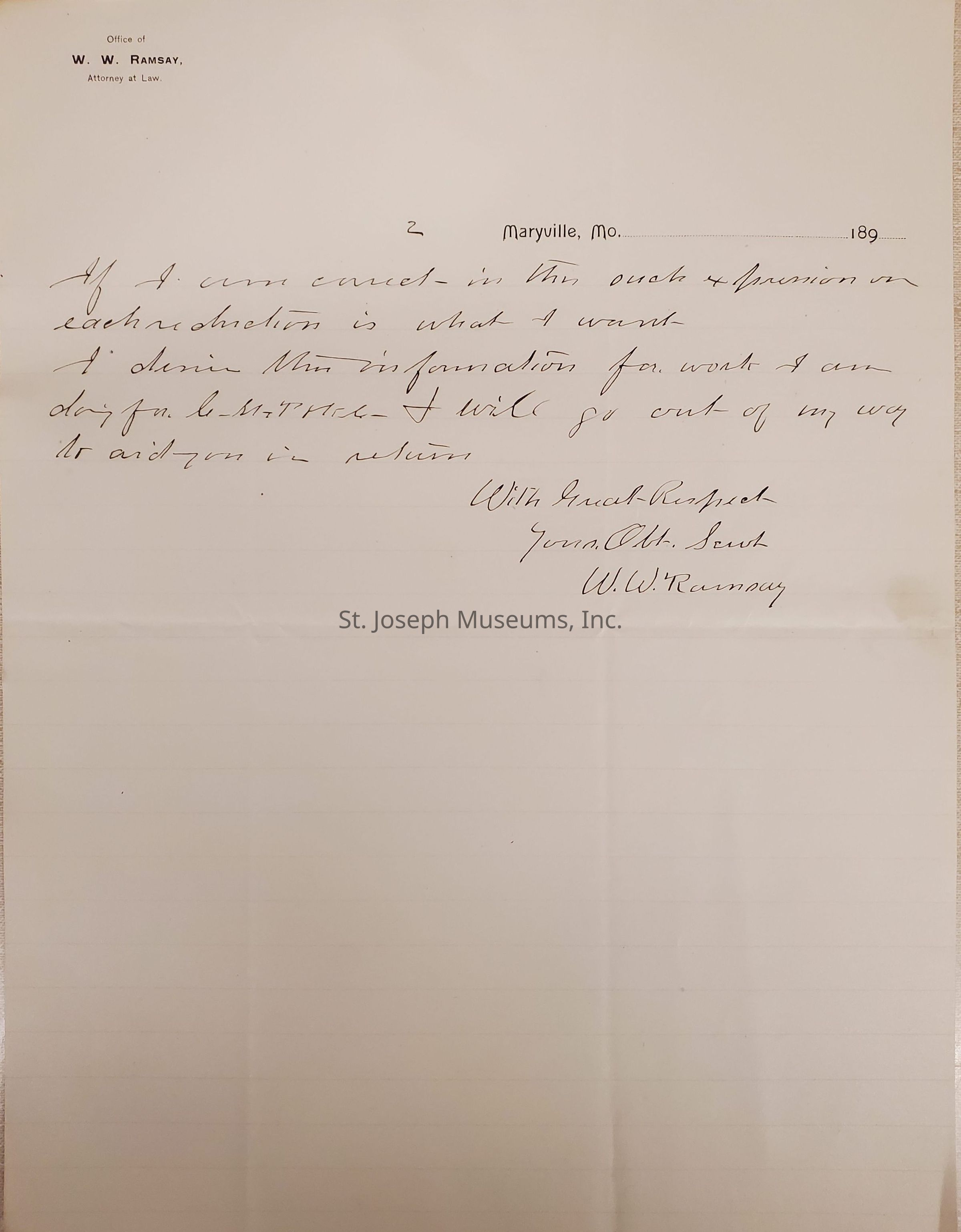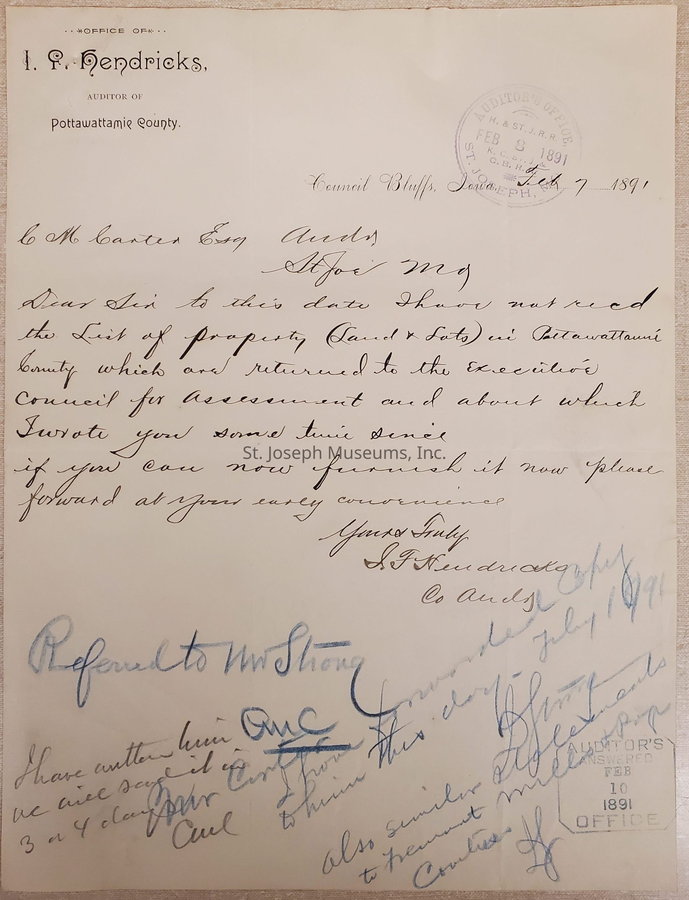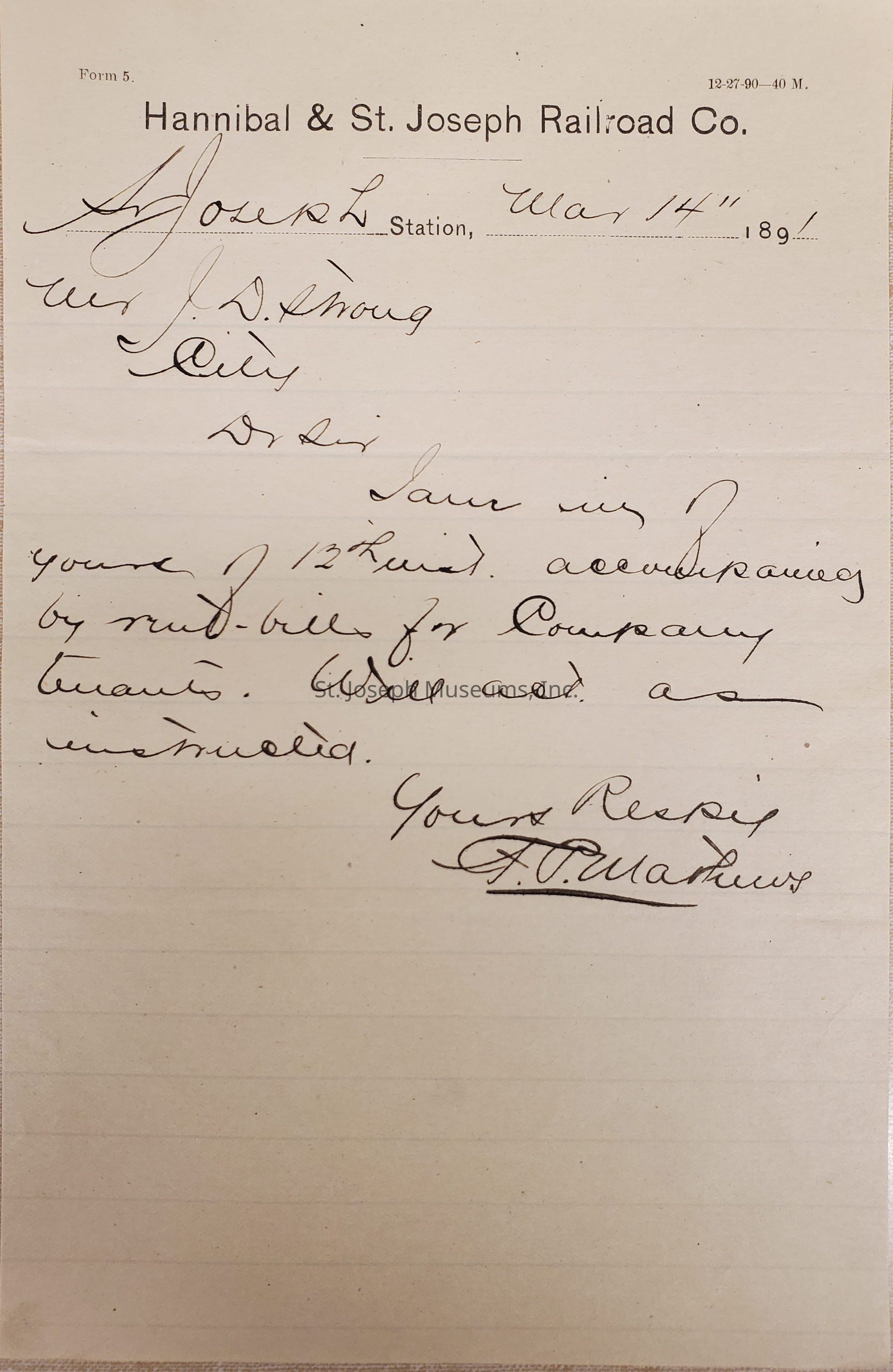 J. D. Strong was an attorney in St. Joseph. He was also a Judge, perhaps a U. S. Judge, as his cases are digested in Central Law Journal, 1880. At one time he was in the law department of the St. Joseph Kansas City and Council Bluff's Railroad. He lived on the south side of Felix Street between 13th and 14th Street. He was married to Mary E. Strong and had two sons, also lawyers, John W. and James W.