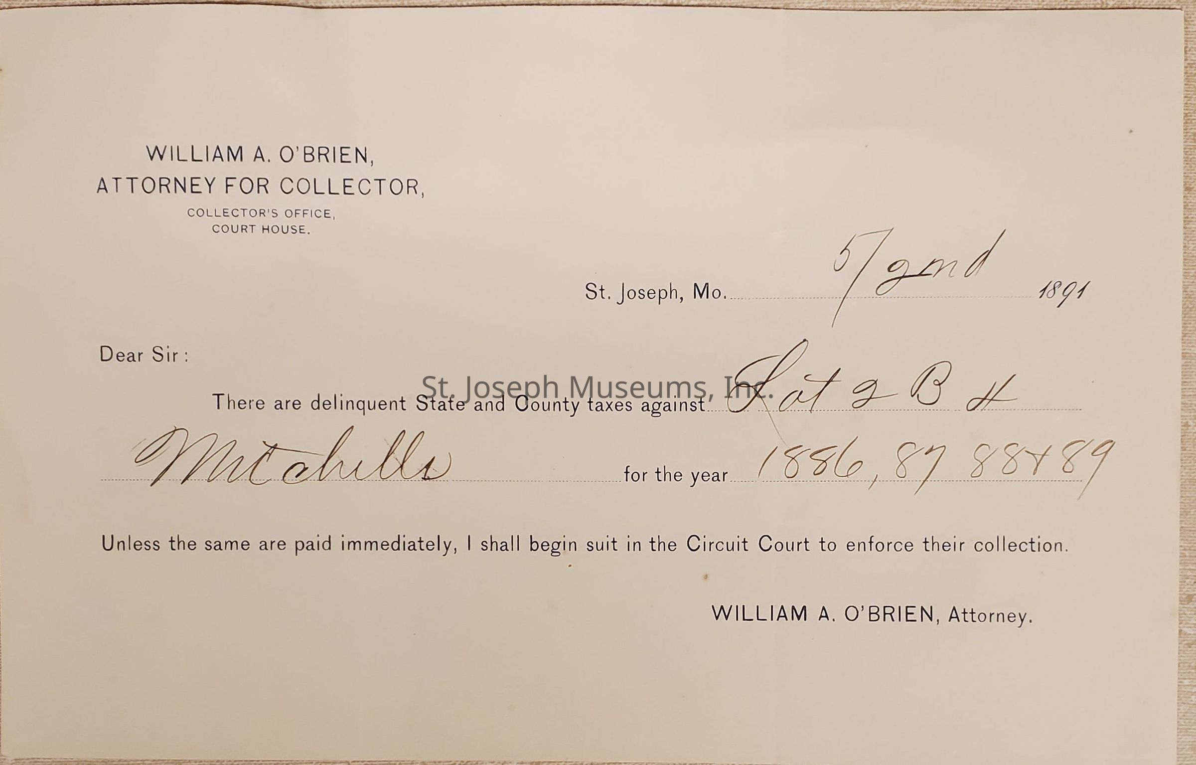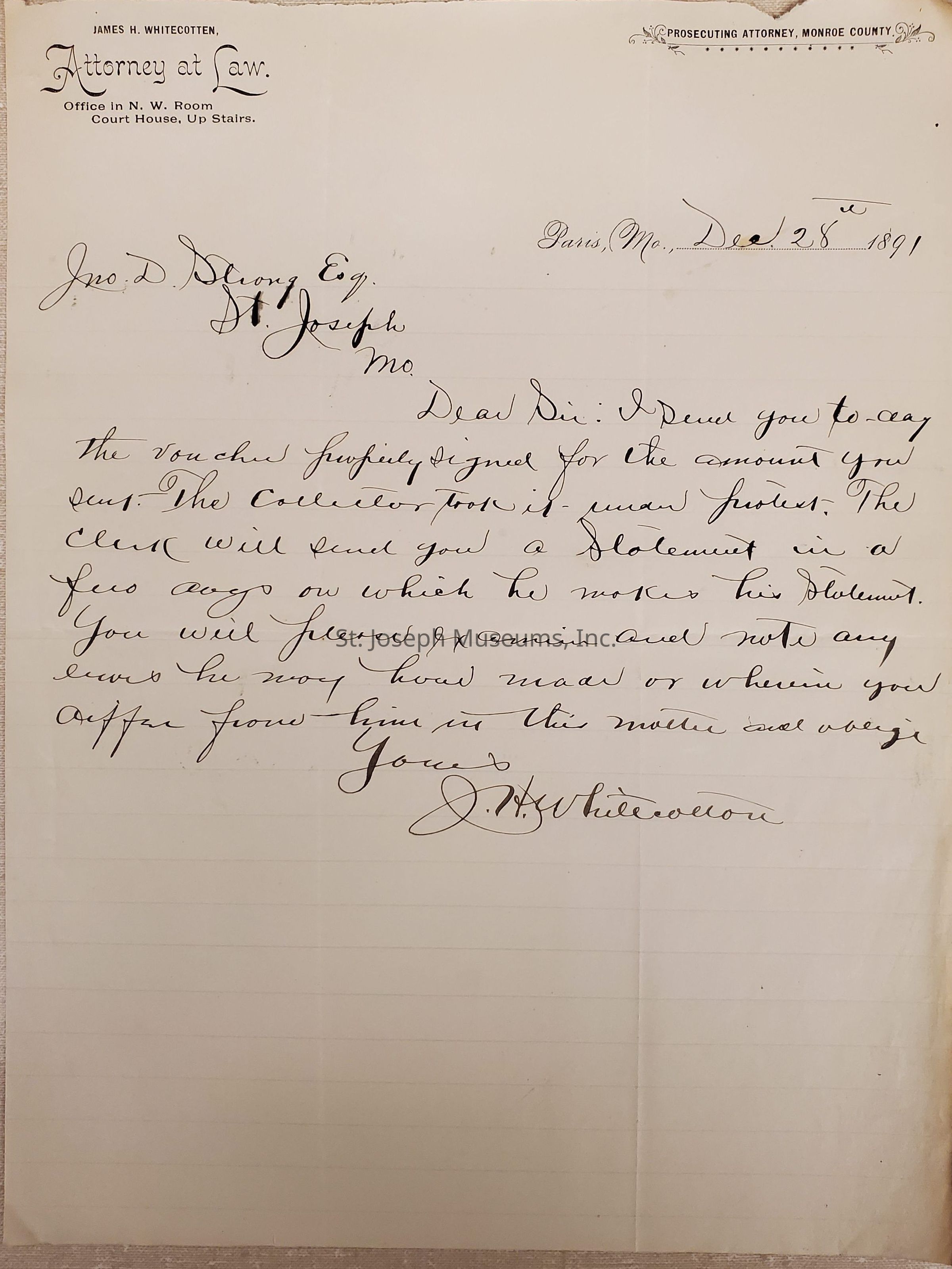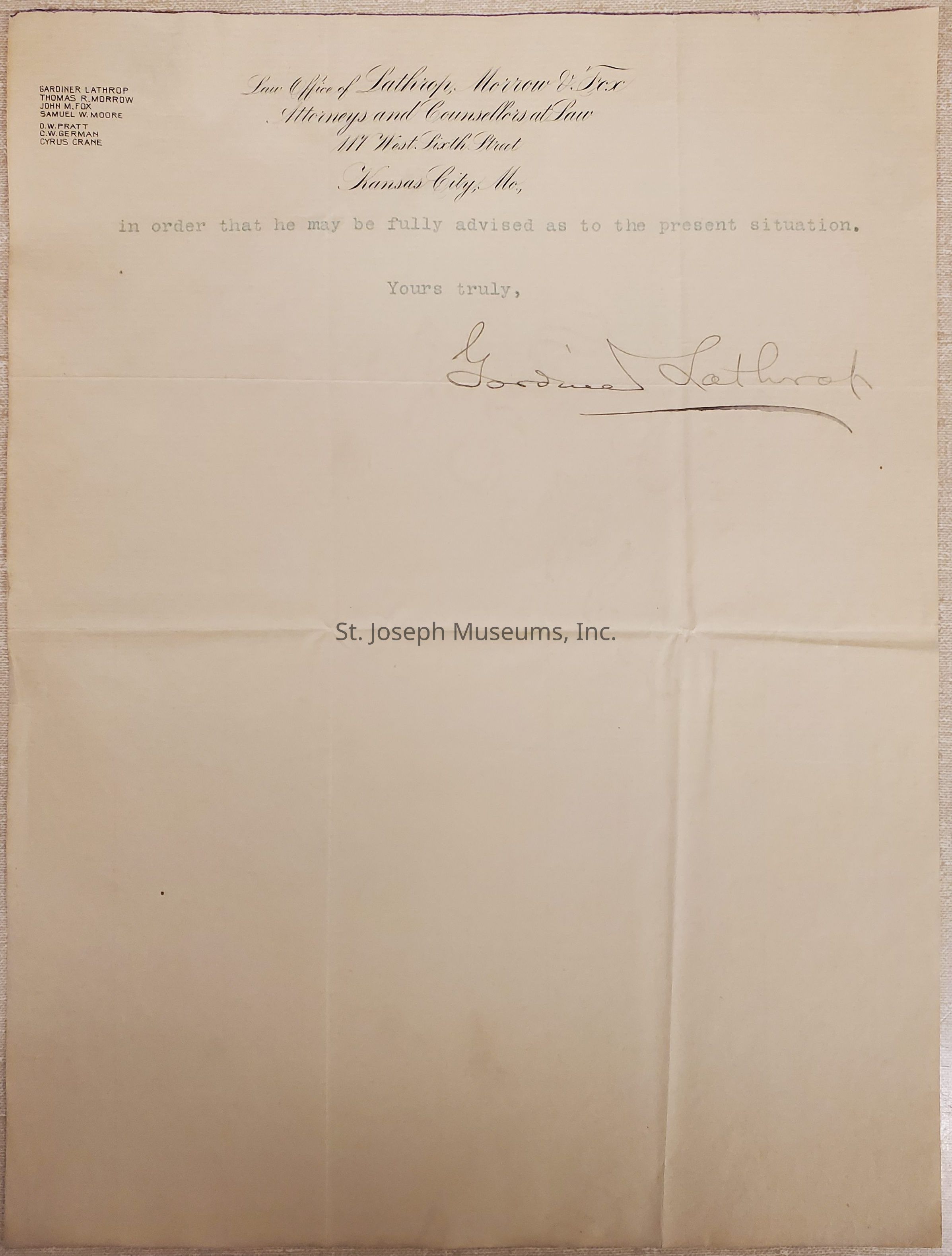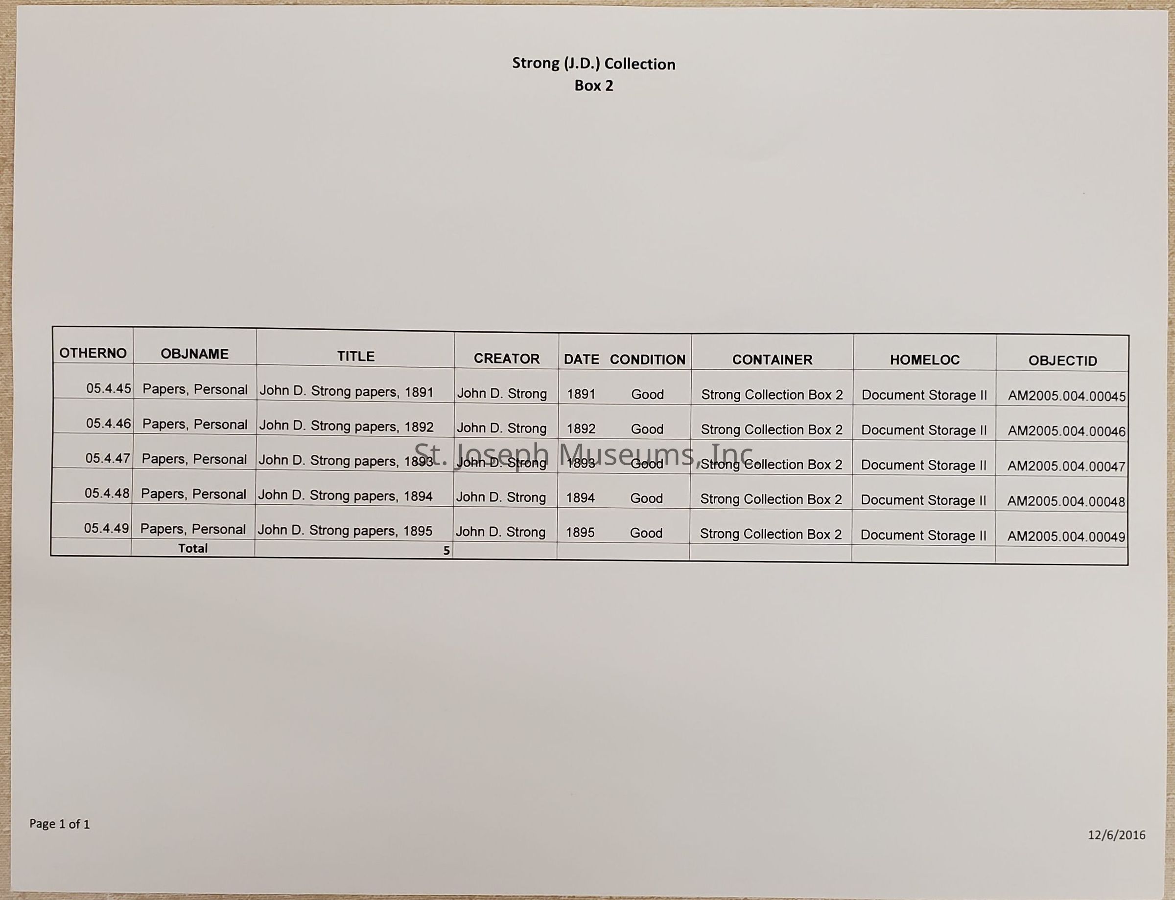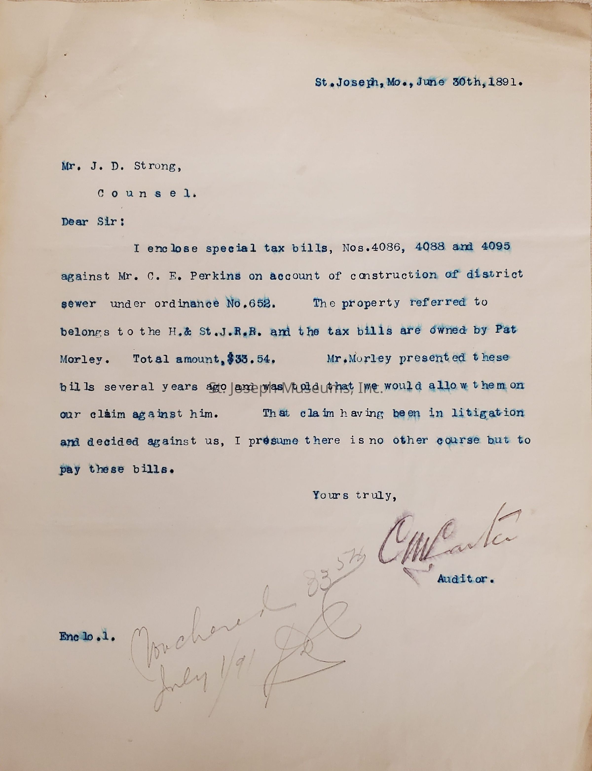 J. D. Strong was an attorney in St. Joseph. He was also a Judge, perhaps a U. S. Judge, as his cases are digested in Central Law Journal, 1880. At one time he was in the law department of the St. Joseph Kansas City and Council Bluff's Railroad. He lived on the south side of Felix Street between 13th and 14th Street. He was married to Mary E. Strong and had two sons, also lawyers, John W. and James W.