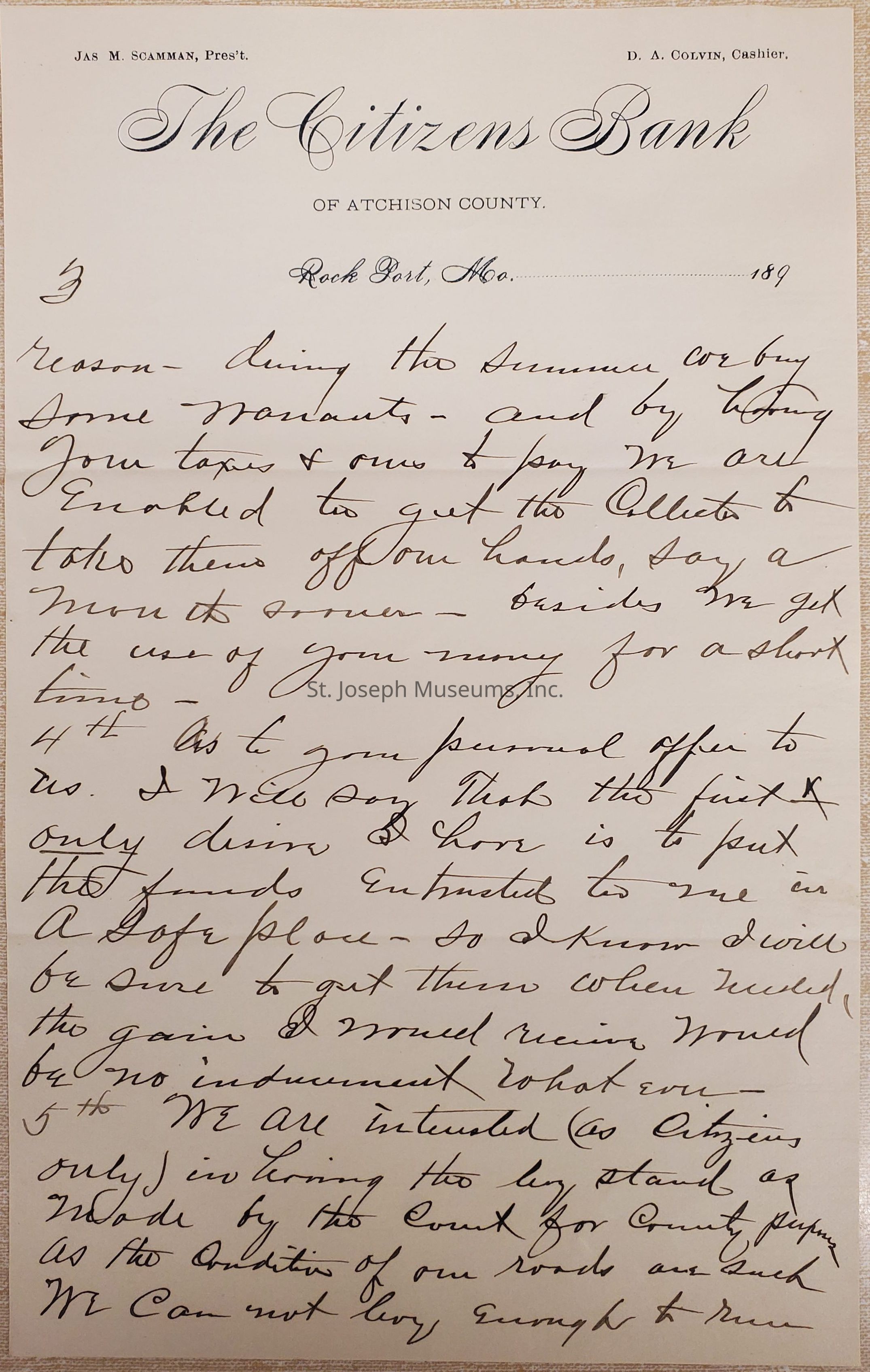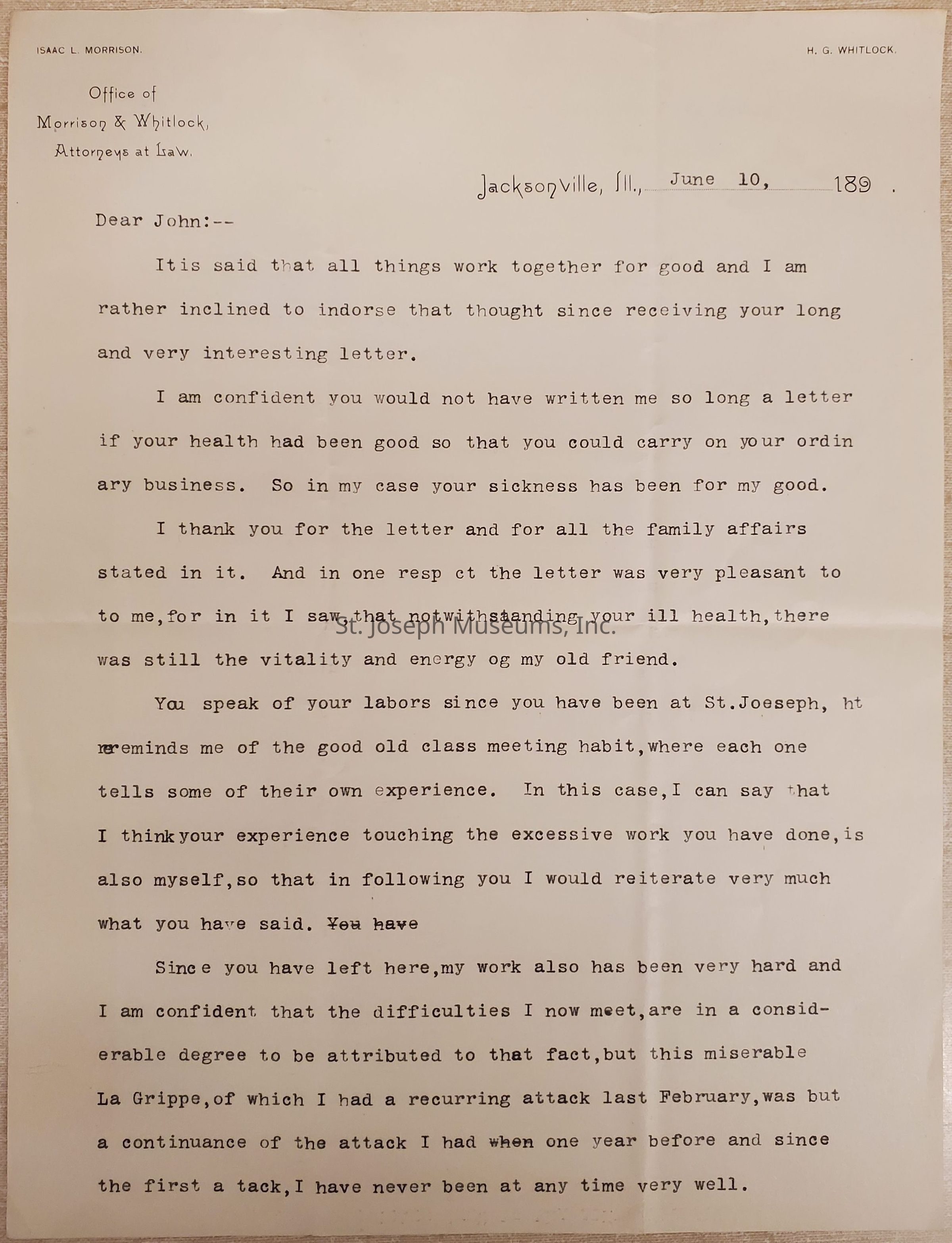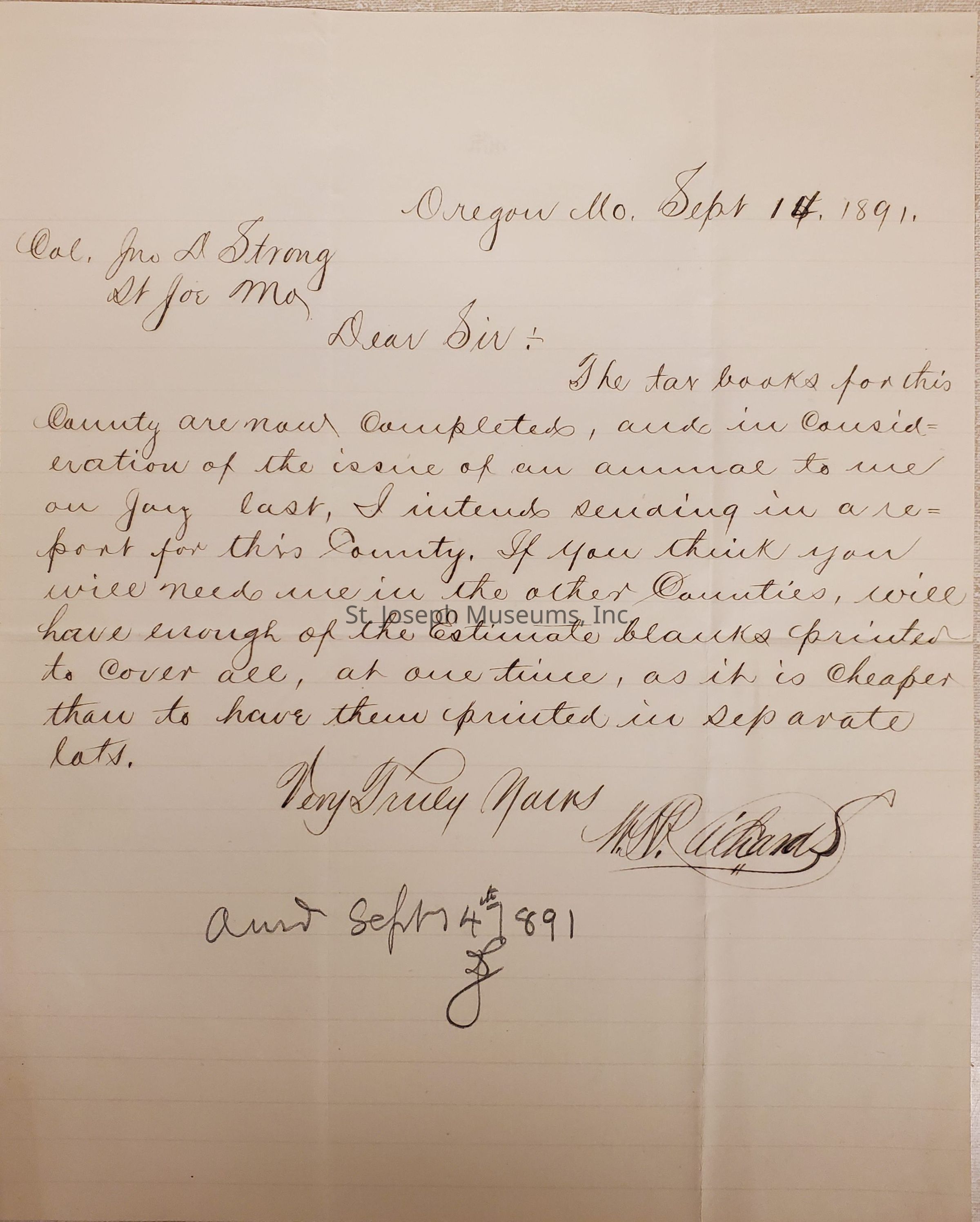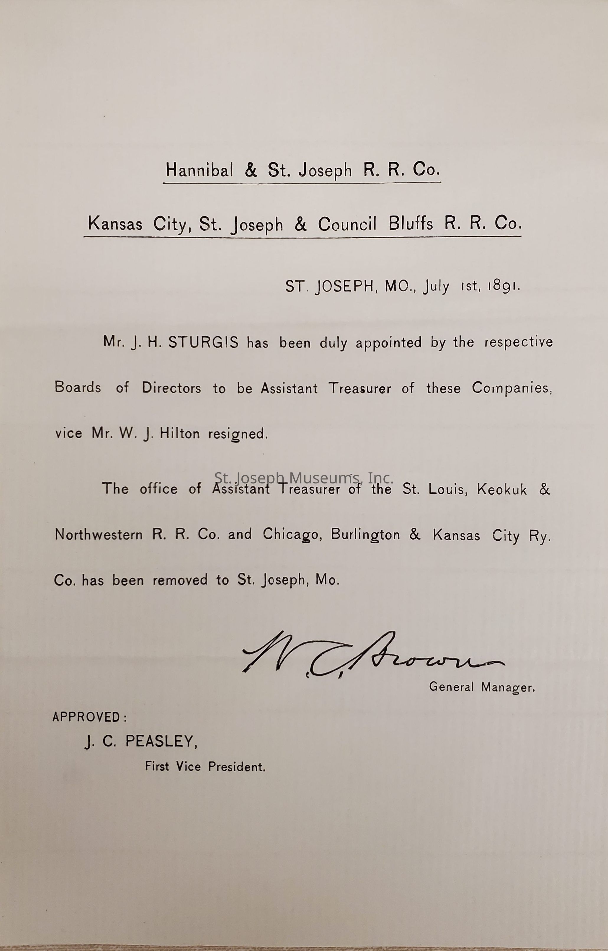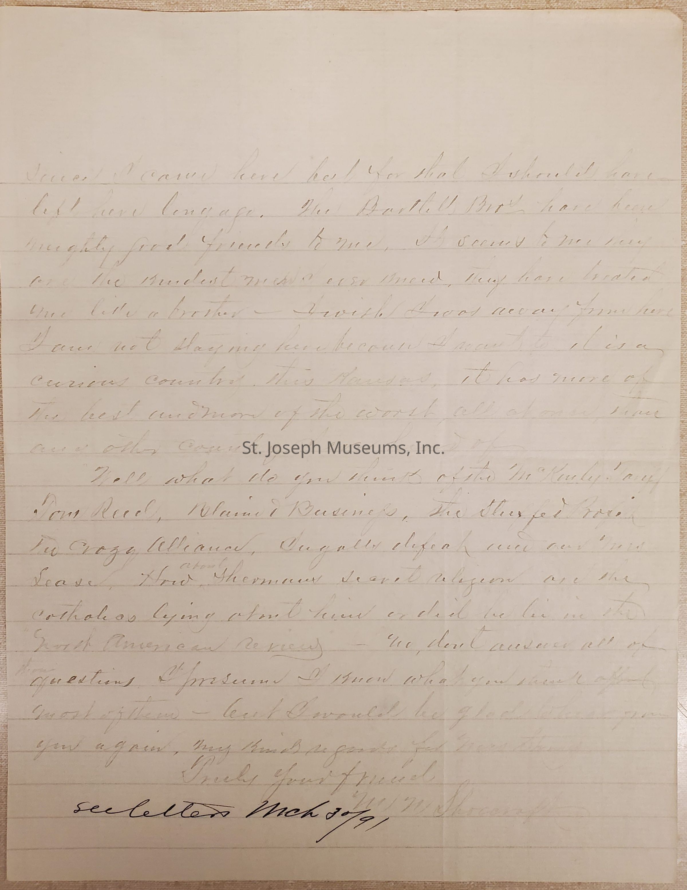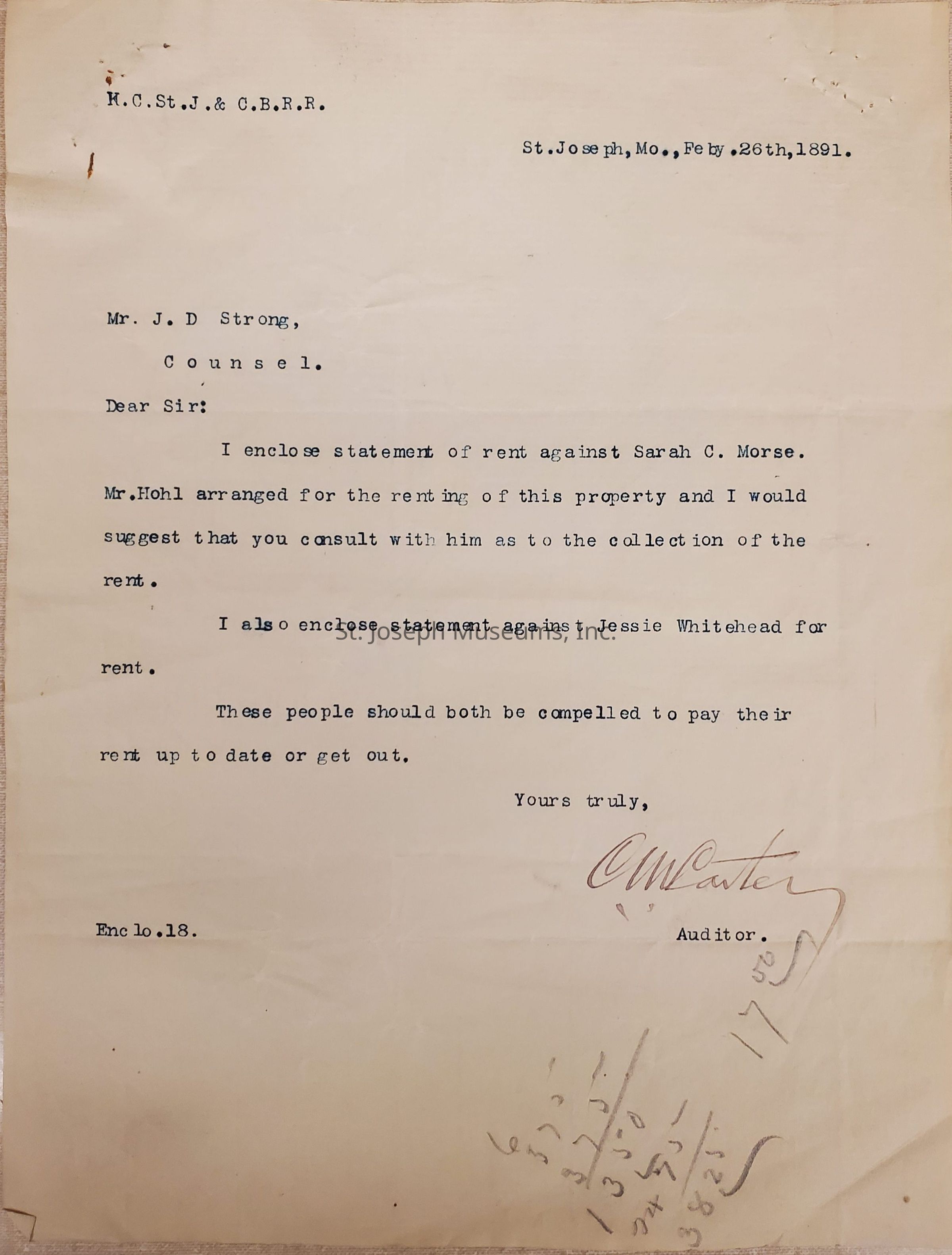 J. D. Strong was an attorney in St. Joseph. He was also a Judge, perhaps a U. S. Judge, as his cases are digested in Central Law Journal, 1880. At one time he was in the law department of the St. Joseph Kansas City and Council Bluff's Railroad. He lived on the south side of Felix Street between 13th and 14th Street. He was married to Mary E. Strong and had two sons, also lawyers, John W. and James W.