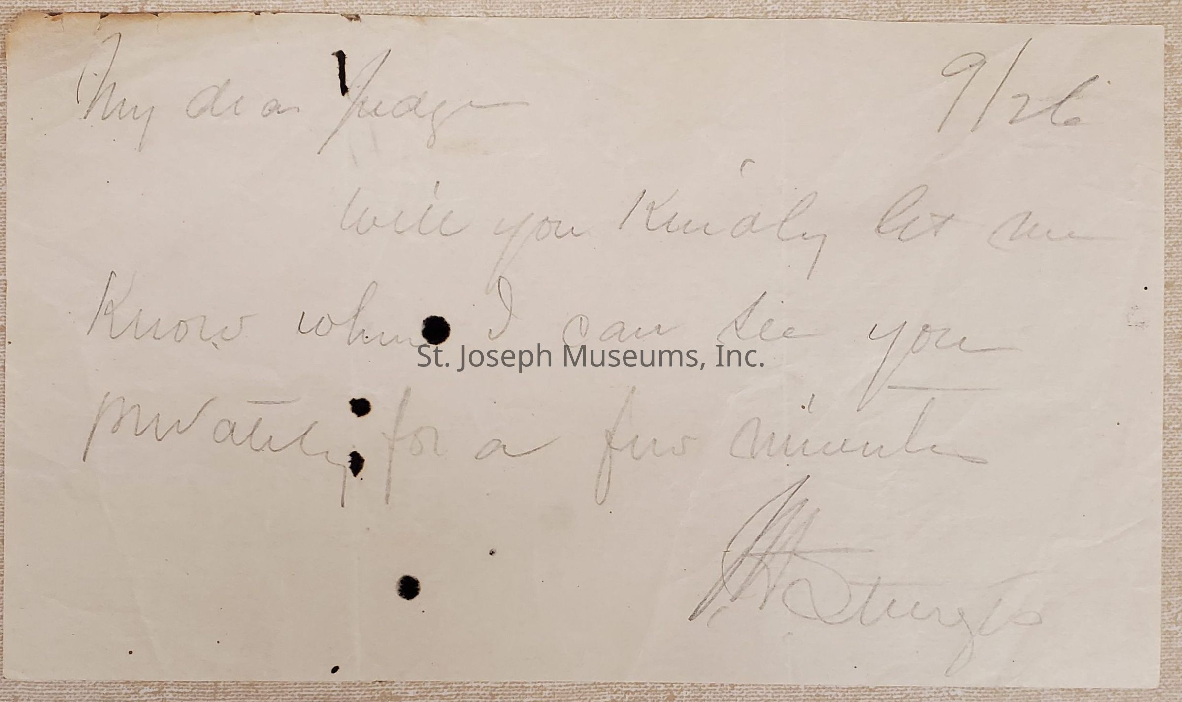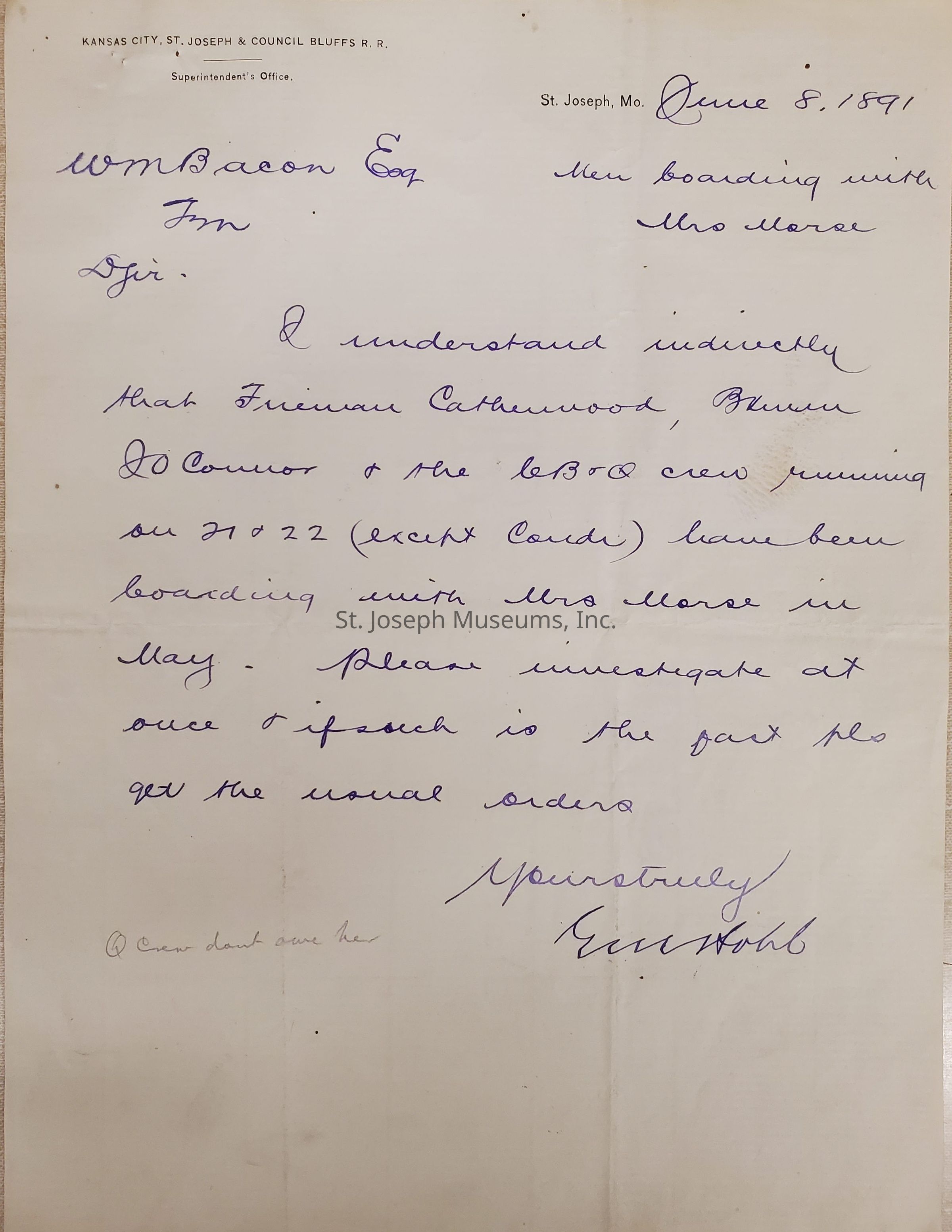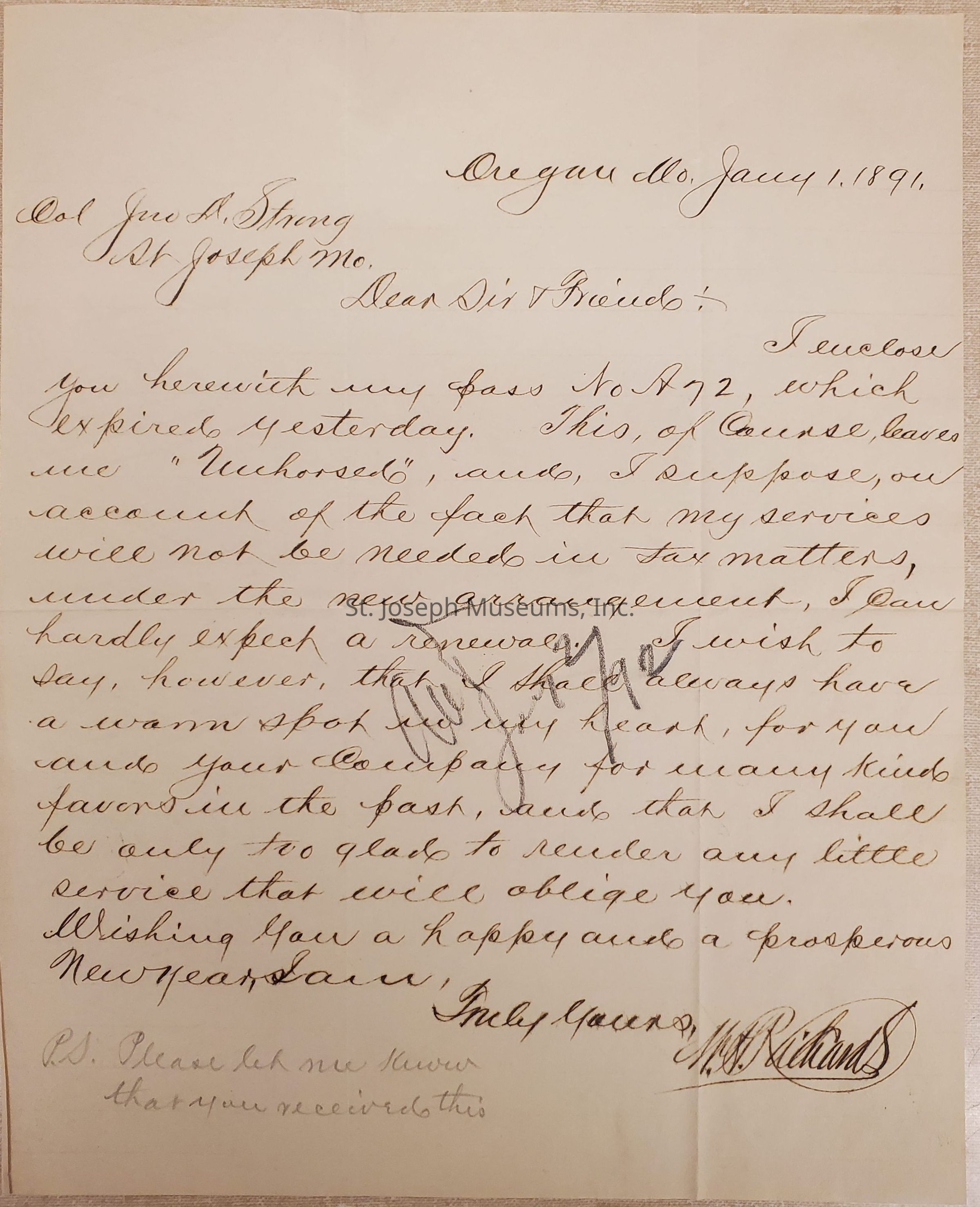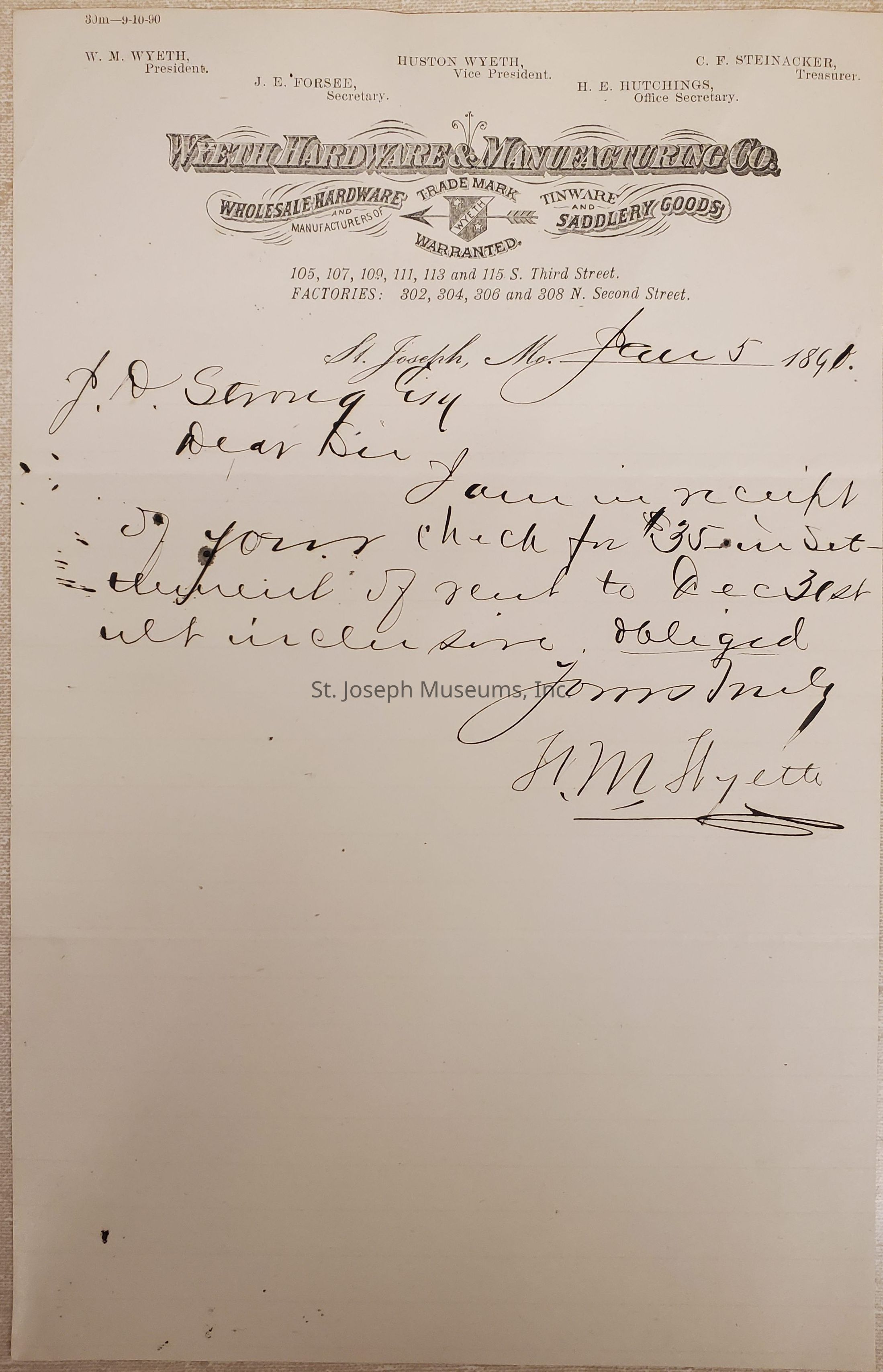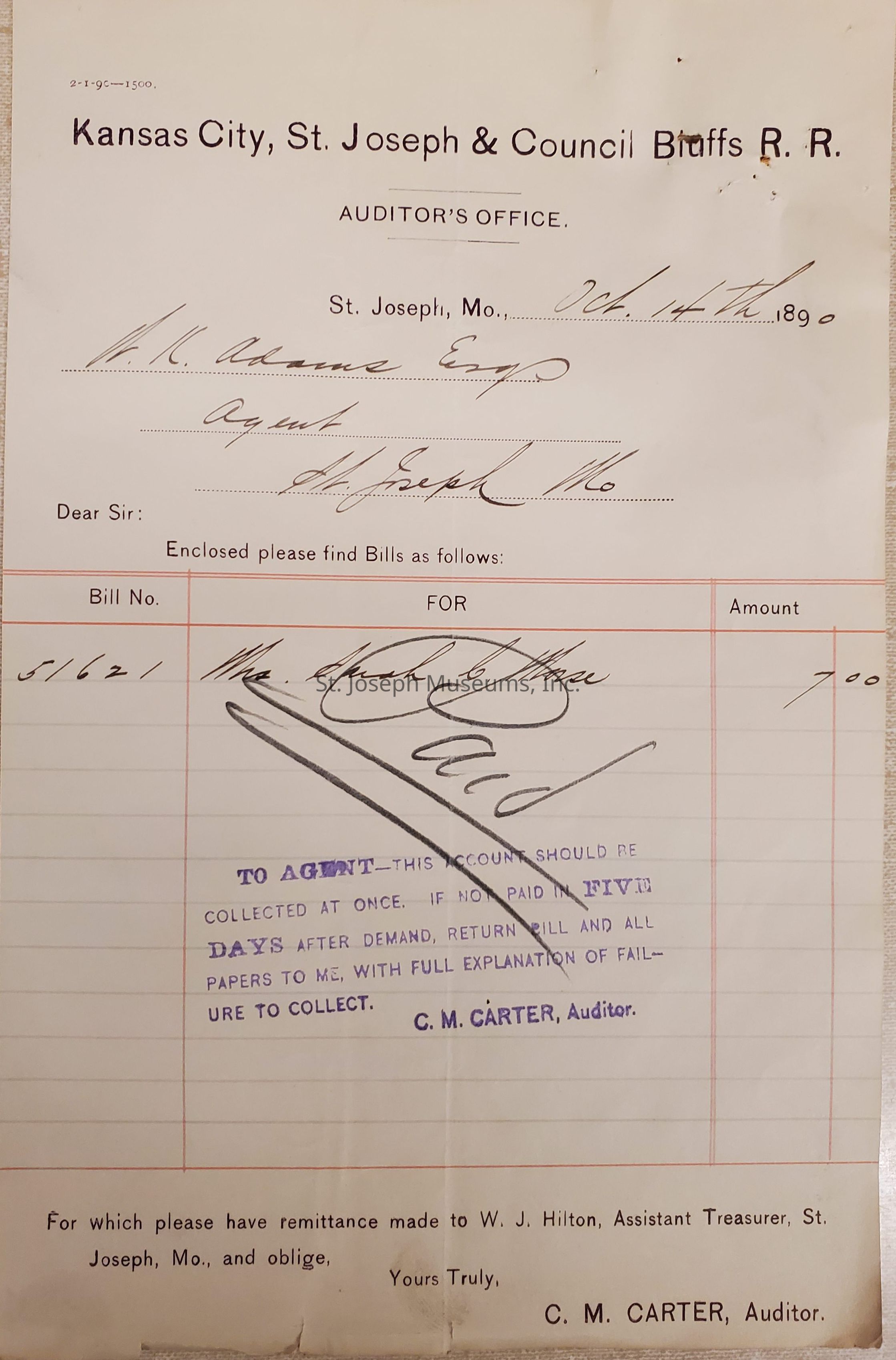 J. D. Strong was an attorney in St. Joseph. He was also a Judge, perhaps a U. S. Judge, as his cases are digested in Central Law Journal, 1880. At one time he was in the law department of the St. Joseph Kansas City and Council Bluff's Railroad. He lived on the south side of Felix Street between 13th and 14th Street. He was married to Mary E. Strong and had two sons, also lawyers, John W. and James W.