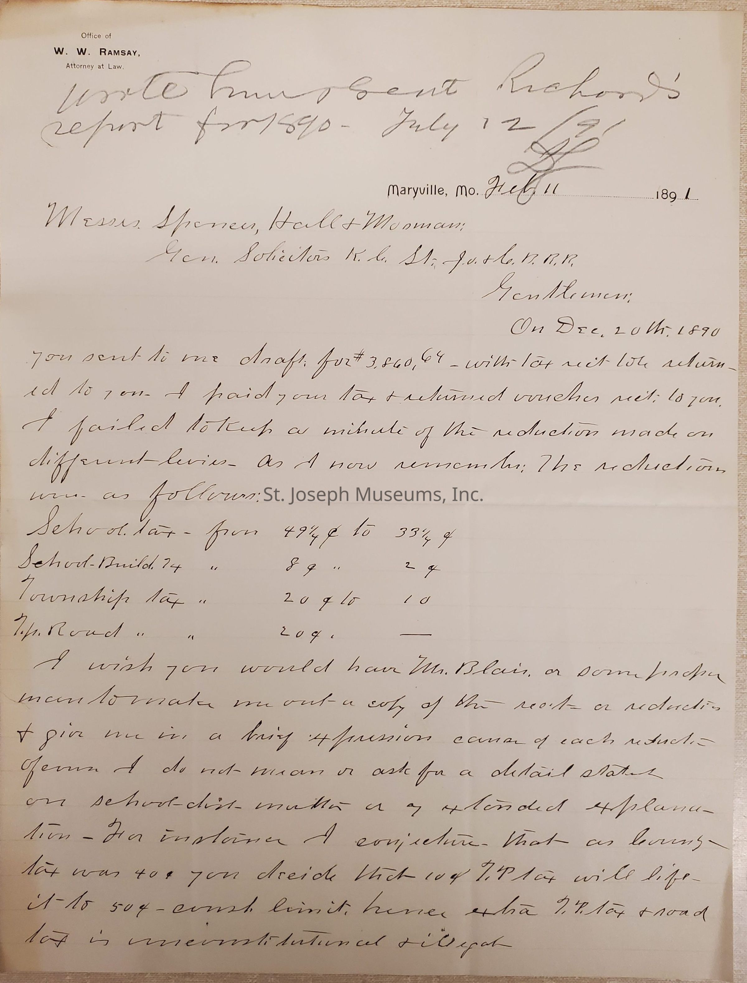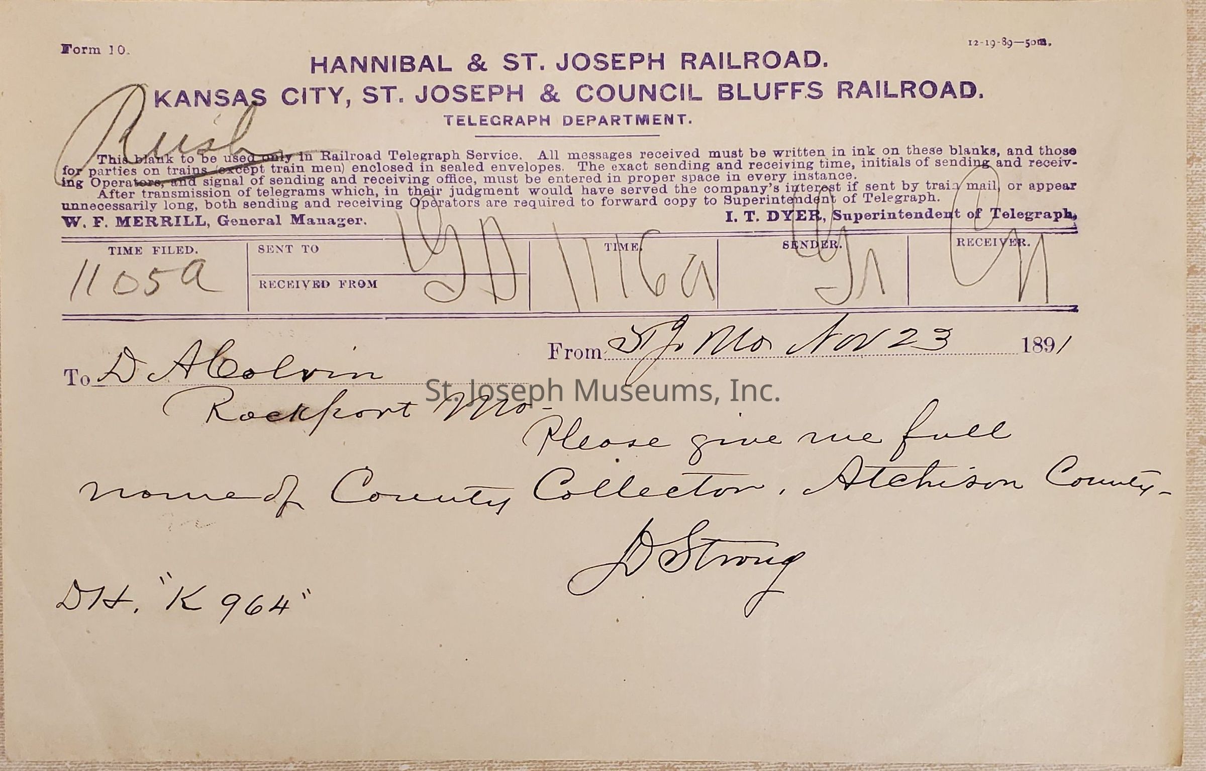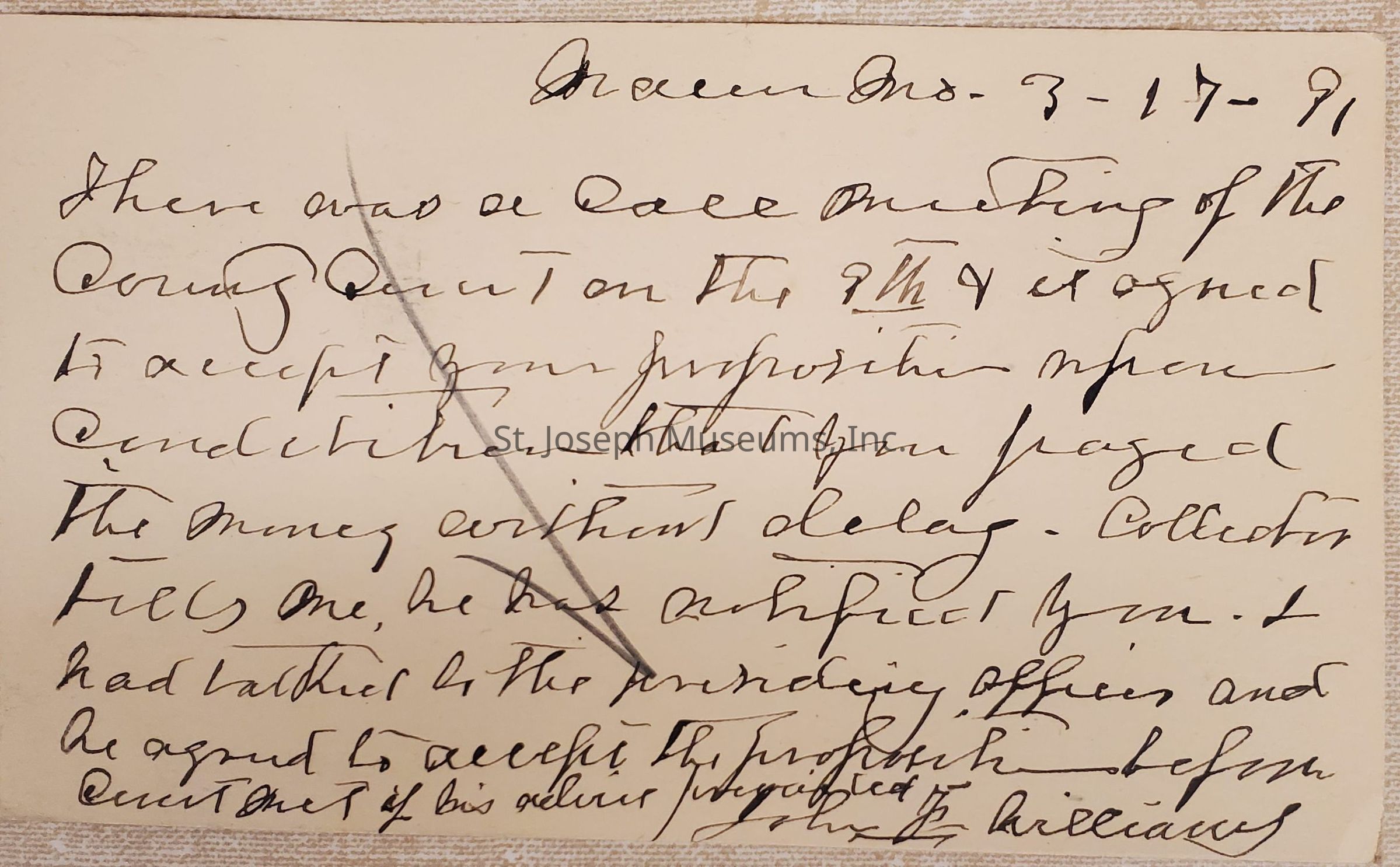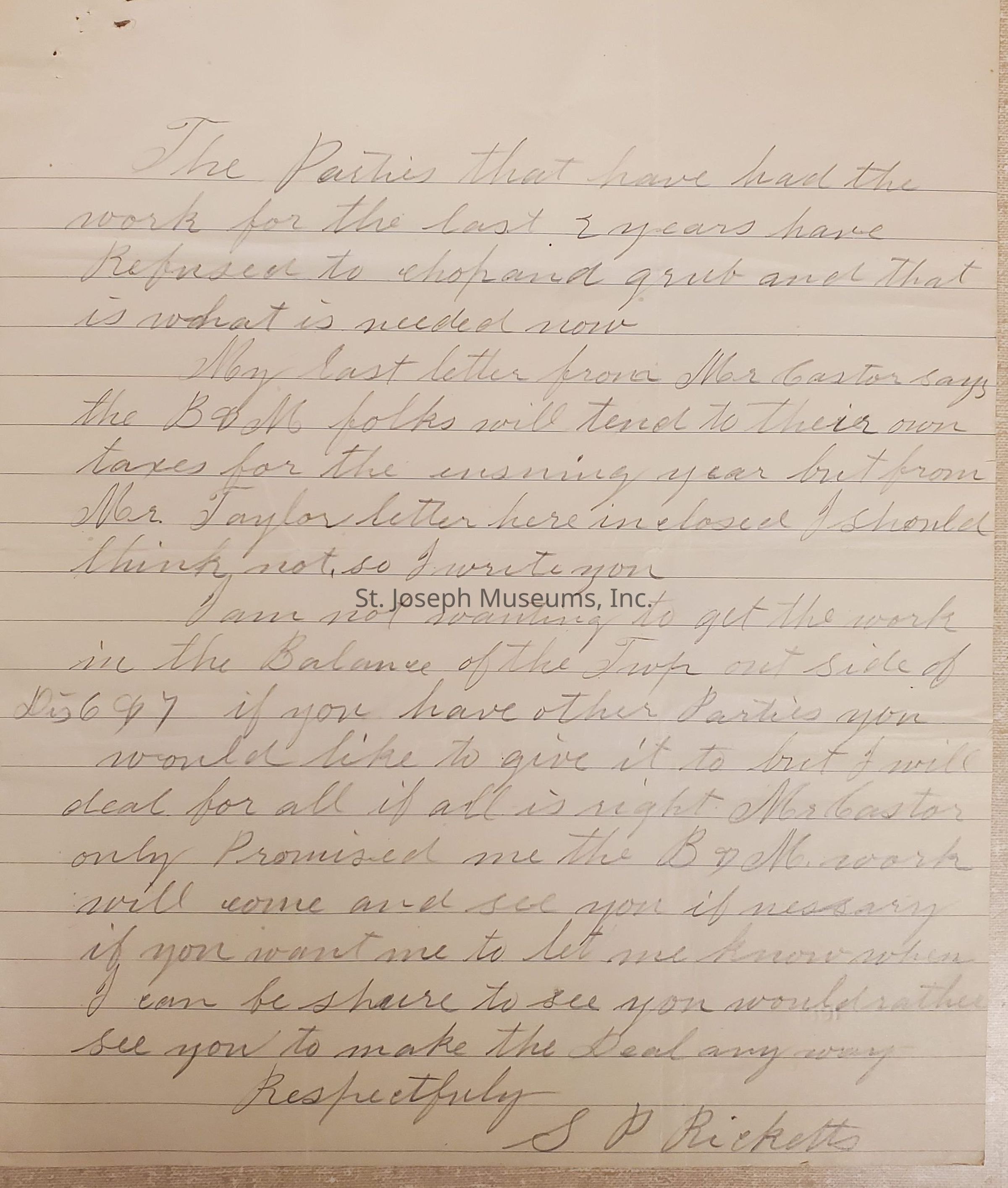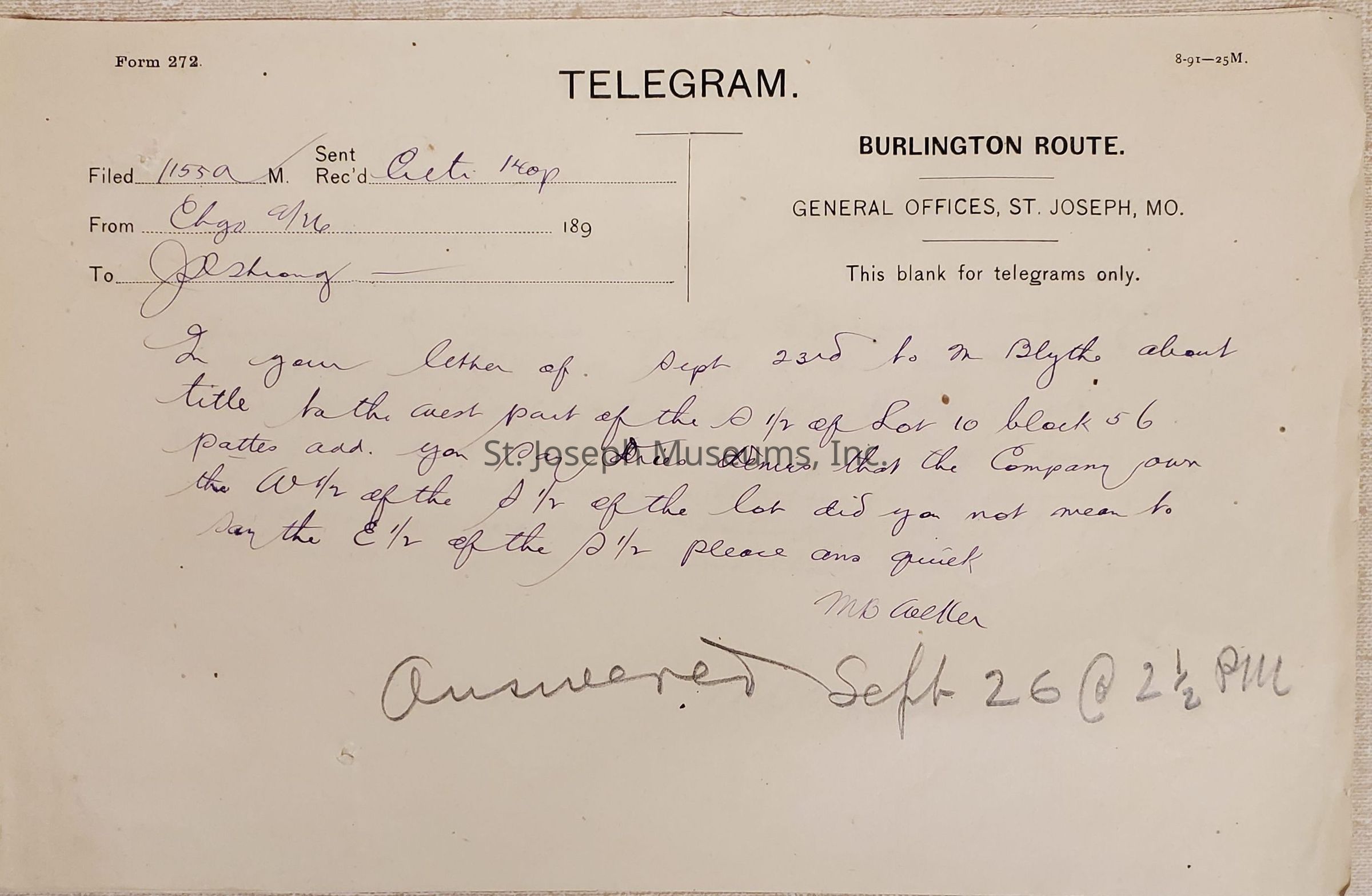 189 letters, 7 telegrams, 1 postcard, 5 Railroad items --taxes, 1 Certification of Examination of Records, 1 Tax Collector statement, 1 Article of Agreement, 1 Railroad passLexicon