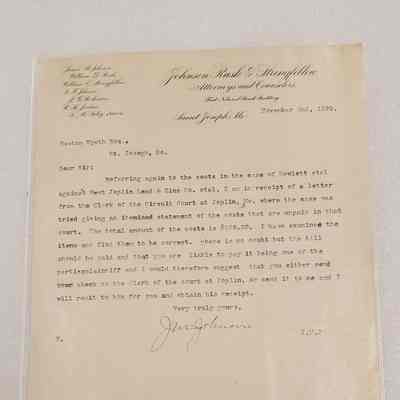 Johnson, Rusk, & Stringfellow, Attorneys Letter to Huston Wyeth Regarding Court Costs for Case against West Joplin Lead & Zinc Co., 1899Entry/Object ID