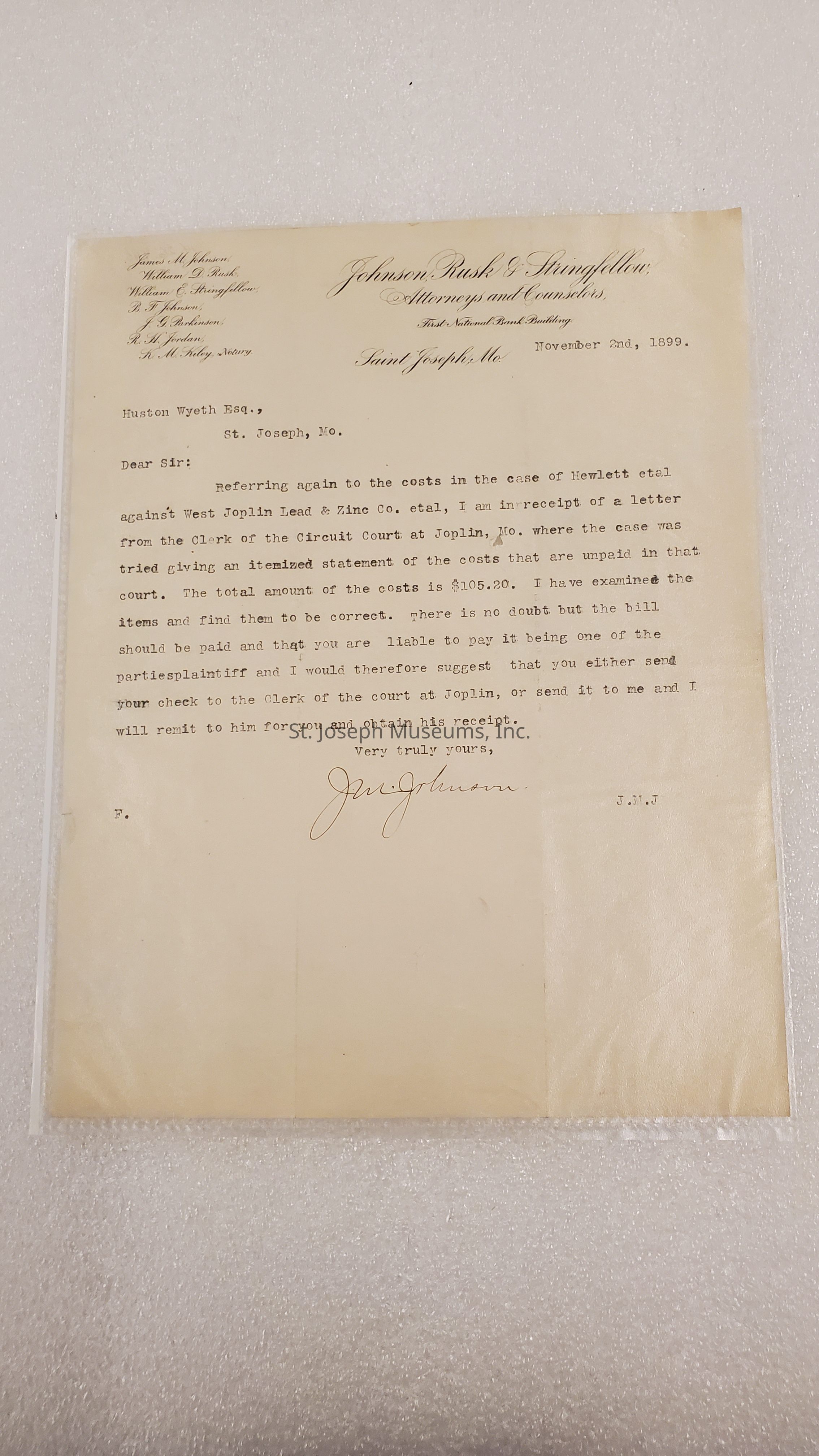 Johnson, Rusk, & Stringfellow, Attorneys Letter to Huston Wyeth Regarding Court Costs for Case against West Joplin Lead & Zinc Co., Nov. 2, 1899. J. M. Johnson is advising Wyeth to pay court costs of $105.20 as plaintiff in the case to Clerk of Circuit Court in Joplin, Mo.