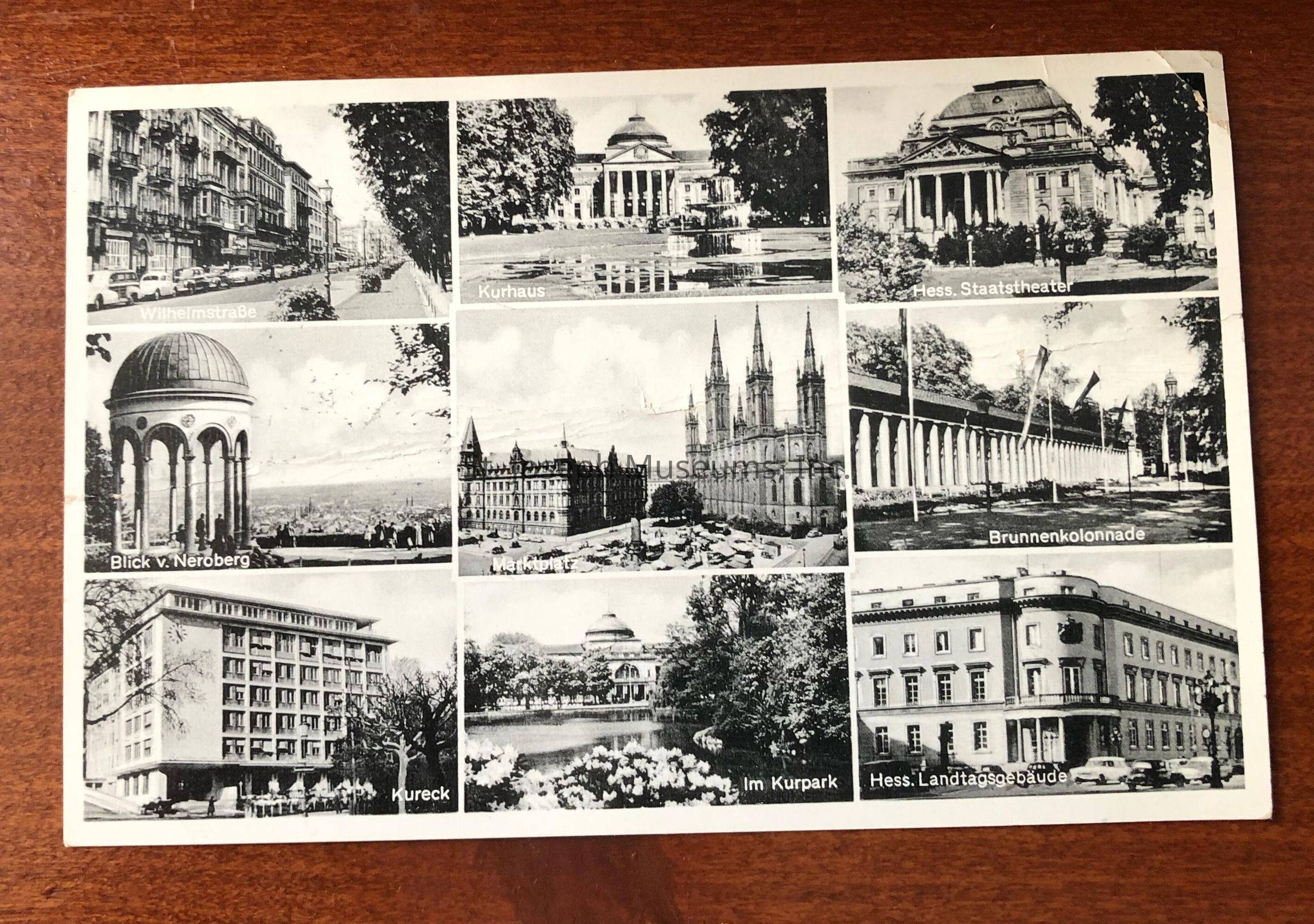 Mrs Nellie Wise Postcard of unknown date. On the front of the postcard is a handwritten address and message from "Lucile," a printed message saying "Greetings from Wiesbaden" in three languages, one ink stamp, and two physical stamps. On the back of the postcard are nine black and white photos of various buildings.