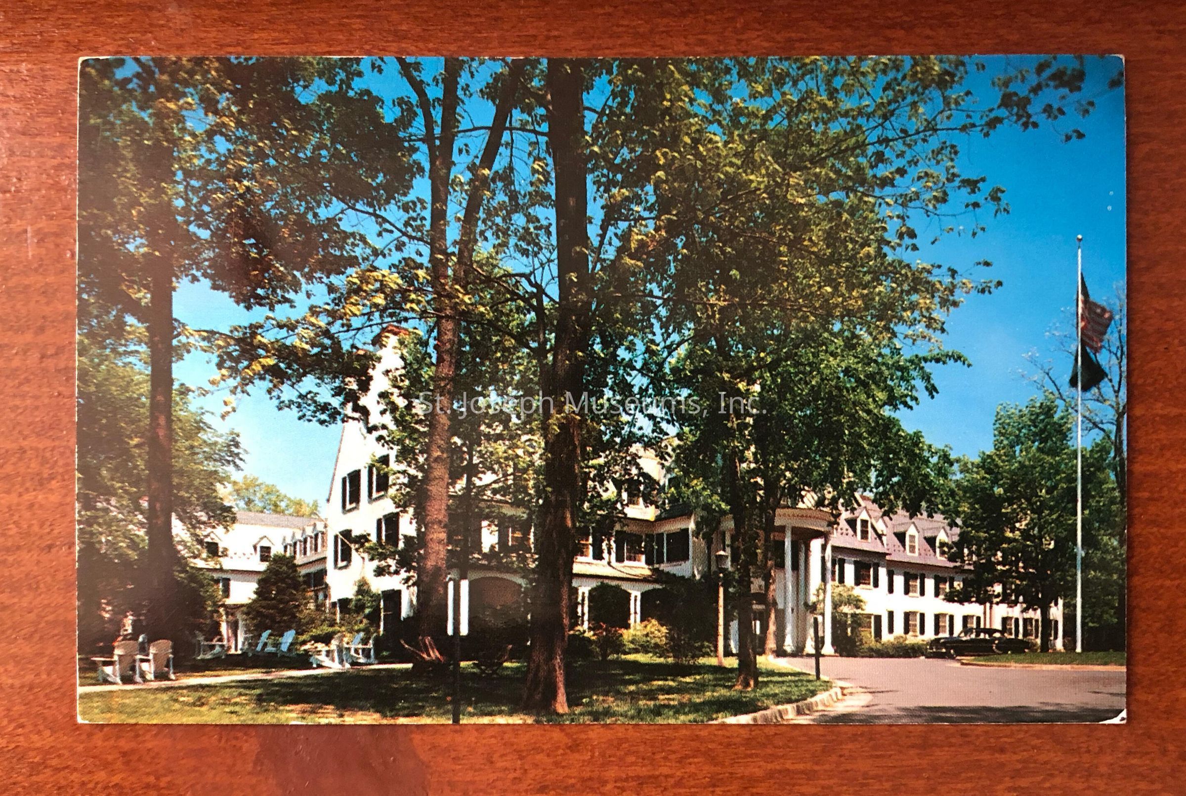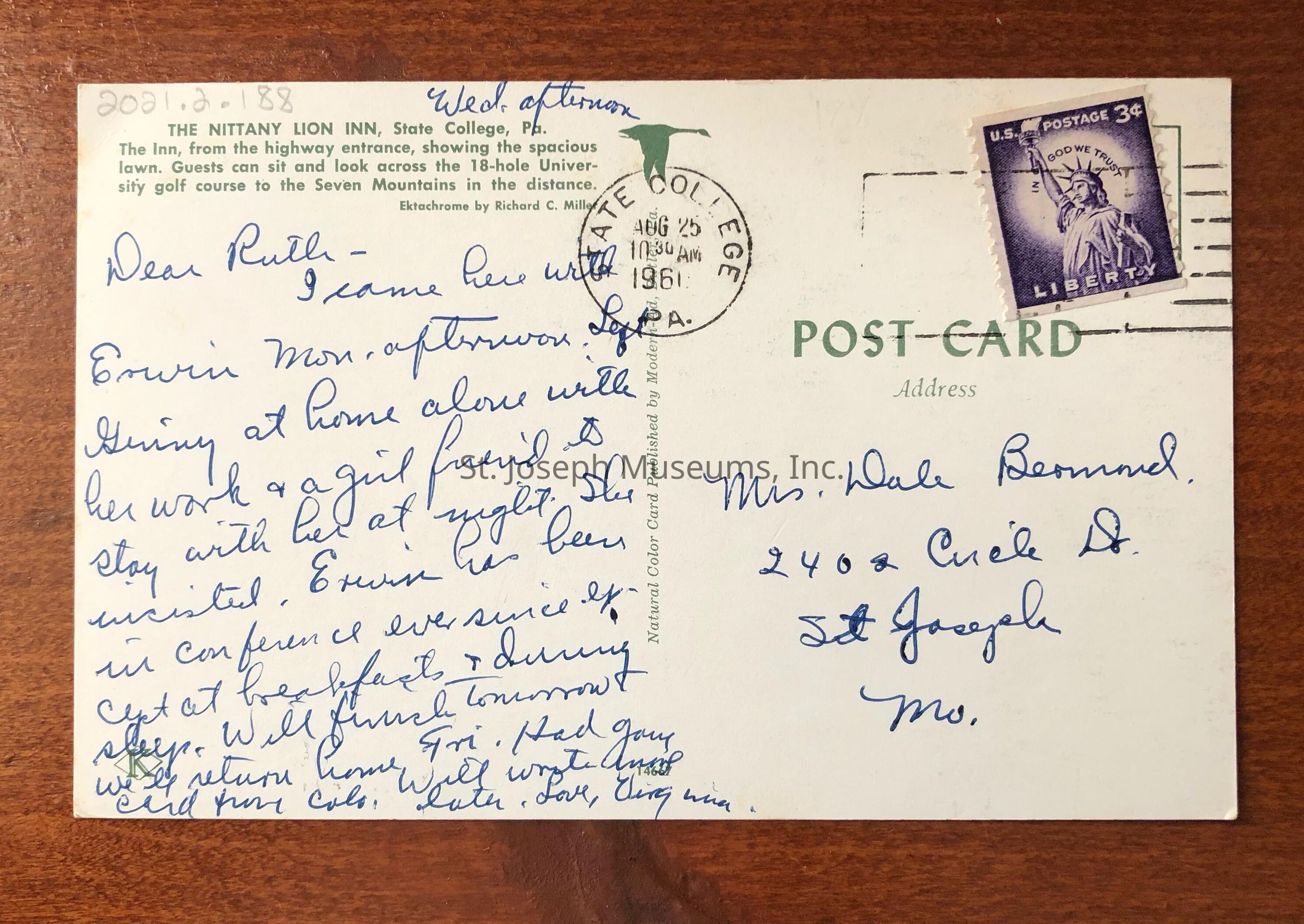 On the back of the postcard is a color image of The Nittany Lion Inn.Context
