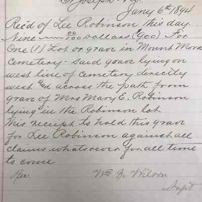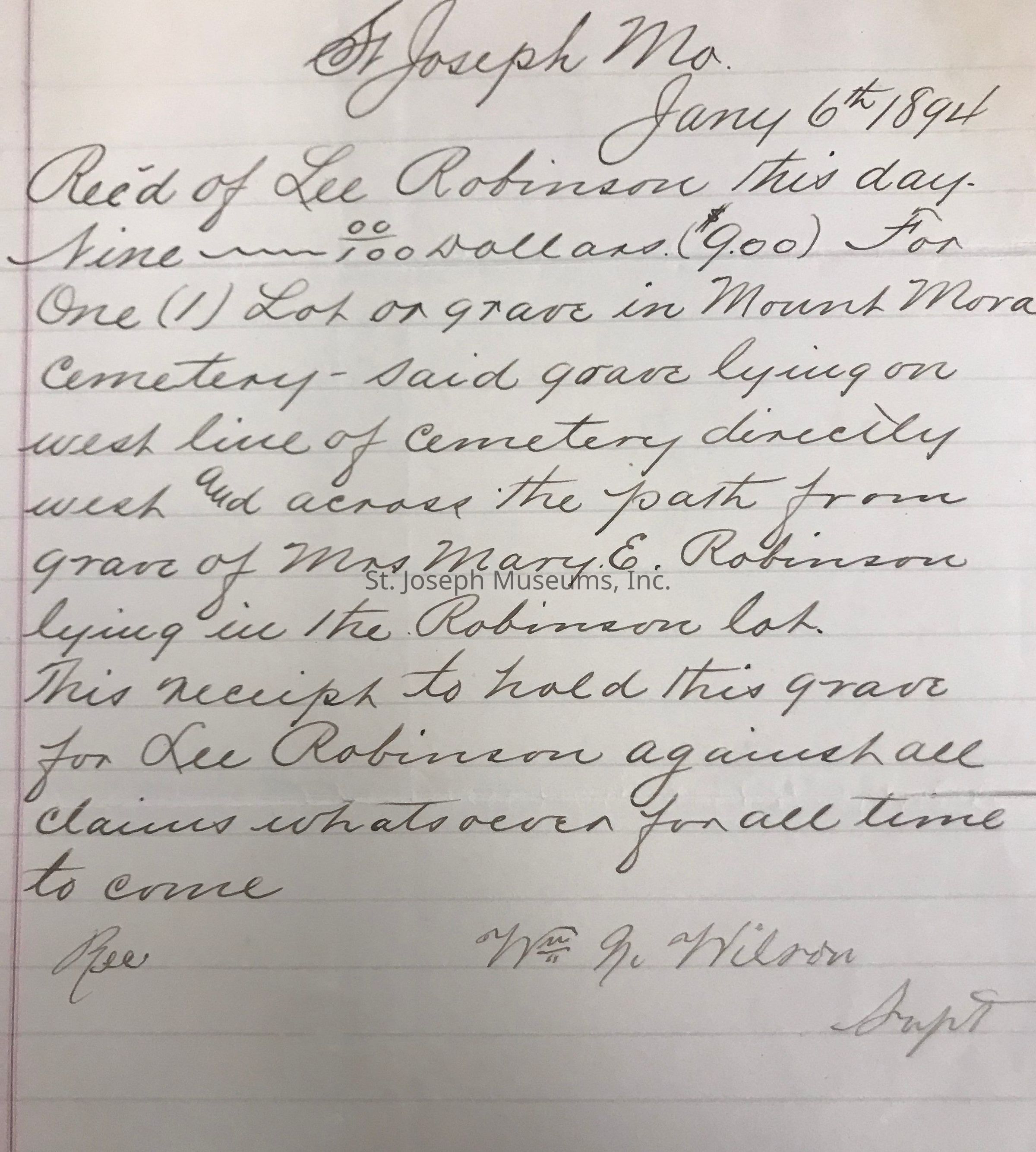 Receipt for $9 tor Grave in Mt. Mora Cemetery, St. Joseph, Missouri to Lee Robinson, signed by William M. Wilson, Superintendent of cemetery, January 6, 1894.Lexicon