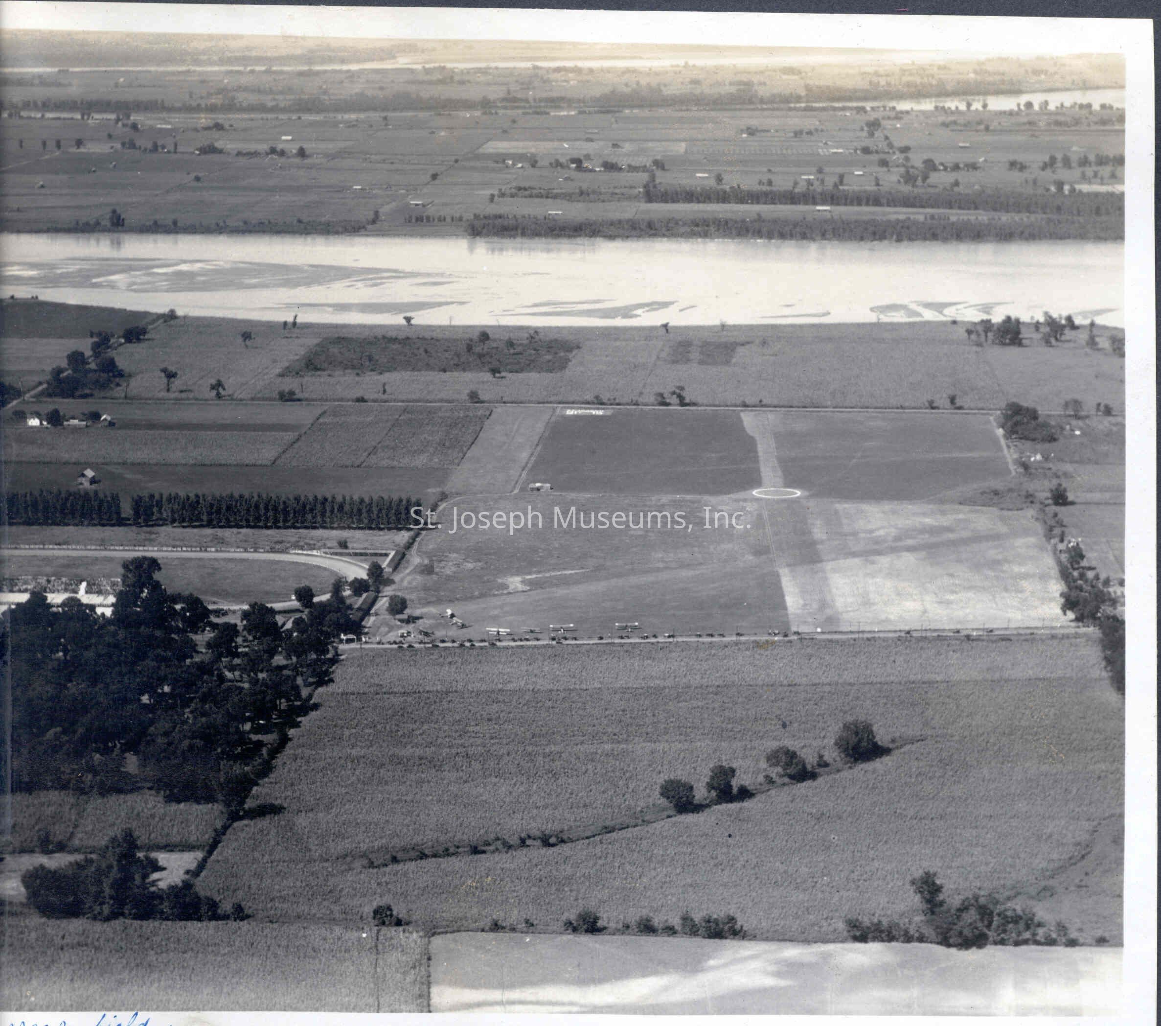 From Index: "Rosecrans airfield & Lake Contrary racetrack. air view. View to north towards Missouri River."