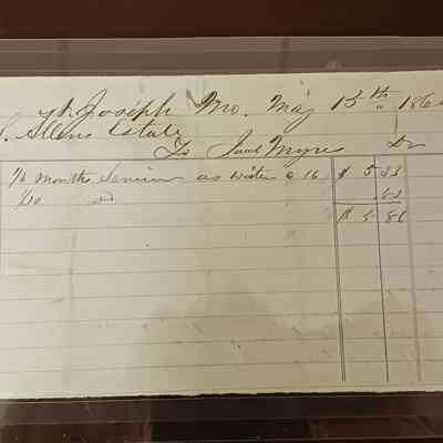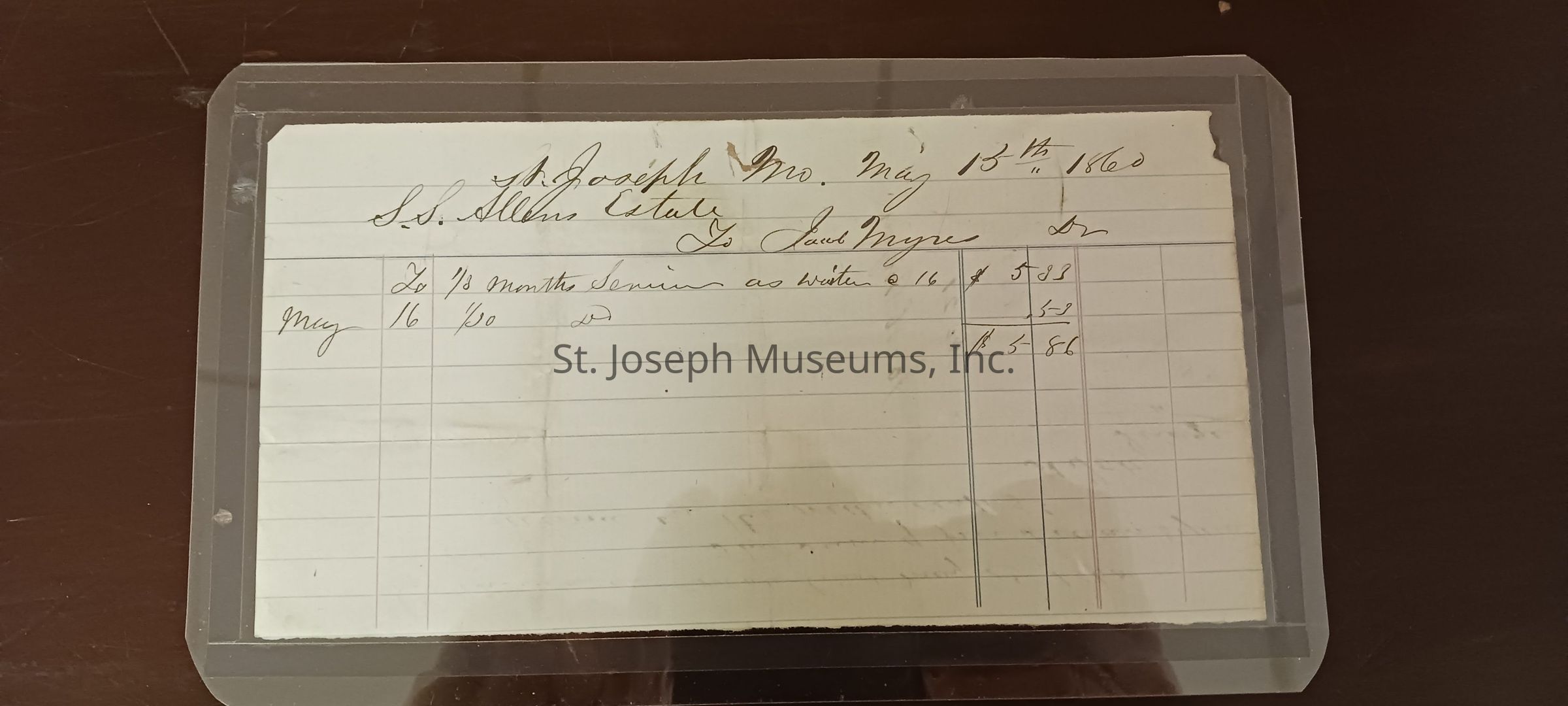Myres, Jacob Bill To S. S. Allen, 1860. The bill of $5.86 was for Mr. Myres service as a waiter. Dated May 15, 1860.