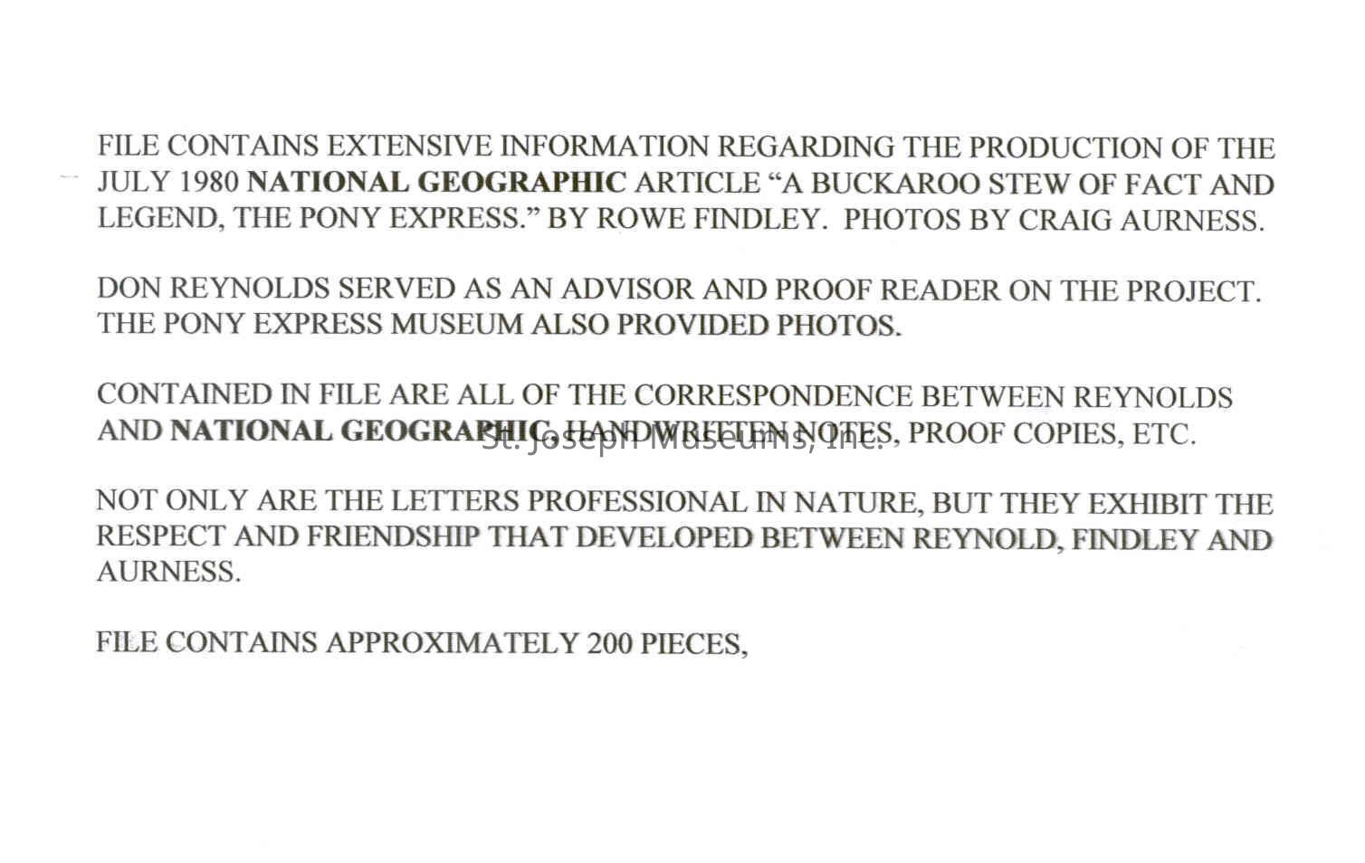 Files contain correspondence with Pony Rider descendants, Pony Express rider biographies, newspaper clippings related to the Pony Express, and miscellaneous records, photos, and documents collected from major private and University libraries among other sources. NOTE ABOUT ORIGIN OF LIBRARIES FILE. Prior to the opening of the renovated Pony Express Museum in 1993, St. Joseph Museum staff did extensive research on the Pony Express. All of the libraries in this folder were visited and copies of all material related to the Pony Express were made. This was done from 1991 to 1993. Information from this research was used in the new exhibits of the Pony Express Museum and in preparation of the book On the Winds of Destiny. In 2015, the file from the Pony Express Museum was added. Jackie Lewin 7/27/15 CD containing scans of actual documents found in Pony Express Research Files located in file cabinets in Document Storage II area.