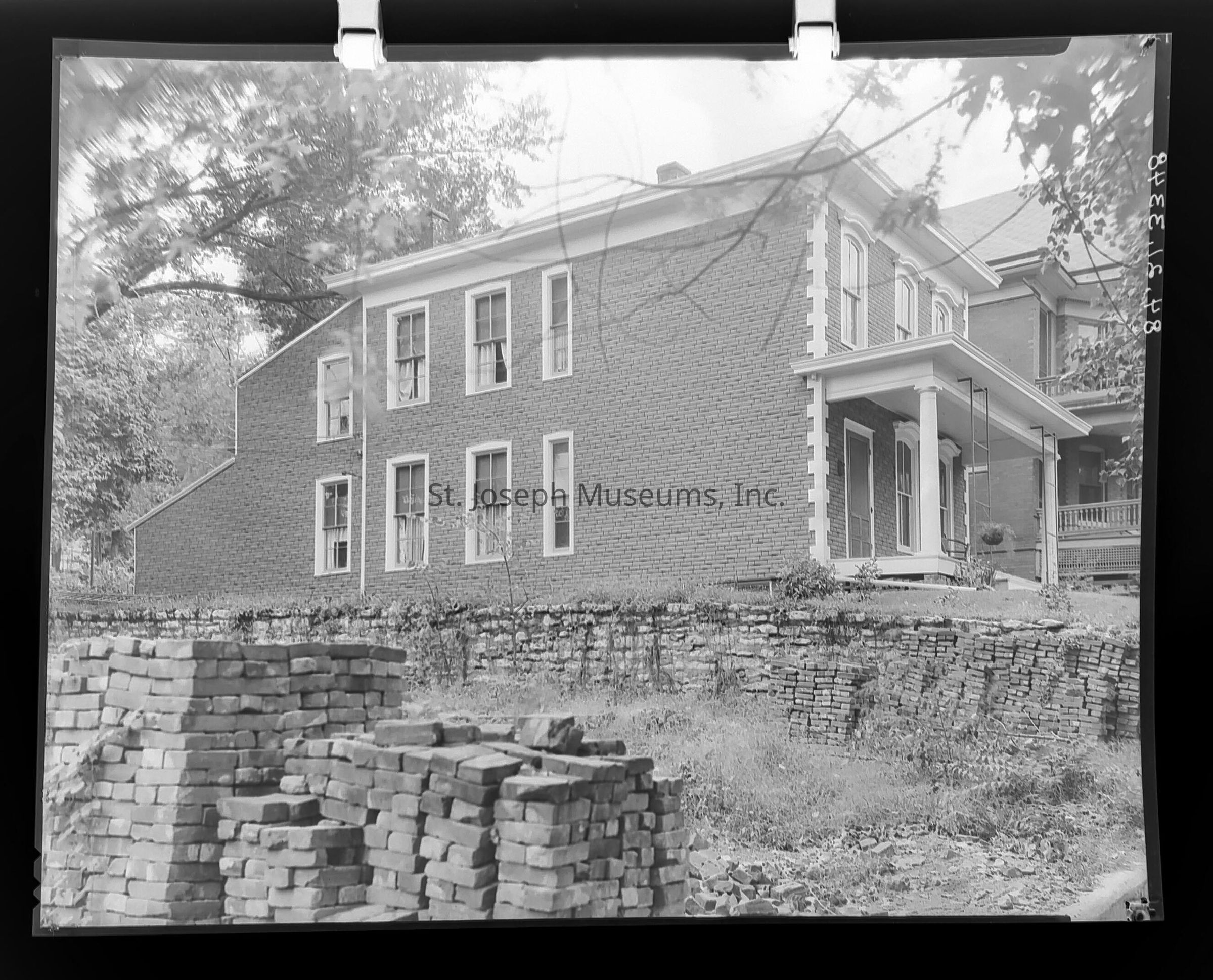 Black-and-white image showcasing a two-story brick house in St. Joseph, Missouri.