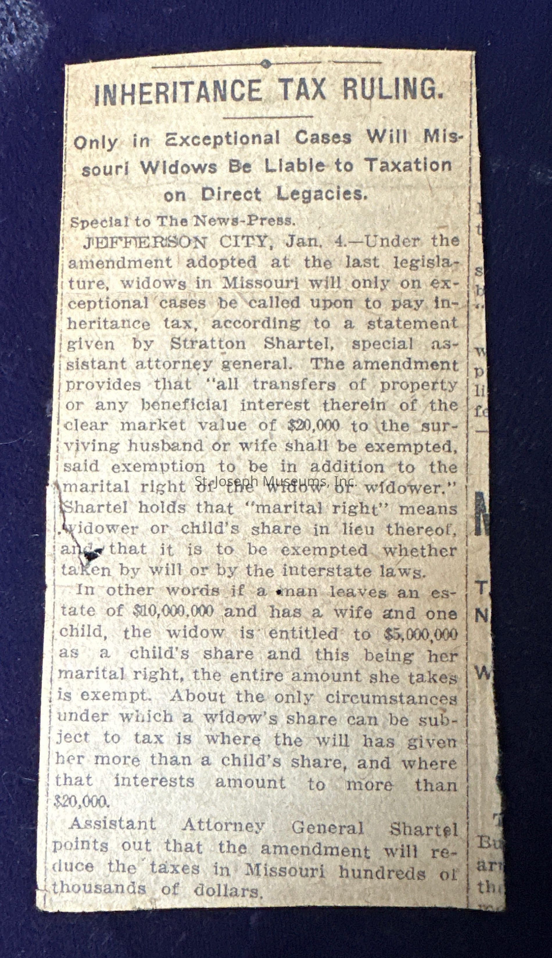 Newspaper clipping titled, “Inheritance Tax Ruling: Only in Exceptional Cases Will Missouri Widows be Liable to Taxation on Direct Legacies.”