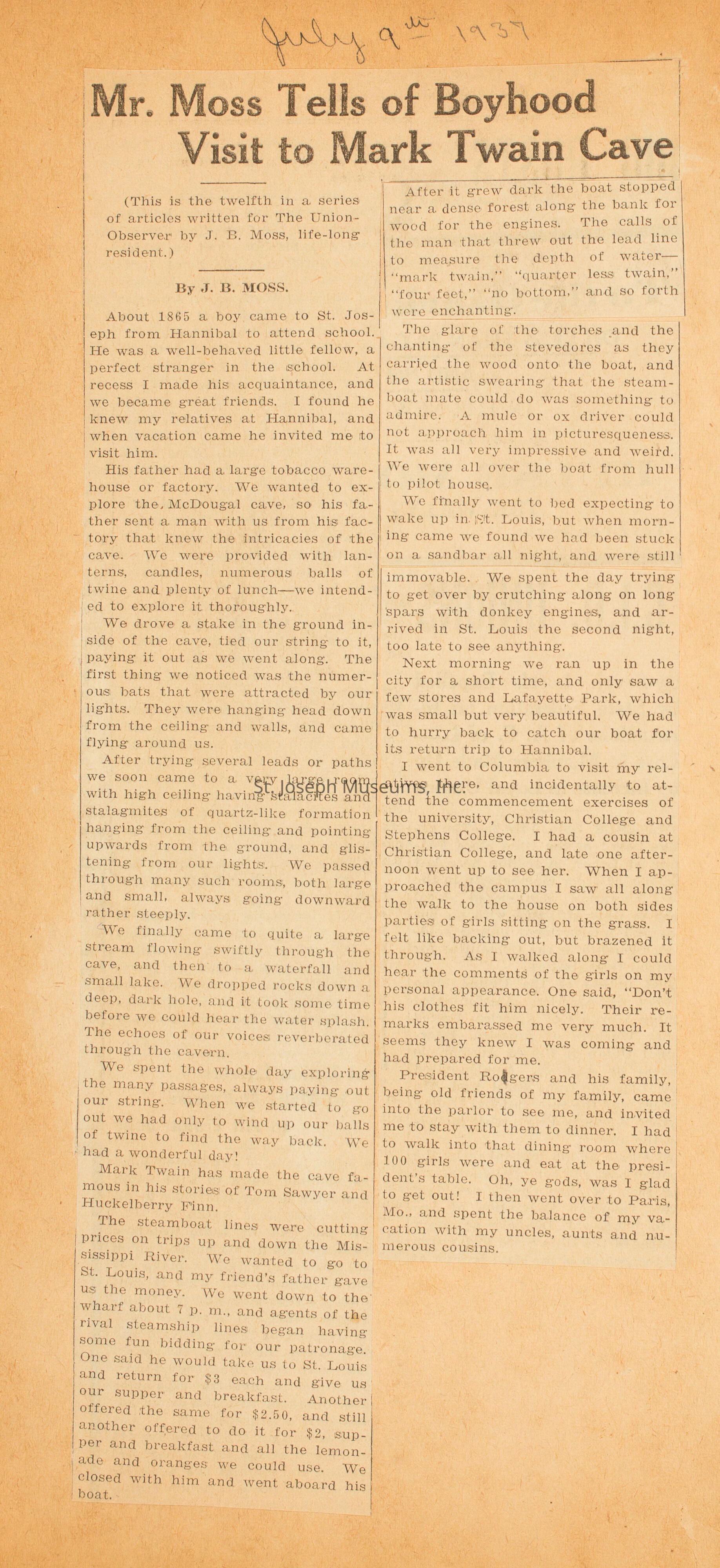 Mr. Moss Tells of Boyhood Visit to Mark Twain Cave (July 9, 1937)Photograph Details