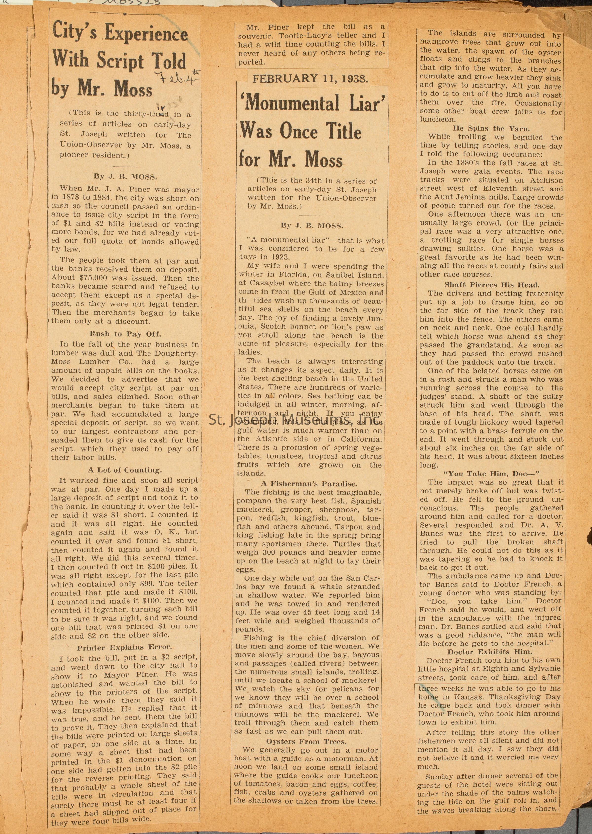 Three articles by J.B. Moss: City's Experience With Script Told by Mr. Moss (February 4, 1938) 'Monumental Liar' Was Once Title for Mr. Moss (February 11, 1938) Religion and Food Made Famous the Jimtown Church (Feb 18, 1938)