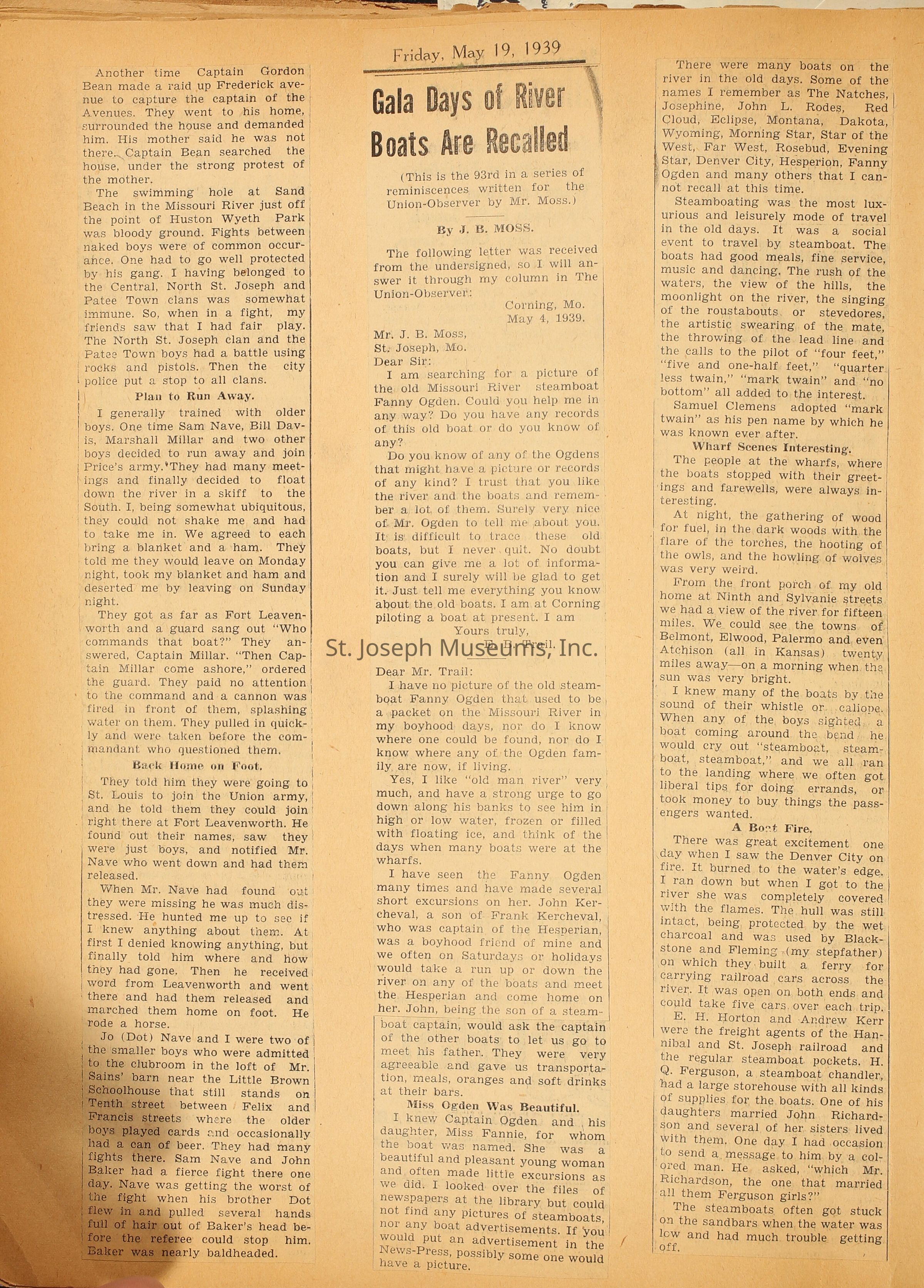 Three newspaper articles written by J.B. Moss: St. Joseph Saw Much Civil War Activity (May 5, 1939) Boys in War Times in the 1860's (May 12, 1939) Gala Days of River Boats are Recalled (May 19, 1939)