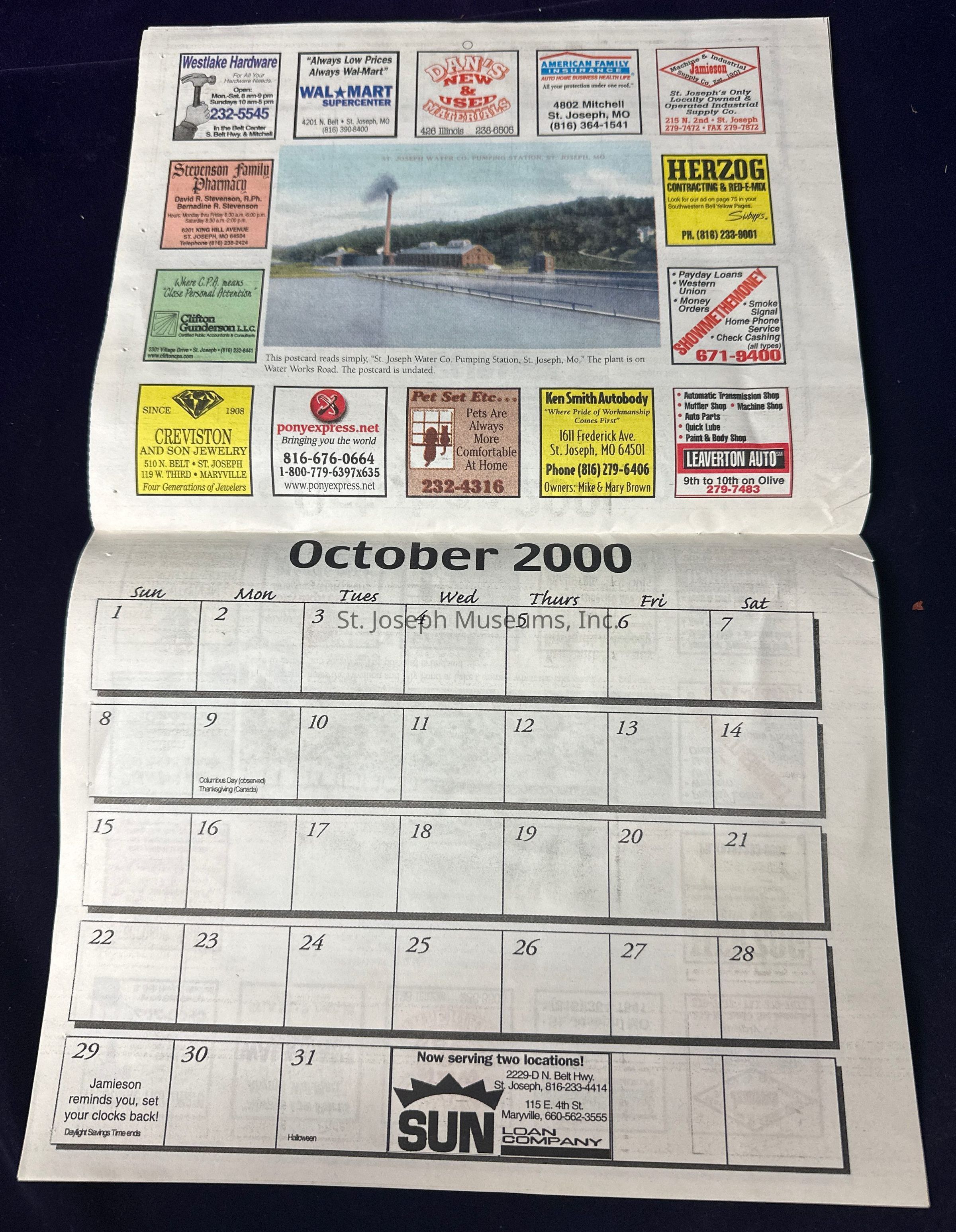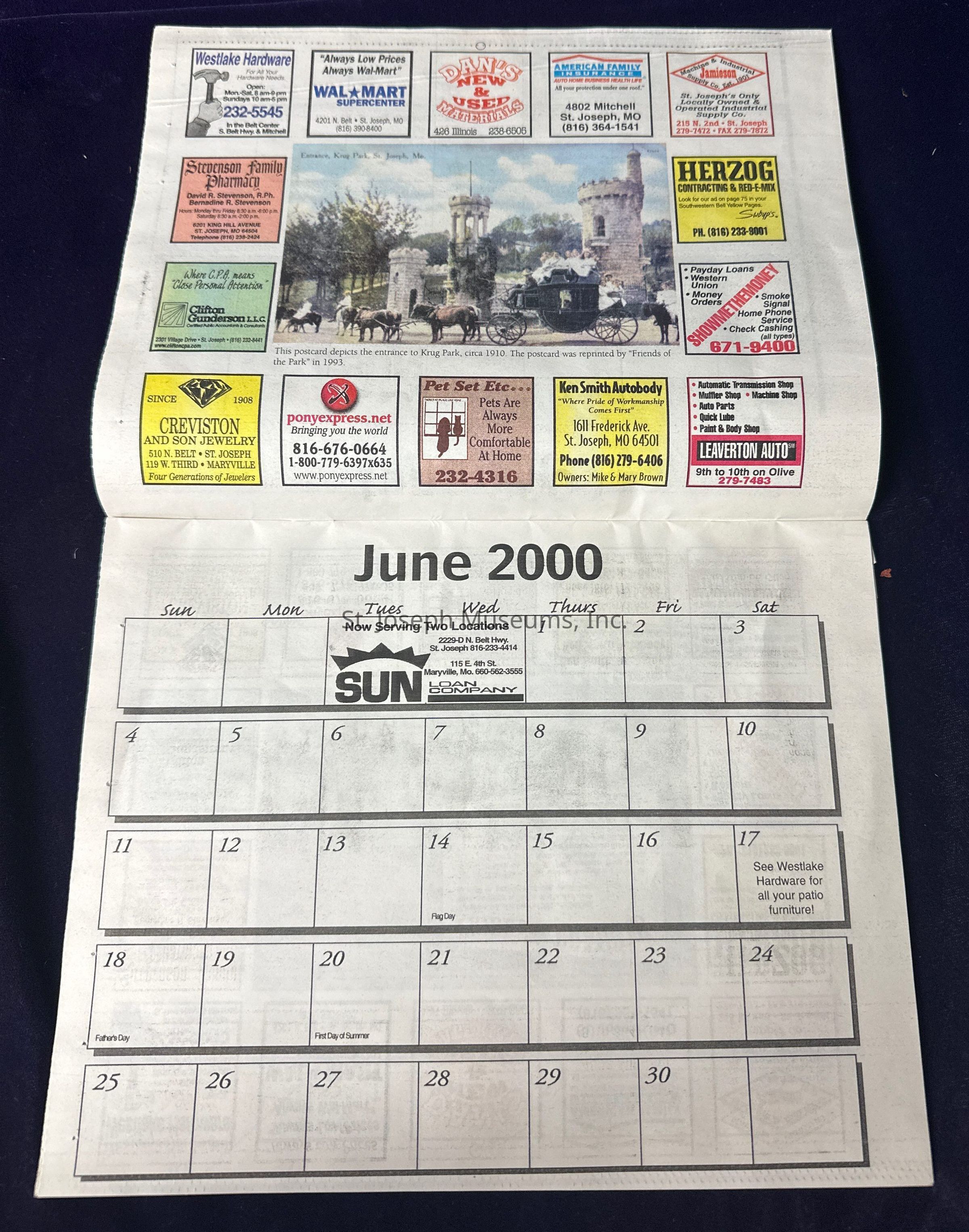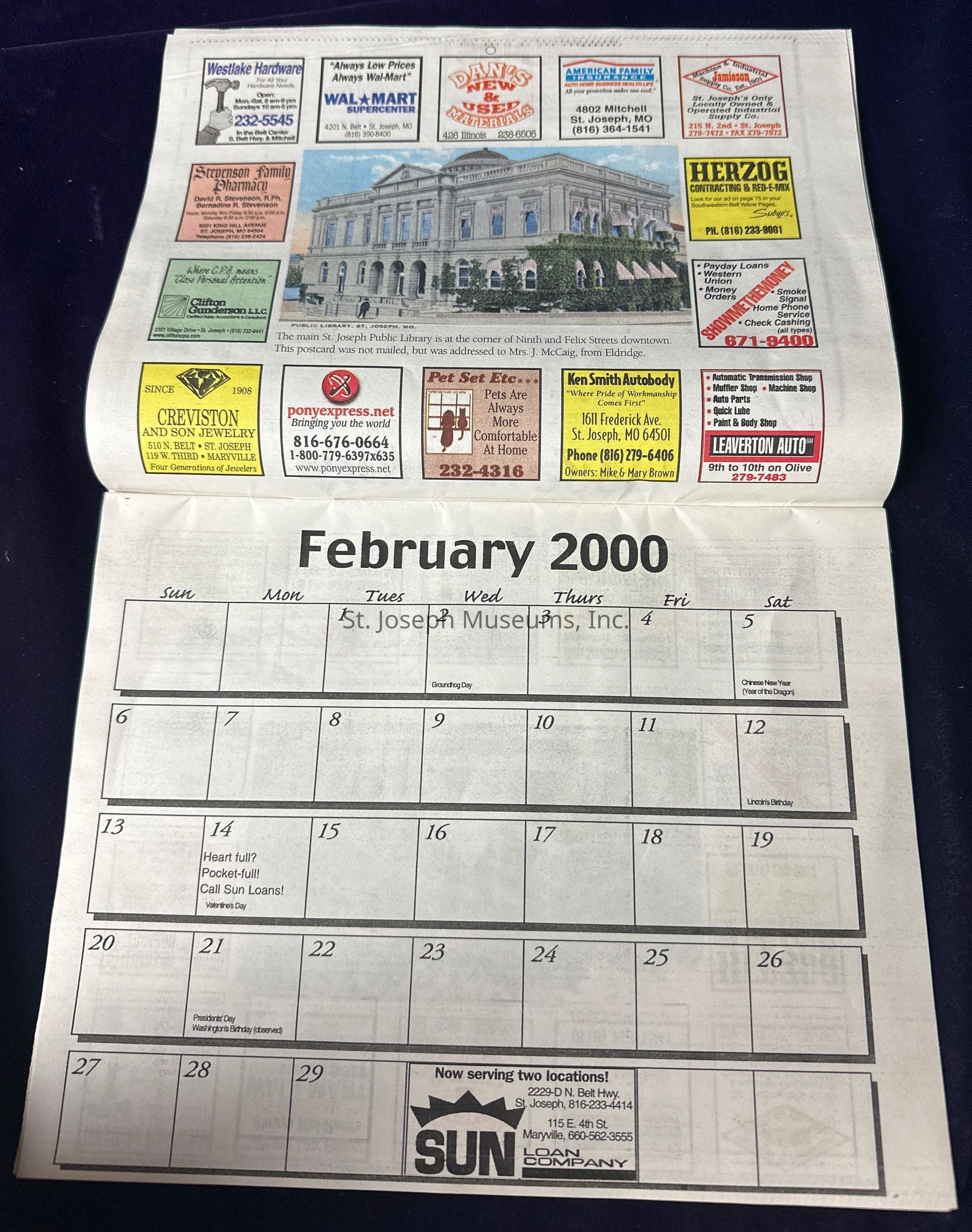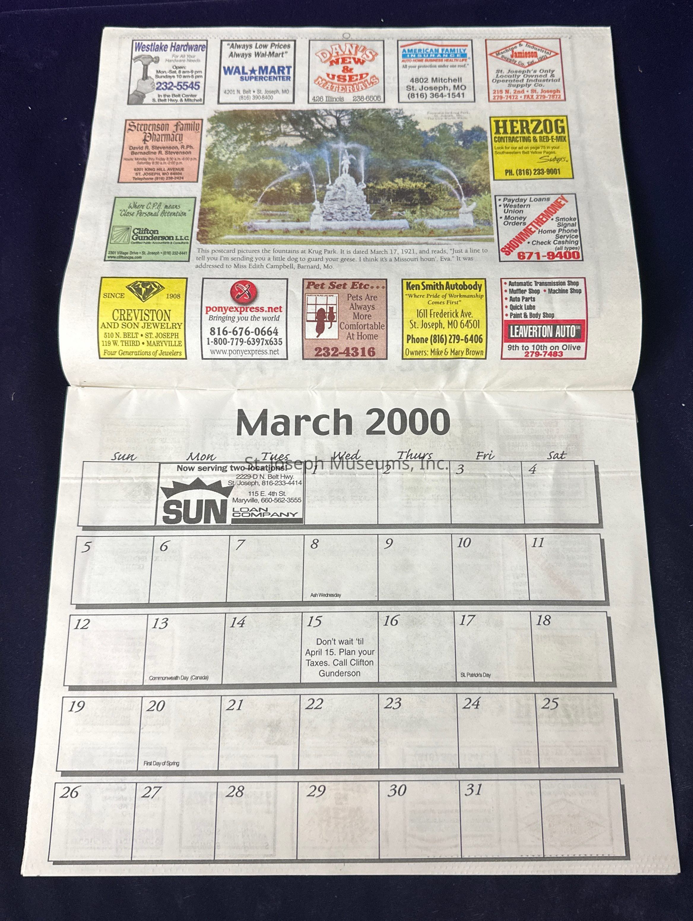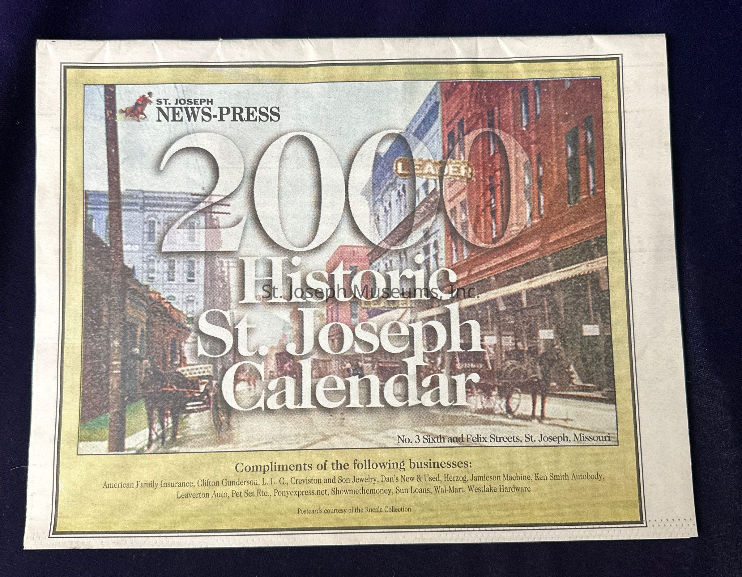 Saint Joseph News Press article on the 2000 Historic Saint Joe Calendar. Article features American Family Insurance, Clifton Gunderson LLC, Creviston and Son Jewelry, Dan’s New and Used, Herzog, Jamieson Machine, Ken Smith Autobody, Leaverton Auto, Pet Set Etc., Ponyexpress.net, Showmethemoney, Sun Loans, Wal-Mart, and Westlake Hardware.