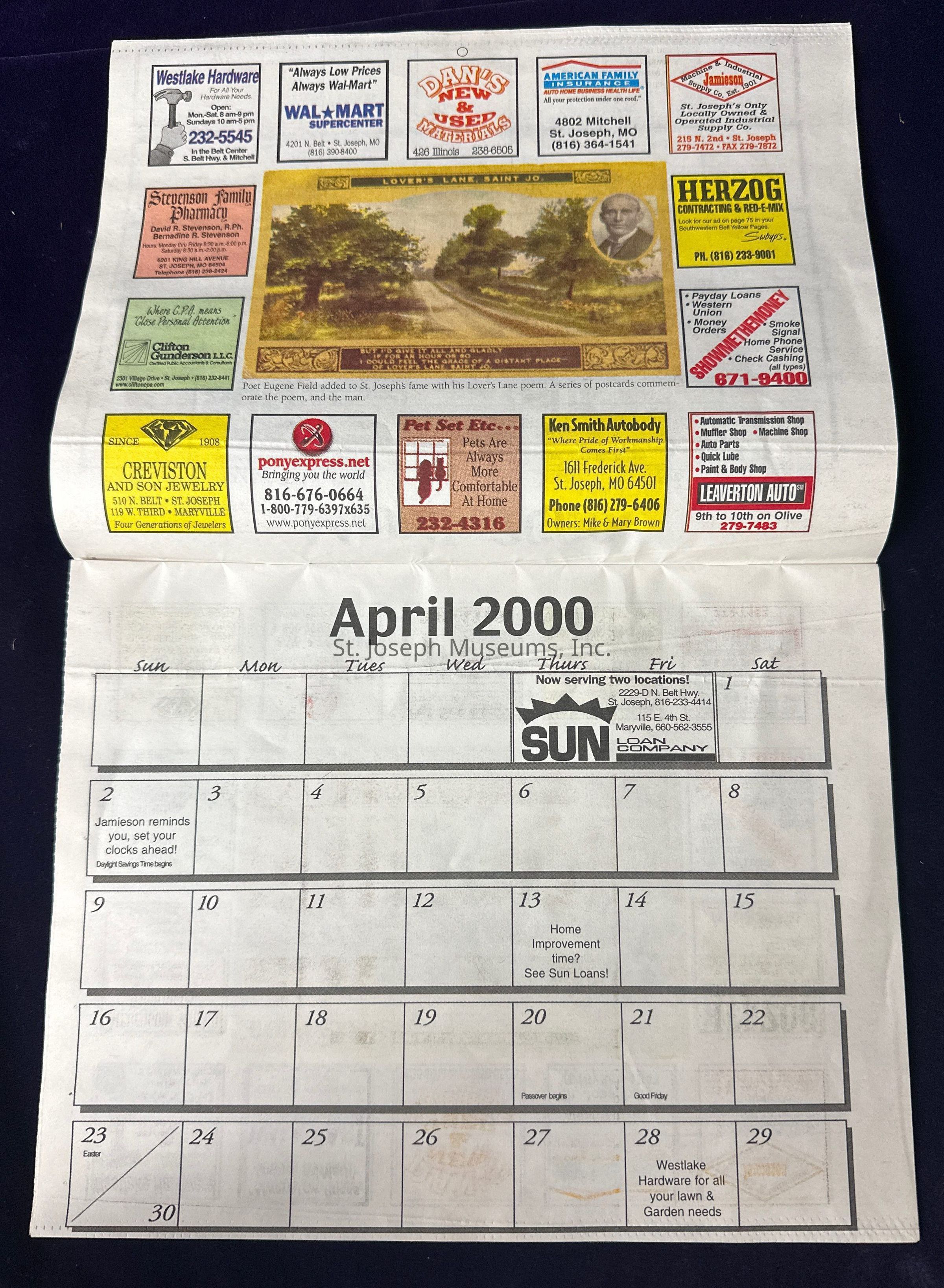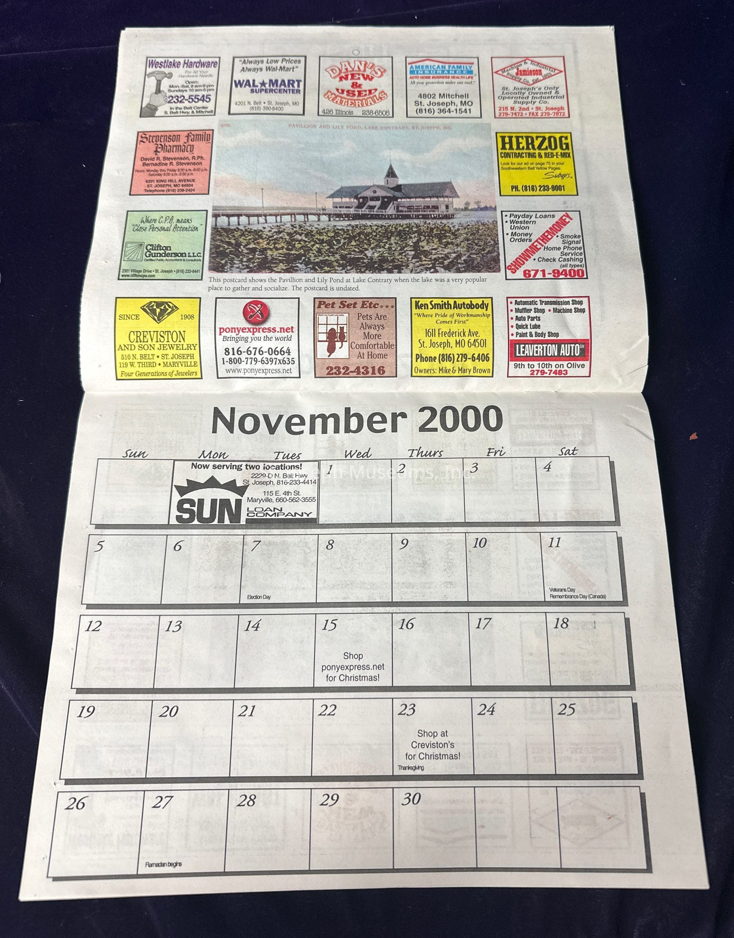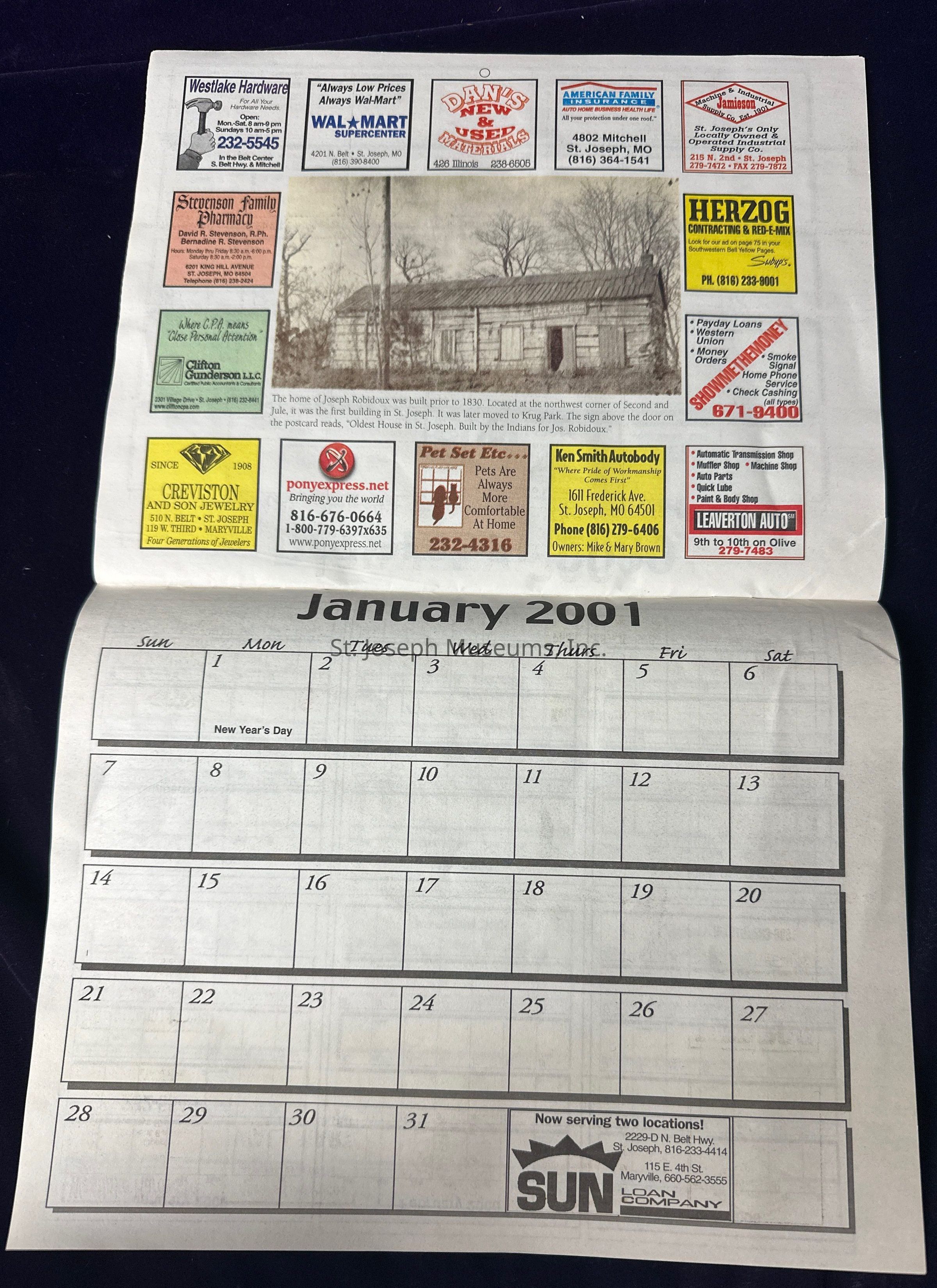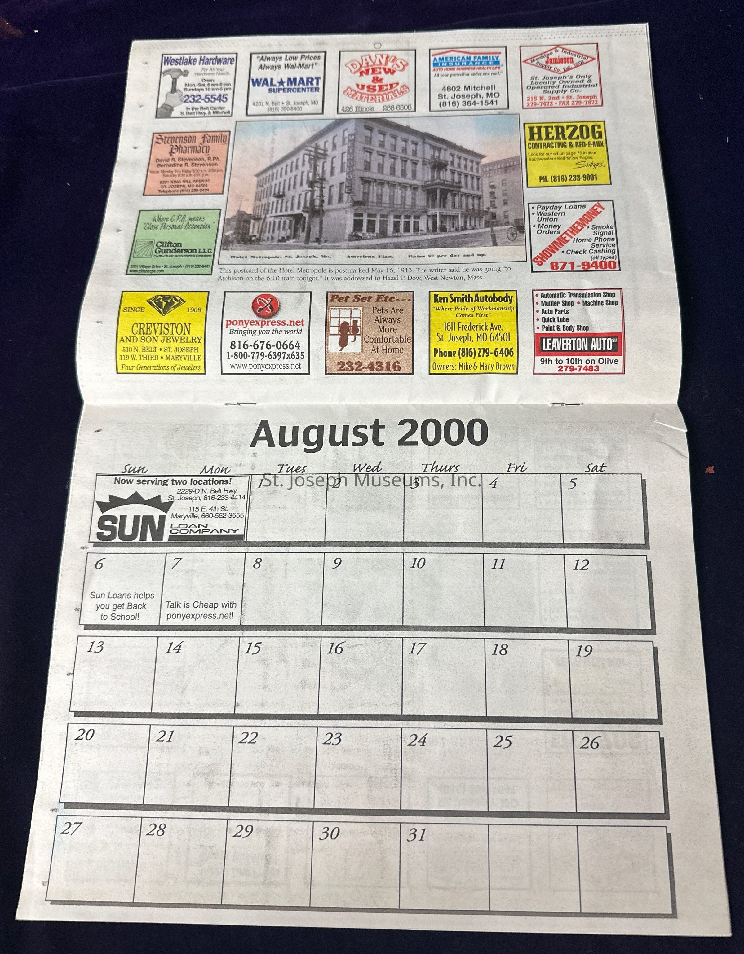 Saint Joseph News Press article on the 2000 Historic Saint Joe Calendar. Article features American Family Insurance, Clifton Gunderson LLC, Creviston and Son Jewelry, Dan’s New and Used, Herzog, Jamieson Machine, Ken Smith Autobody, Leaverton Auto, Pet Set Etc., Ponyexpress.net, Showmethemoney, Sun Loans, Wal-Mart, and Westlake Hardware.