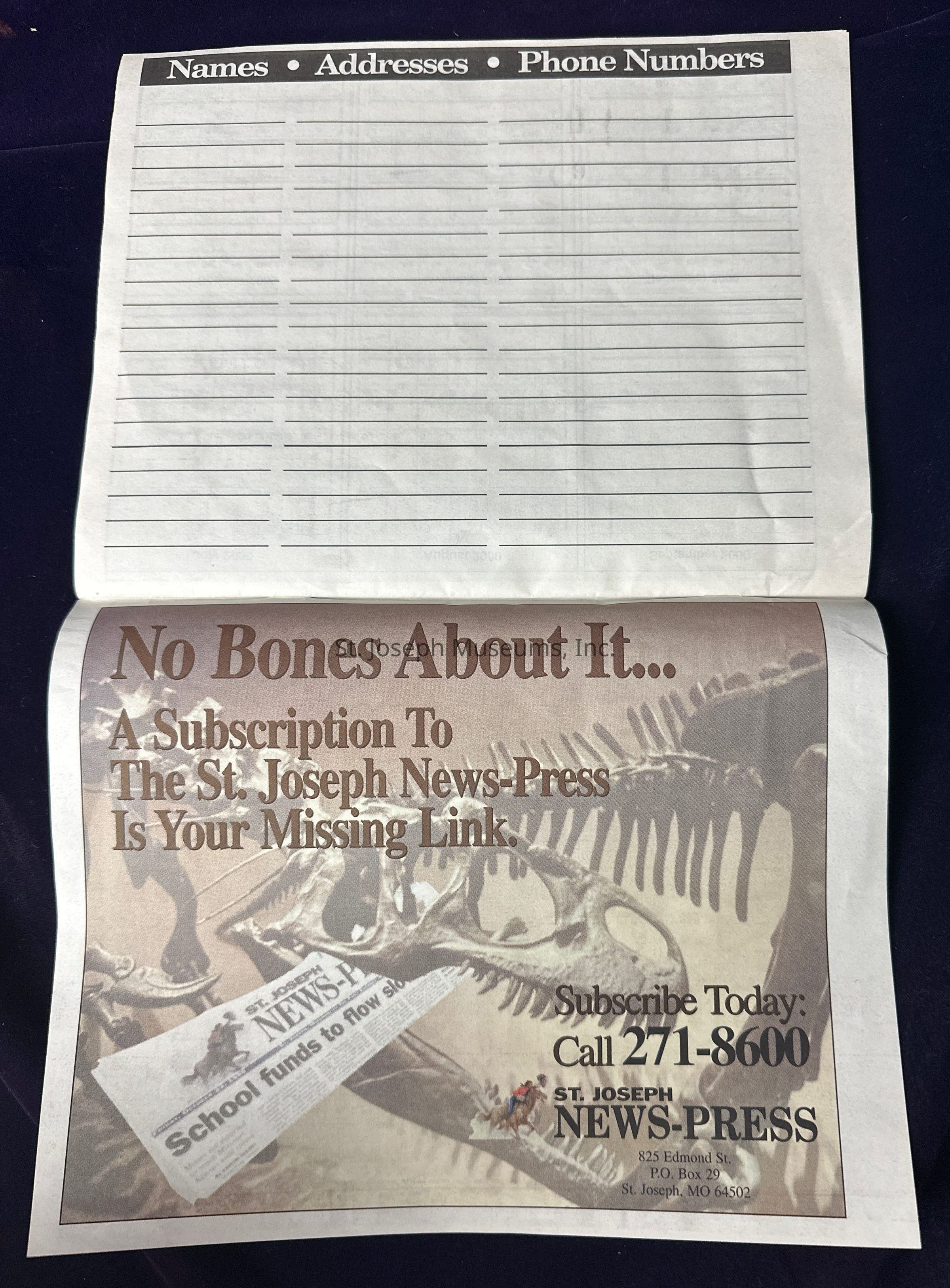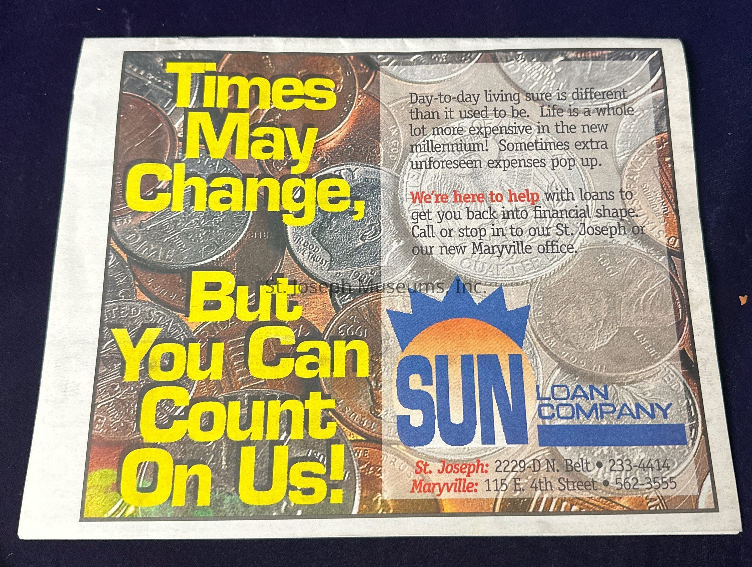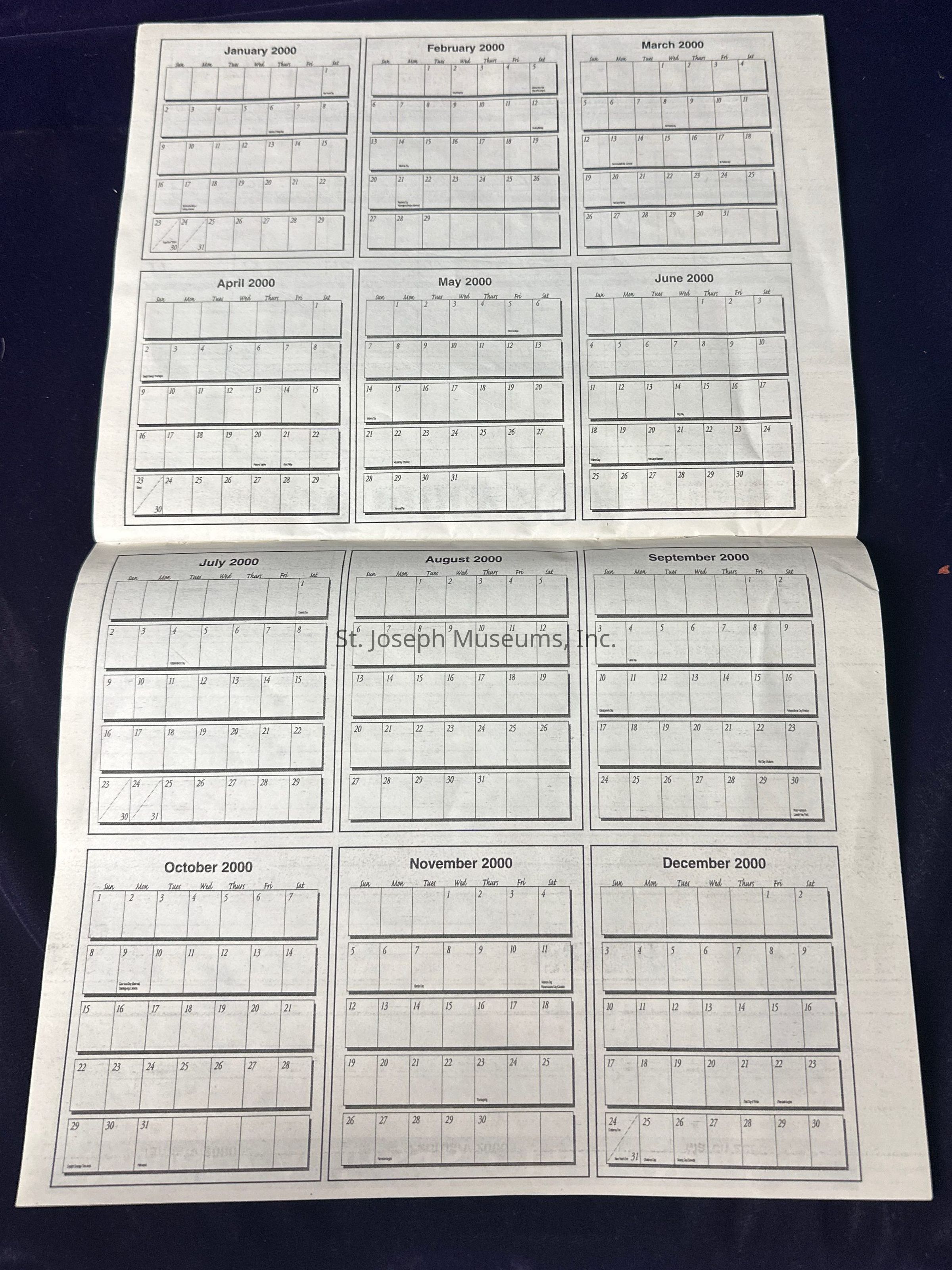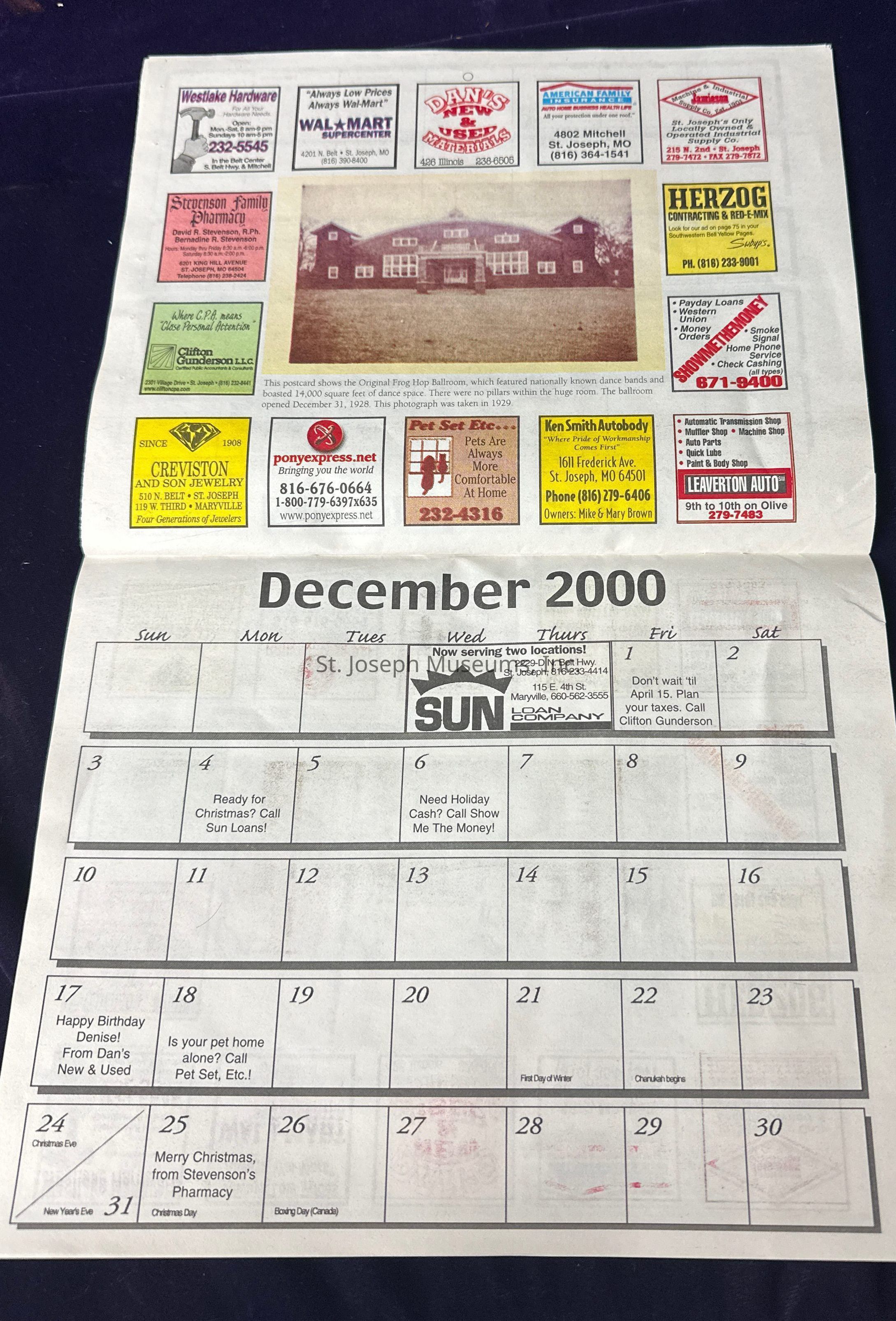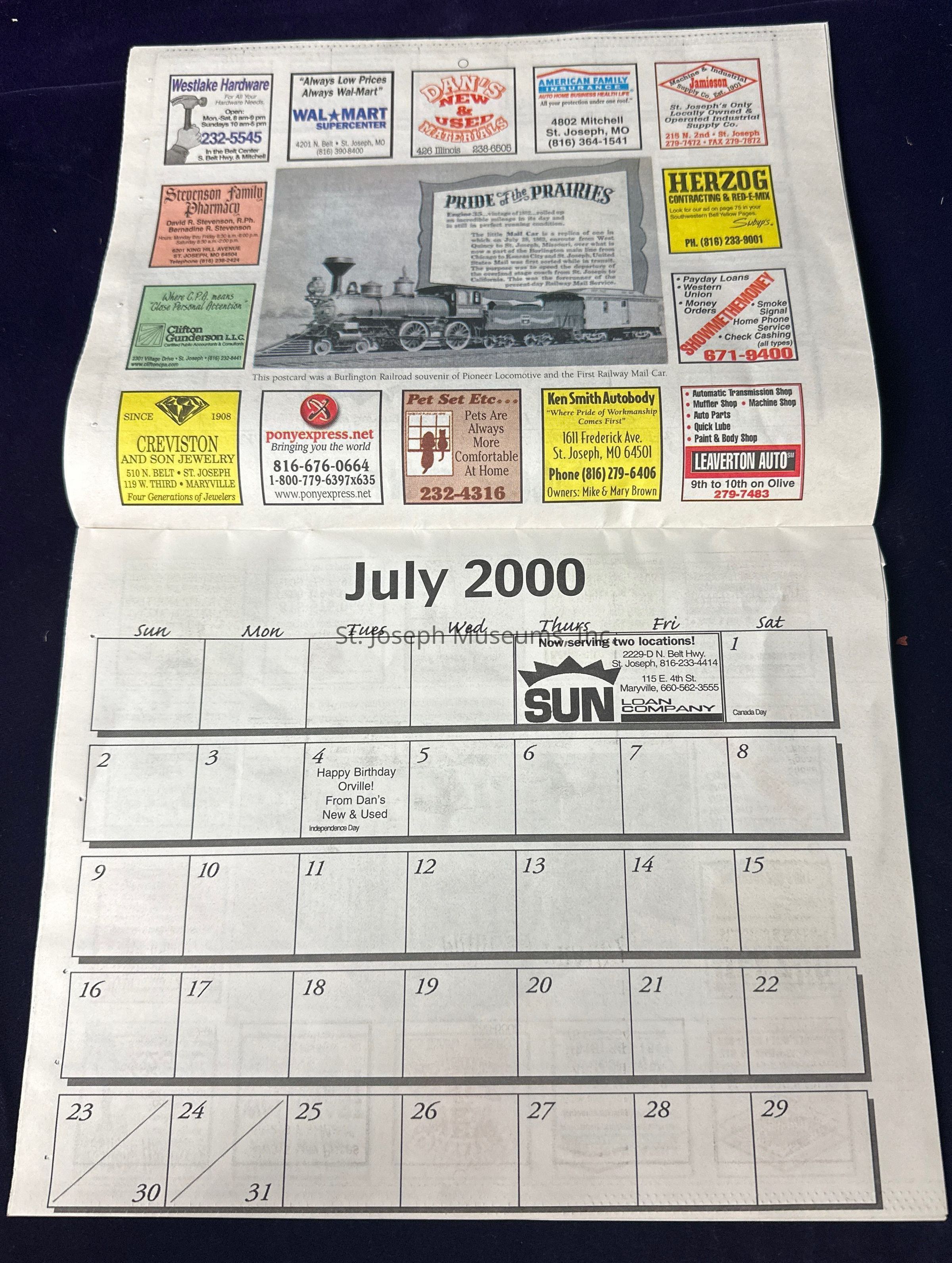 Saint Joseph News Press article on the 2000 Historic Saint Joe Calendar. Article features American Family Insurance, Clifton Gunderson LLC, Creviston and Son Jewelry, Dan’s New and Used, Herzog, Jamieson Machine, Ken Smith Autobody, Leaverton Auto, Pet Set Etc., Ponyexpress.net, Showmethemoney, Sun Loans, Wal-Mart, and Westlake Hardware.