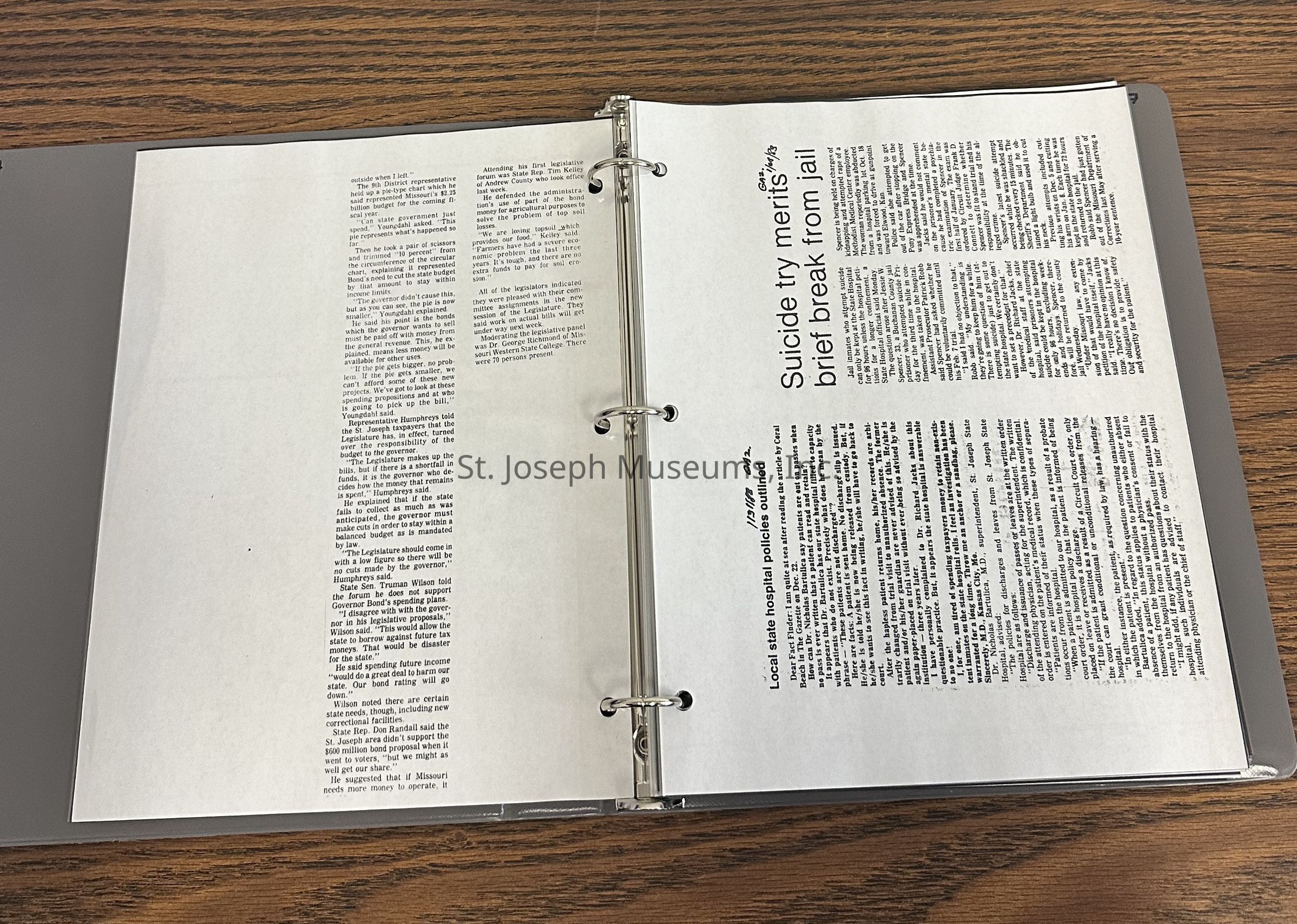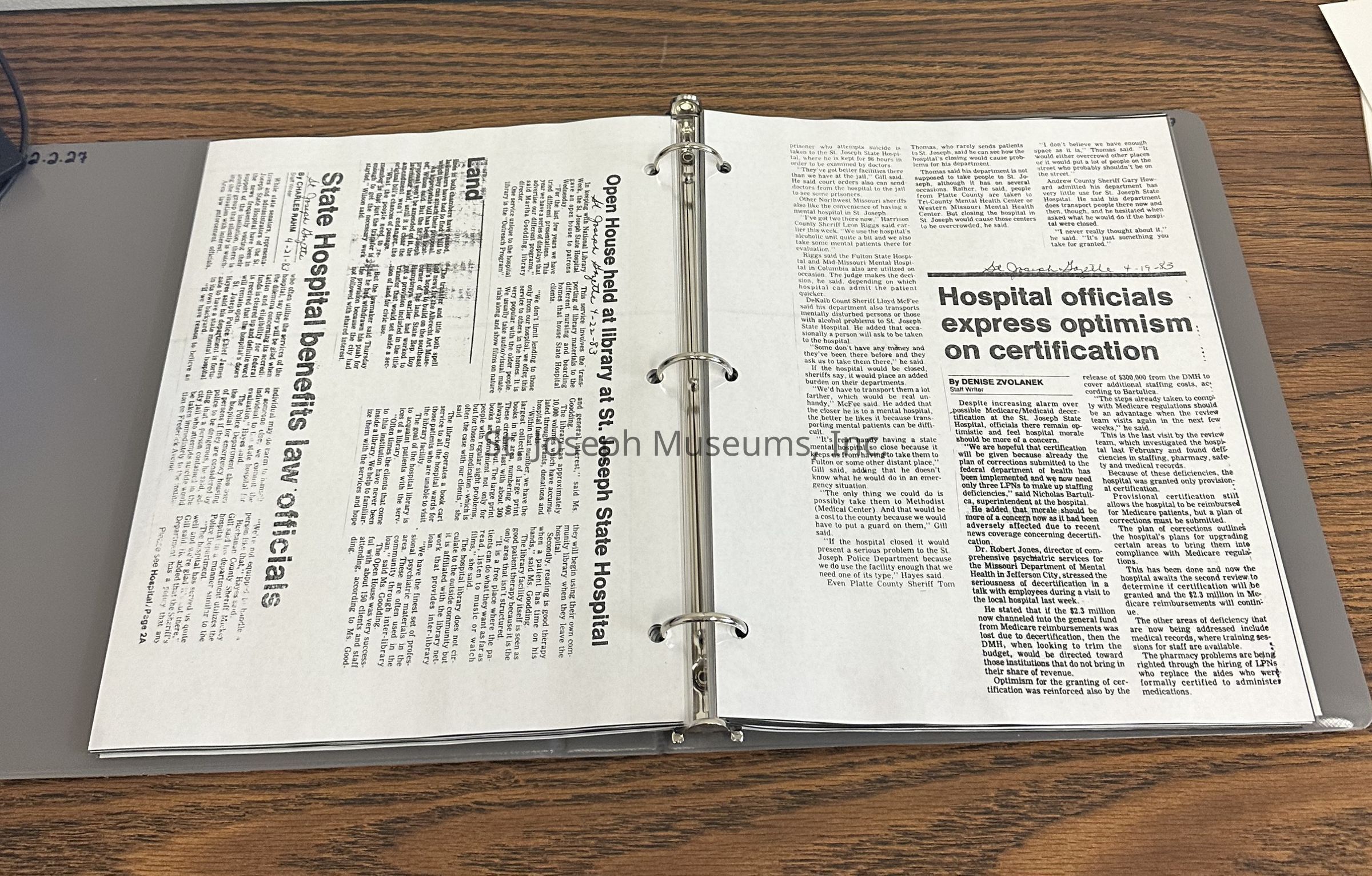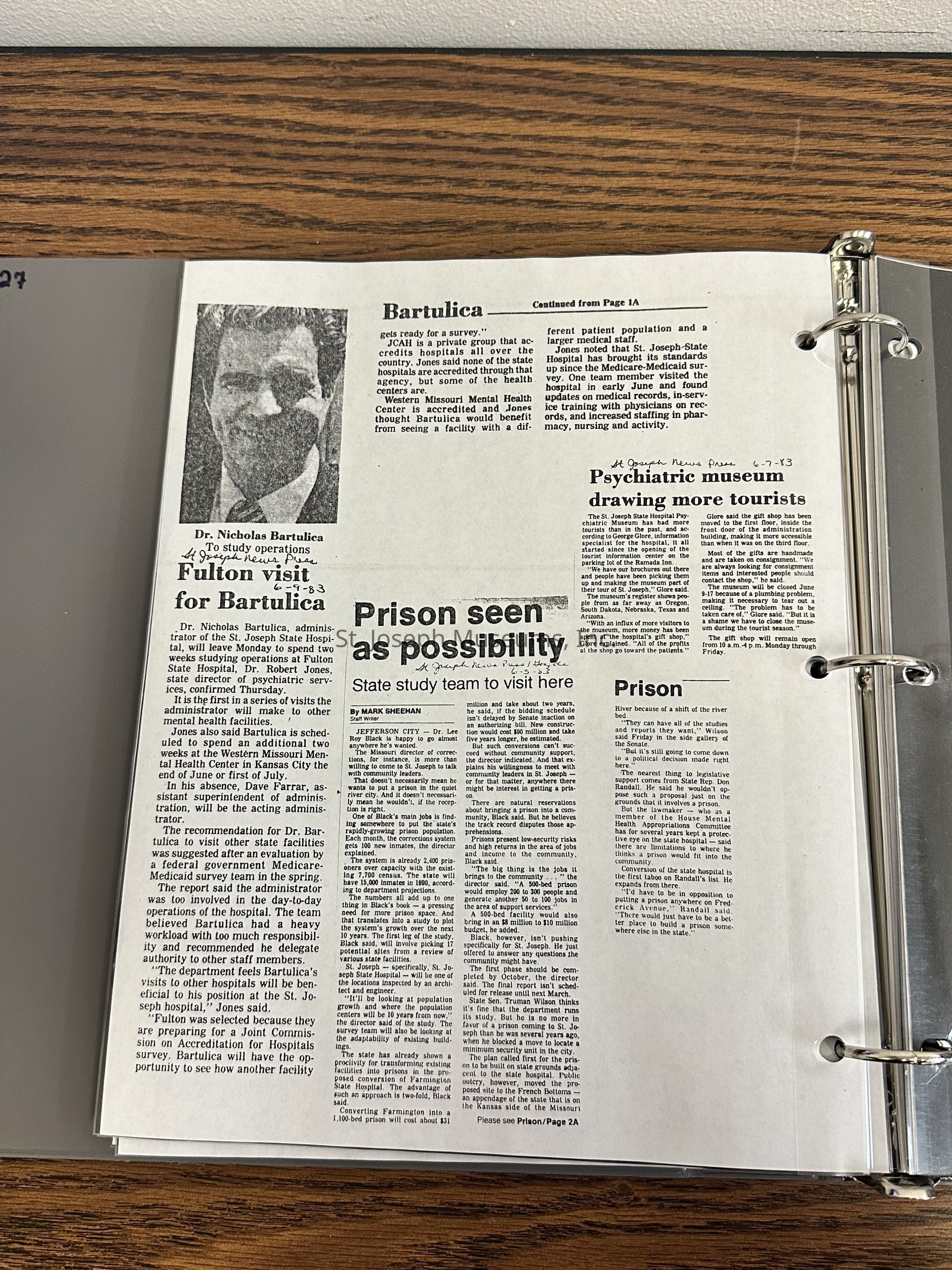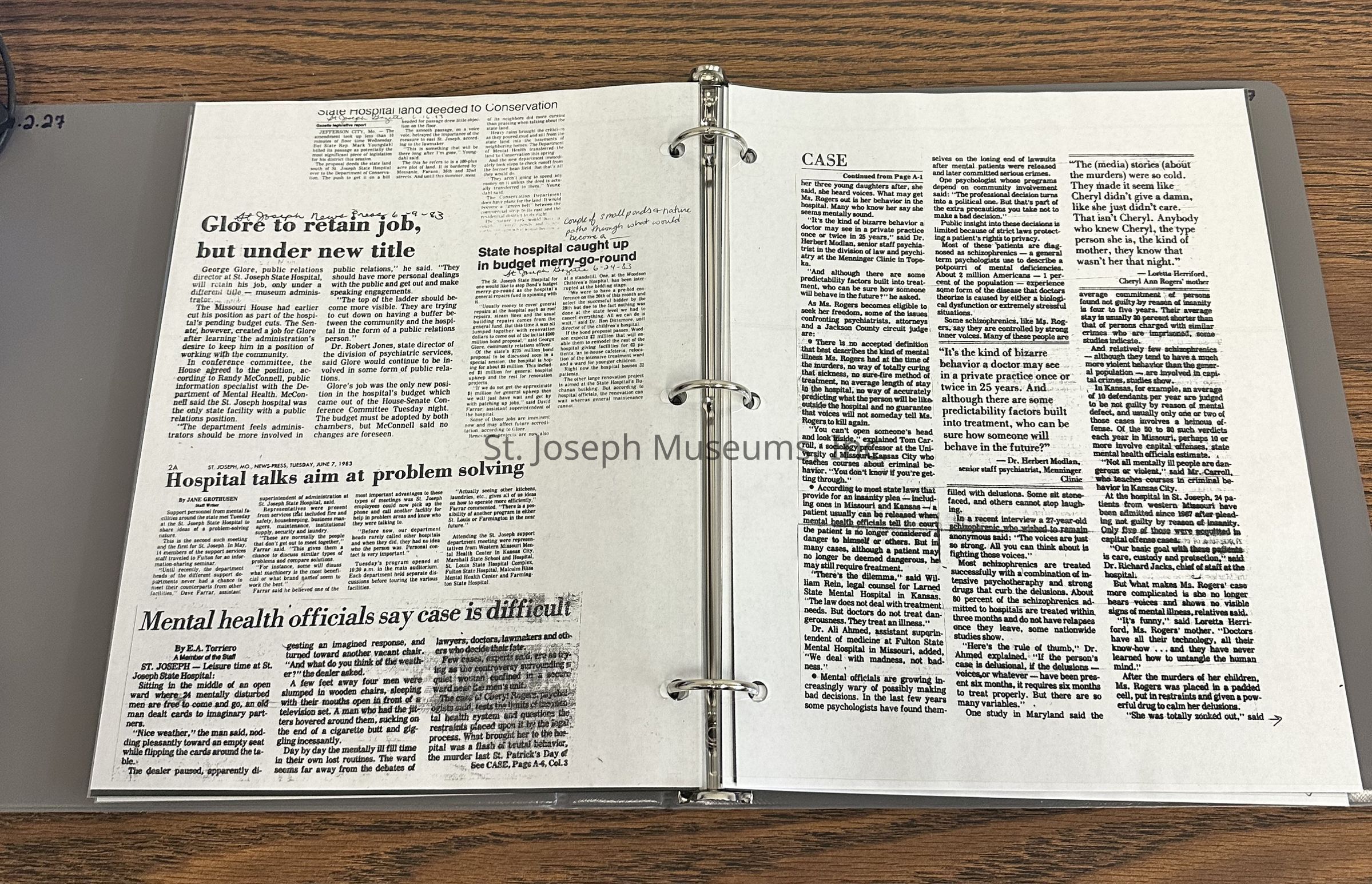 Newspaper clippings concerning the State Hospital in 1983Entry/Object ID