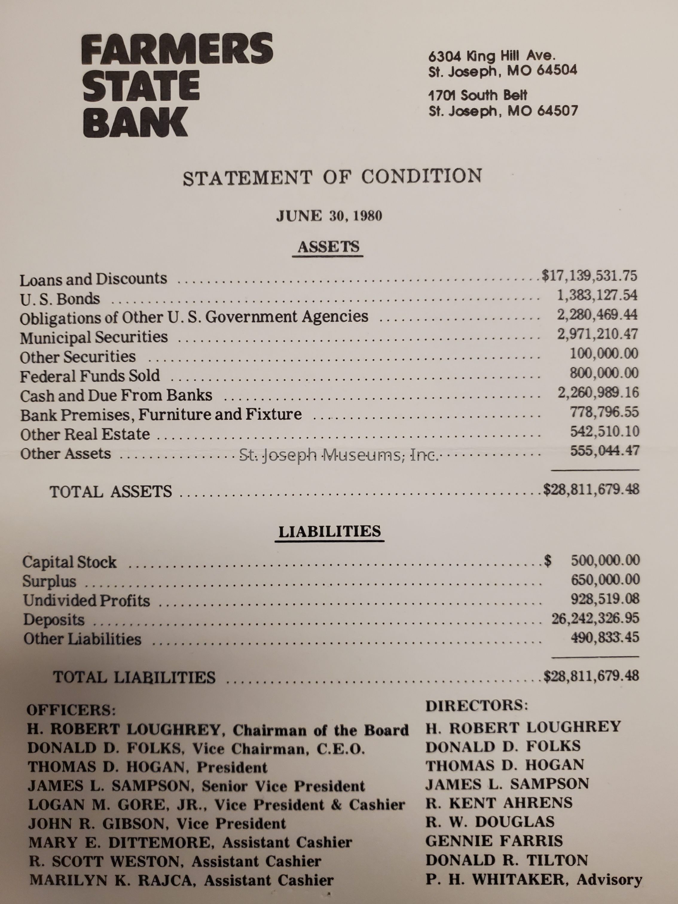An Official Statement for June 30, 1980 listed are some assets and liabilities for Farmers State Bank.