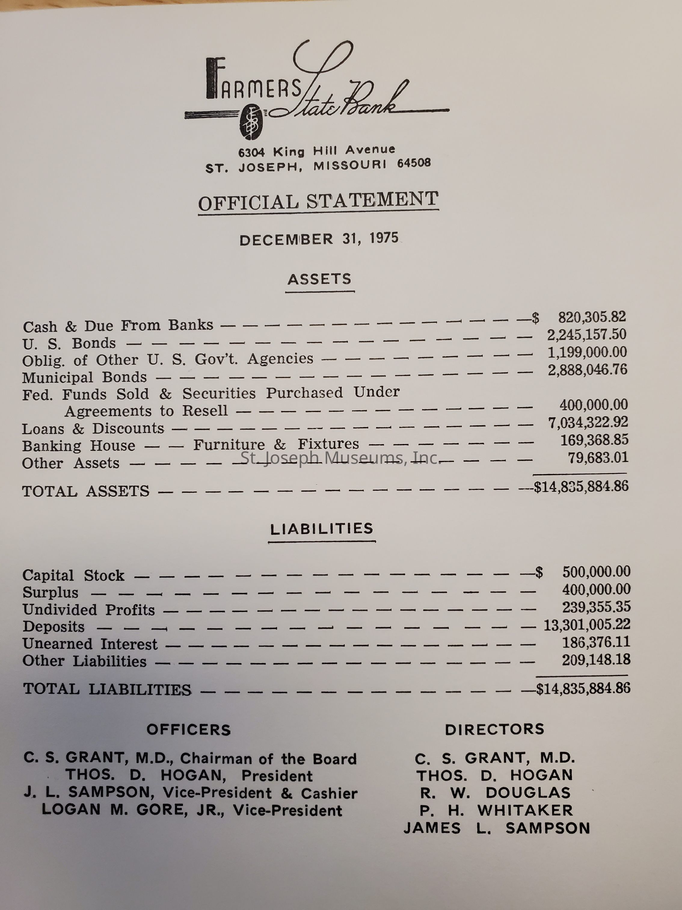 An Official Statement for December 31, 1975 listed are some assets and liabilities for Farmers State Bank.