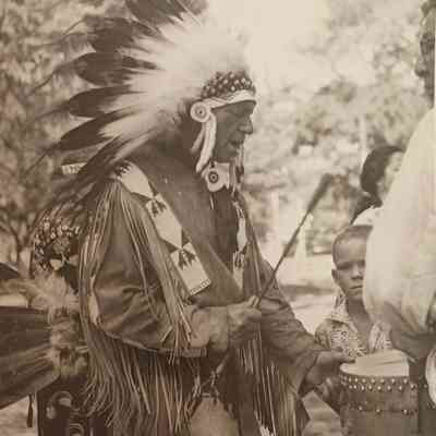 Black and white photograph of Chief of Ohamas Walter Hamilton playing the drum