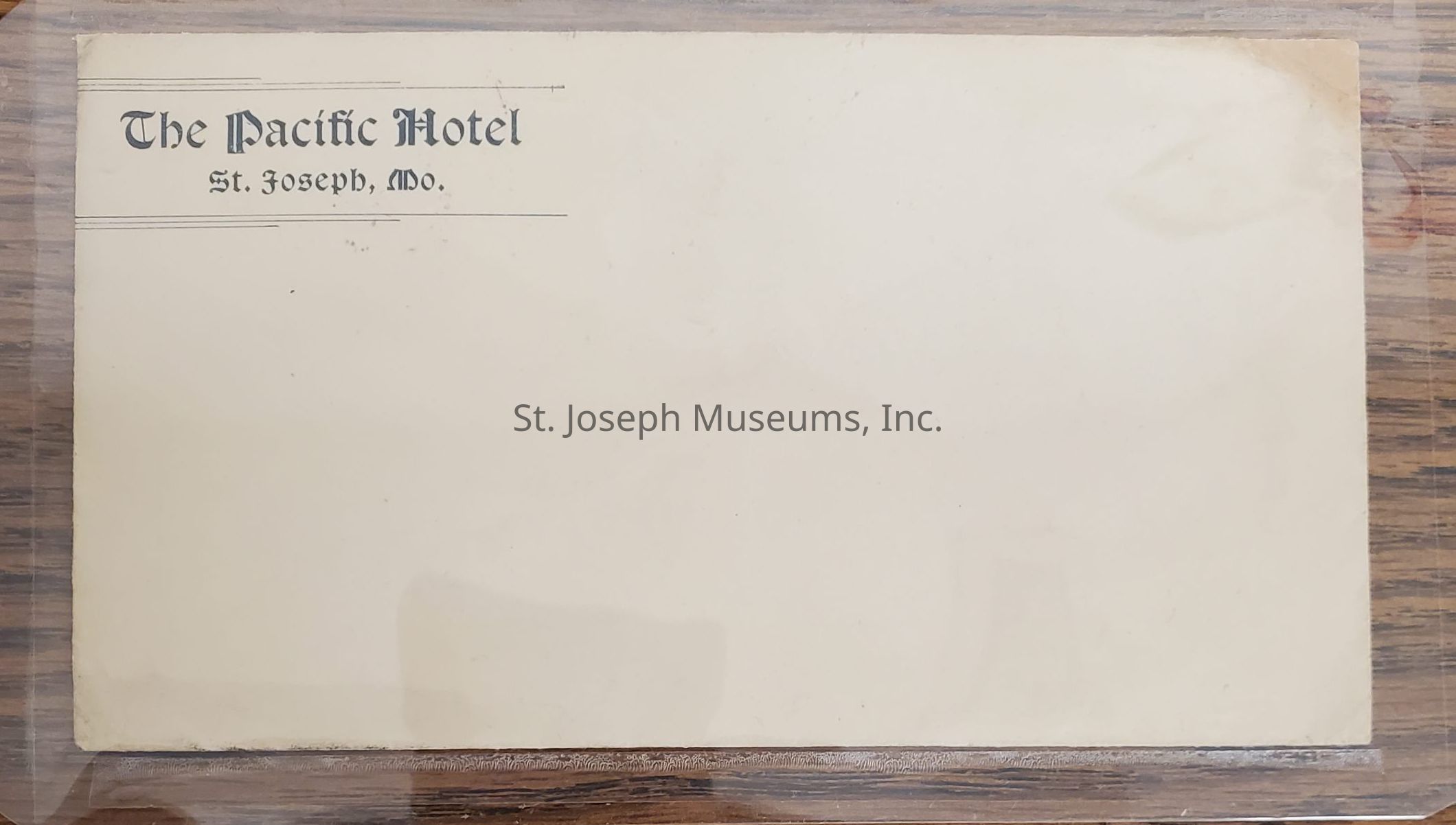 Pacific Hotel, St. Joseph, MO, Envelope, c. 1860's. Blank envelope with logo of "The Pacific Hotel, St. Joseph, Mo" as return address, printed in blue.Lexicon