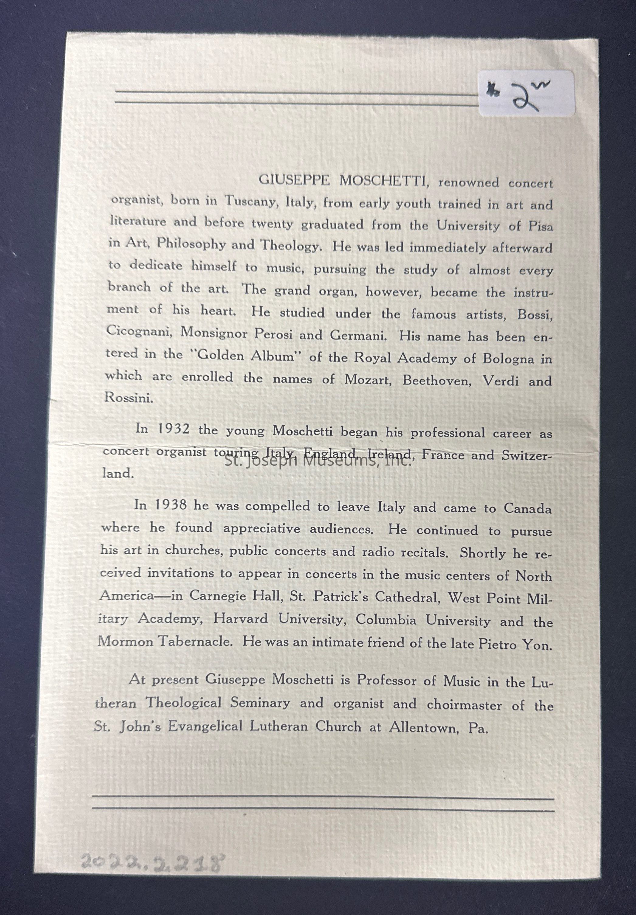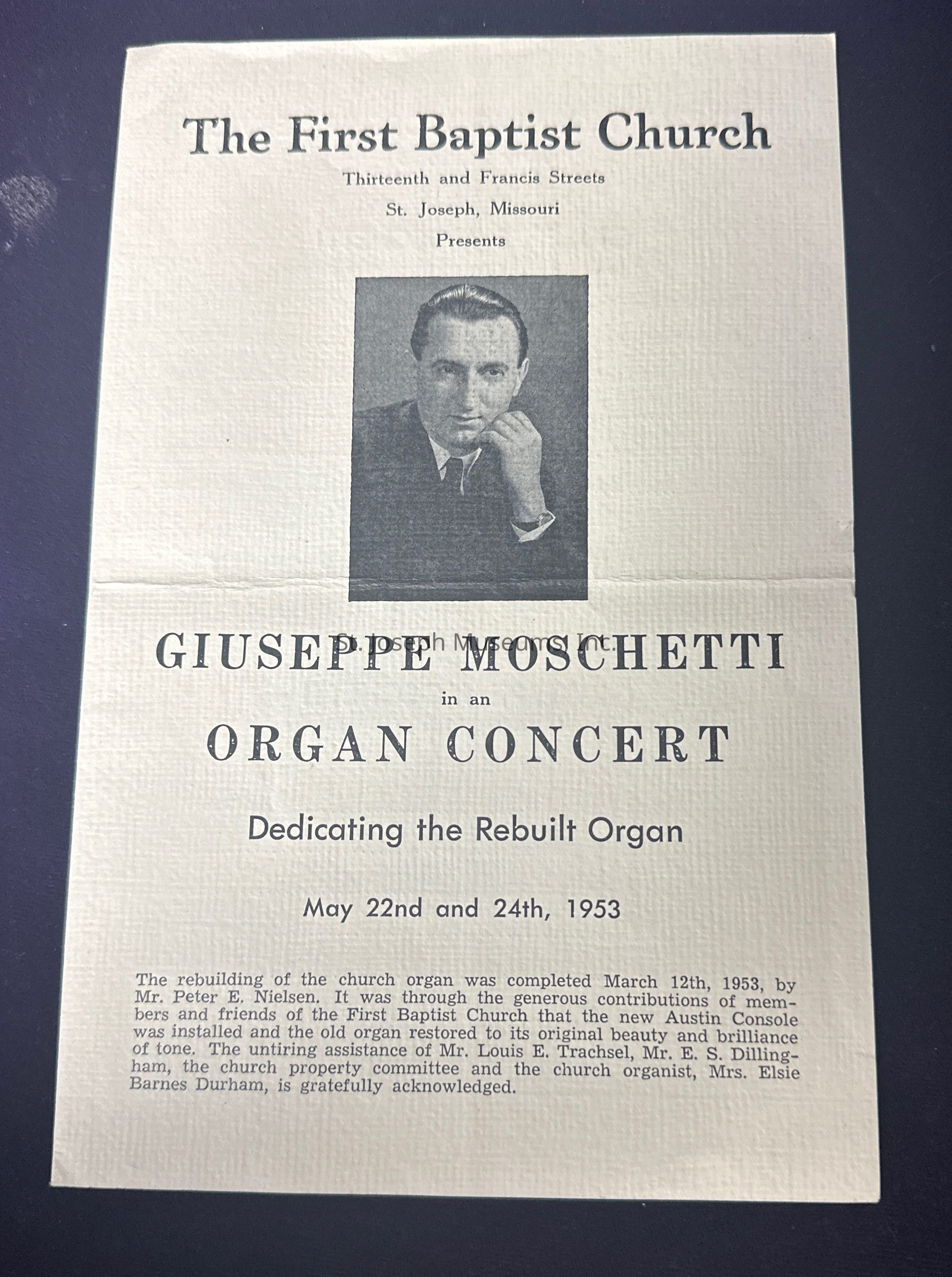 Pamphlet of a Giuseppe Moschetti organ concert dates May 22 and 24, 1953 at First Baptist Church celebrating the rebuilding of the church organ.