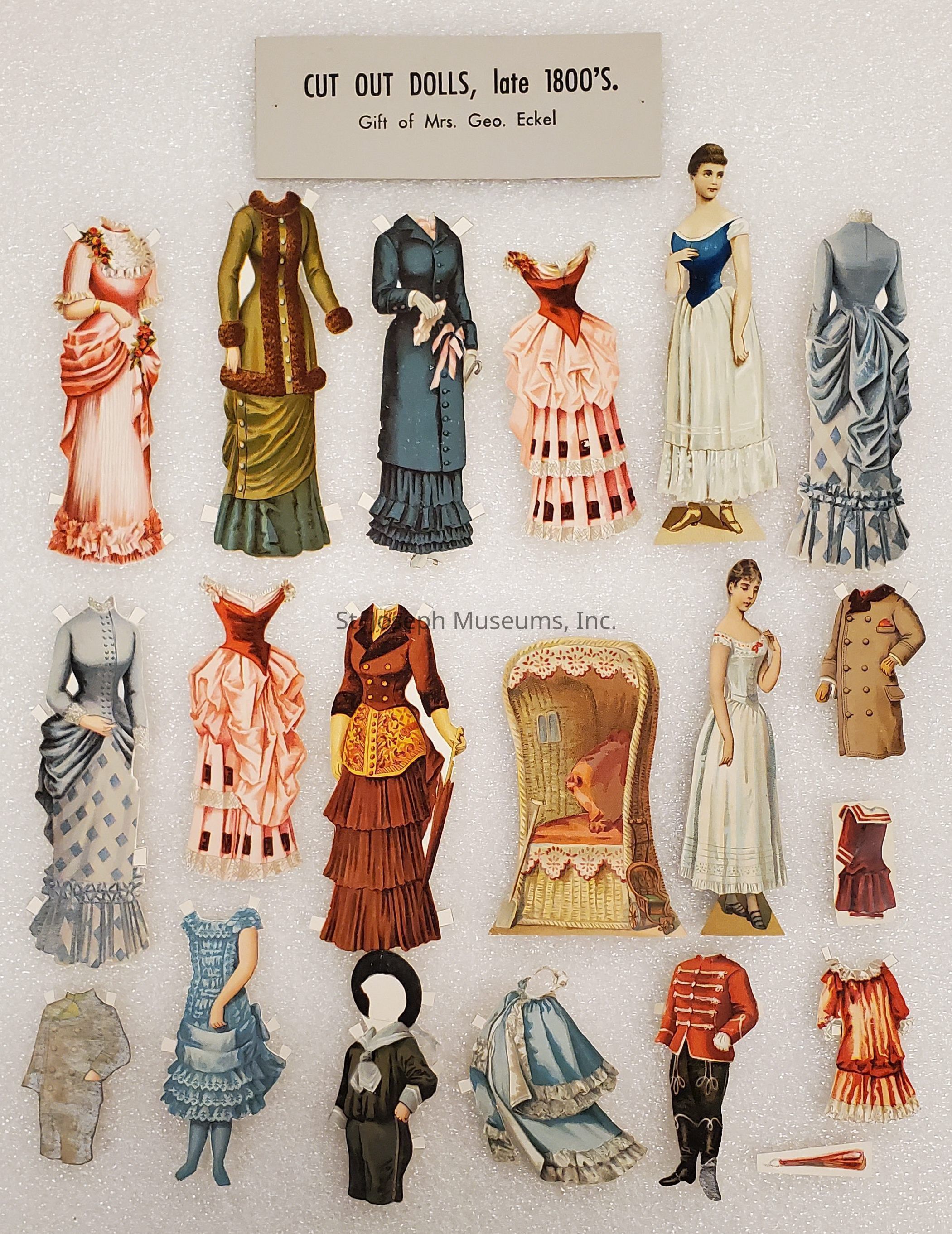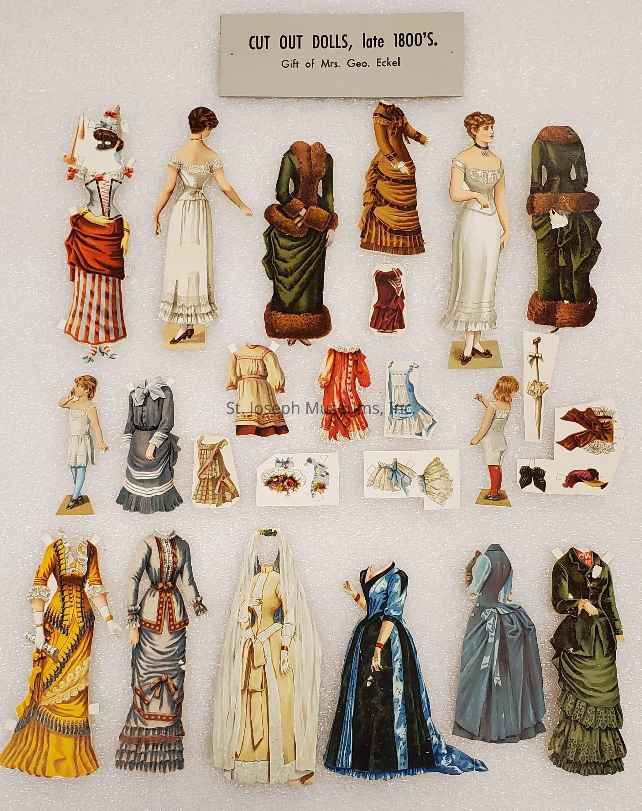 Paper Dolls from Bibi Lacy Eckel Collection, c. 1880s. Numerous paper dolls, both male & female with clothing and accessories. From the collection of Mrs. George Eckel.Lexicon