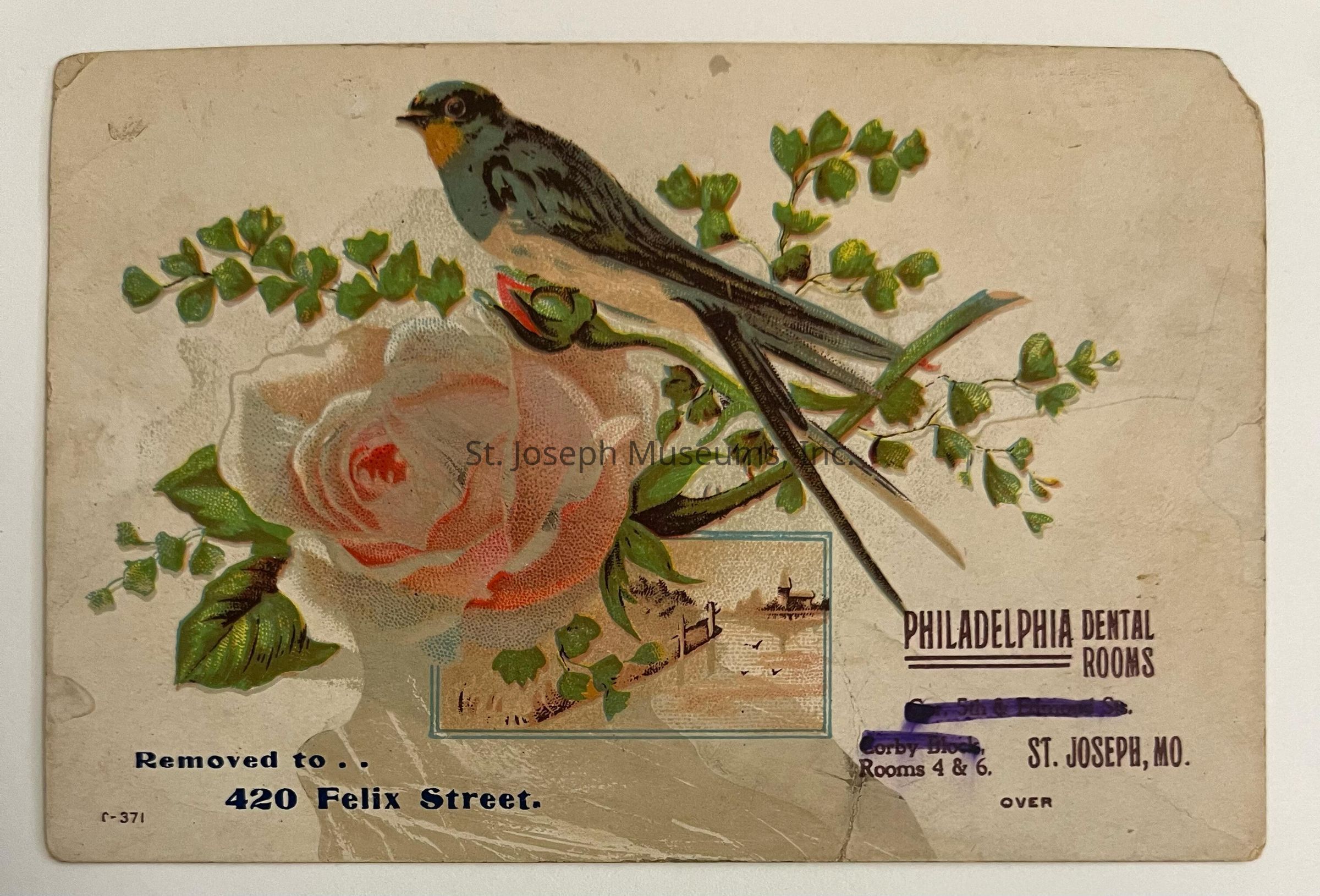 Philadelphia Dental Rooms, 420 Felix, Advertising Trade Card, undated. Dr. W. E. Hutchason, Manager. Color illustration of blue bird and rose on front. c. 1900