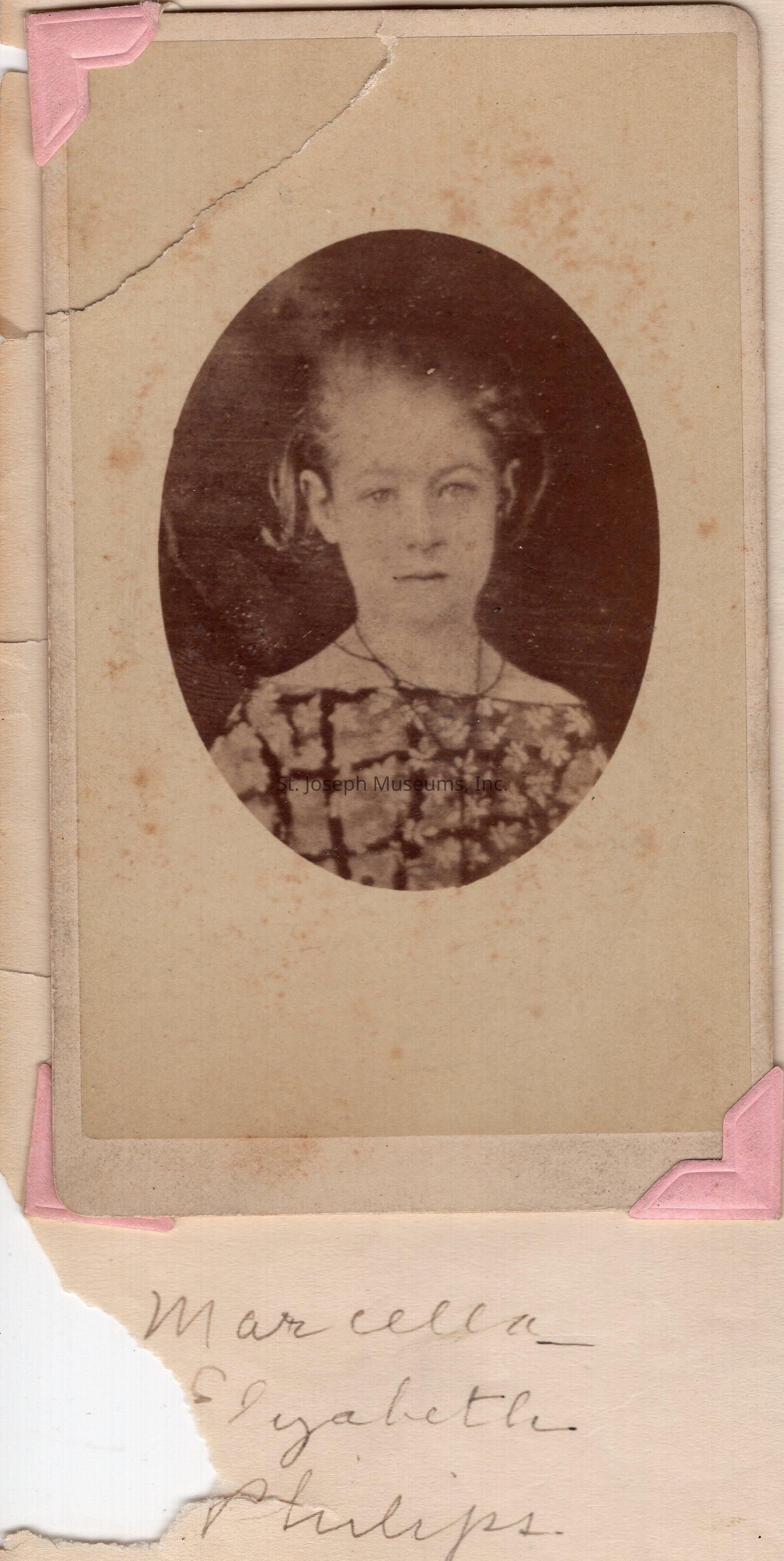 C = Marcella Elizabeth Philips, daughter of William & Martha (Hook) Philips, 1857. Portrait (bust oval) of young girl, about age 12, wearing flowered dress. The 2nd daughter, she died at age 13. Digital image of photo affixed in Worthington Family History notebook, 15.22.83.