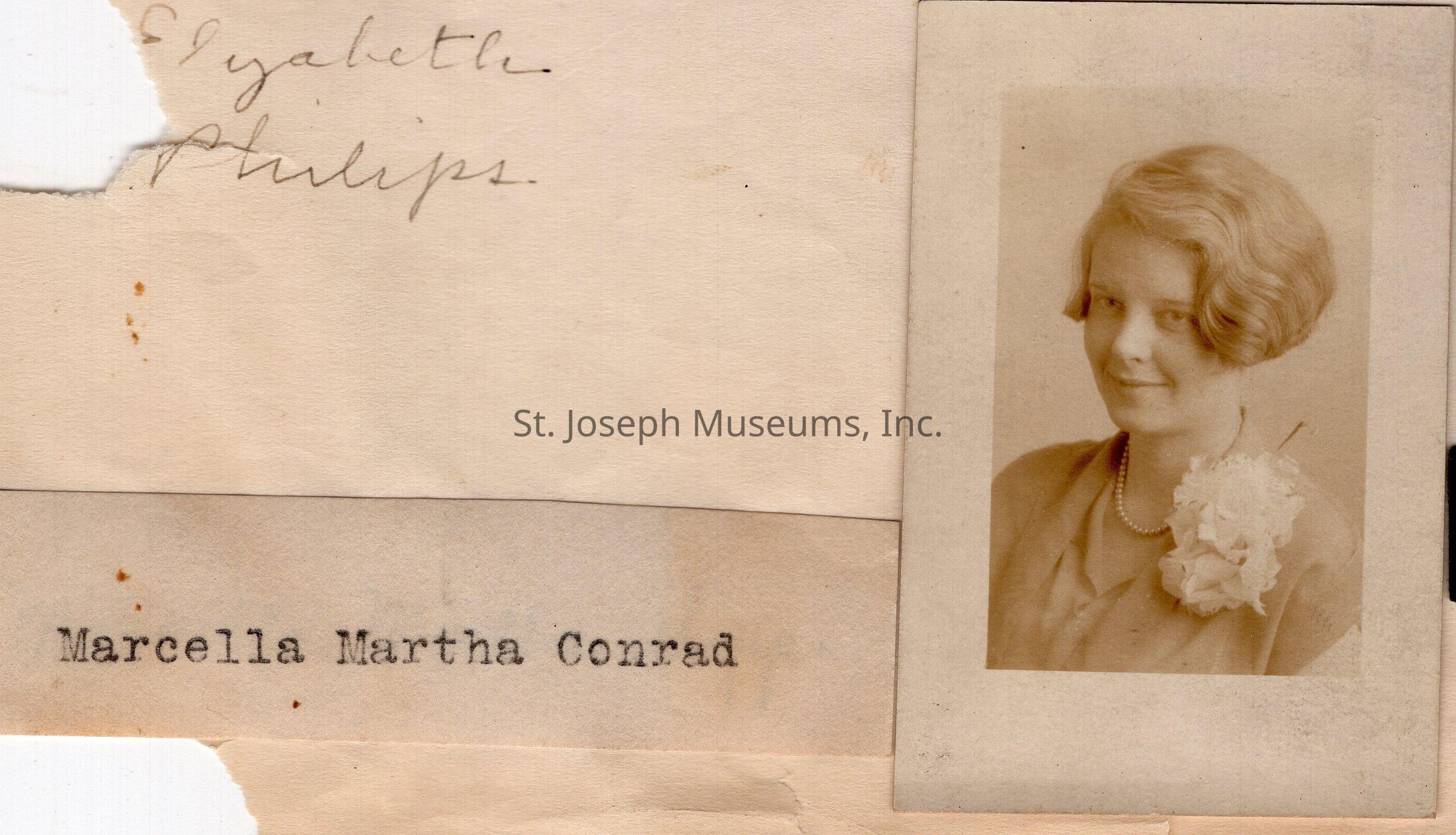 D = Marcella Martha Conrad, granddaughter of William & Mary Philips and also Thomas & Mary Conrad. She is the daughter of William and Frances (Philips) Conrad. Wallet-size photo (bust view) of young woman wearing corsage. c. 1920. Digital image of photo affixed in Worthington Family History Notebook, 15.22.83.