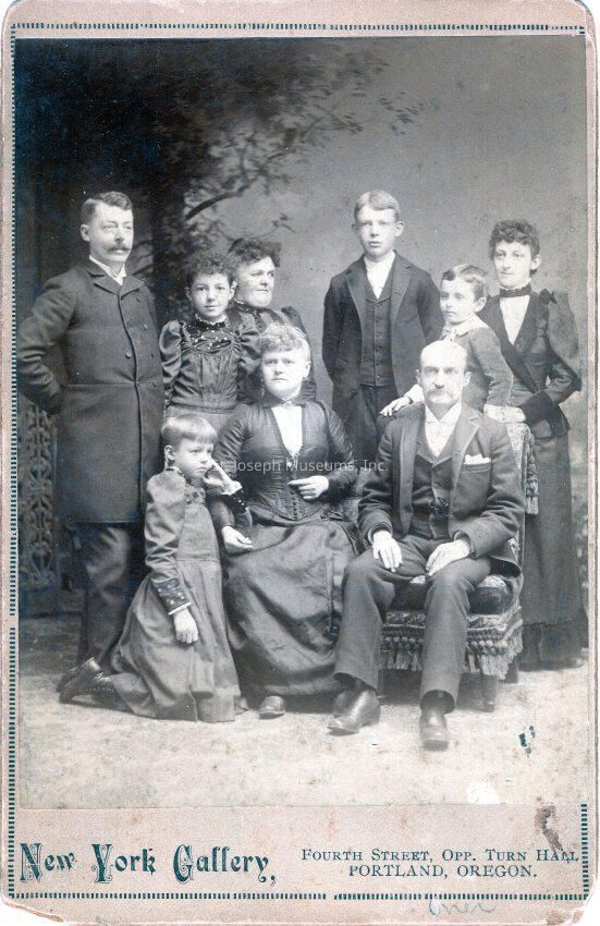 E = Thomas Hook Philips Family Group Photo. Thomas is the oldest son of William & Martha Philips. This is a family group which is composed of nine persons of varying ages with surnames Simpson, Philips, and Rose. Sepia" x 6½".Collection
