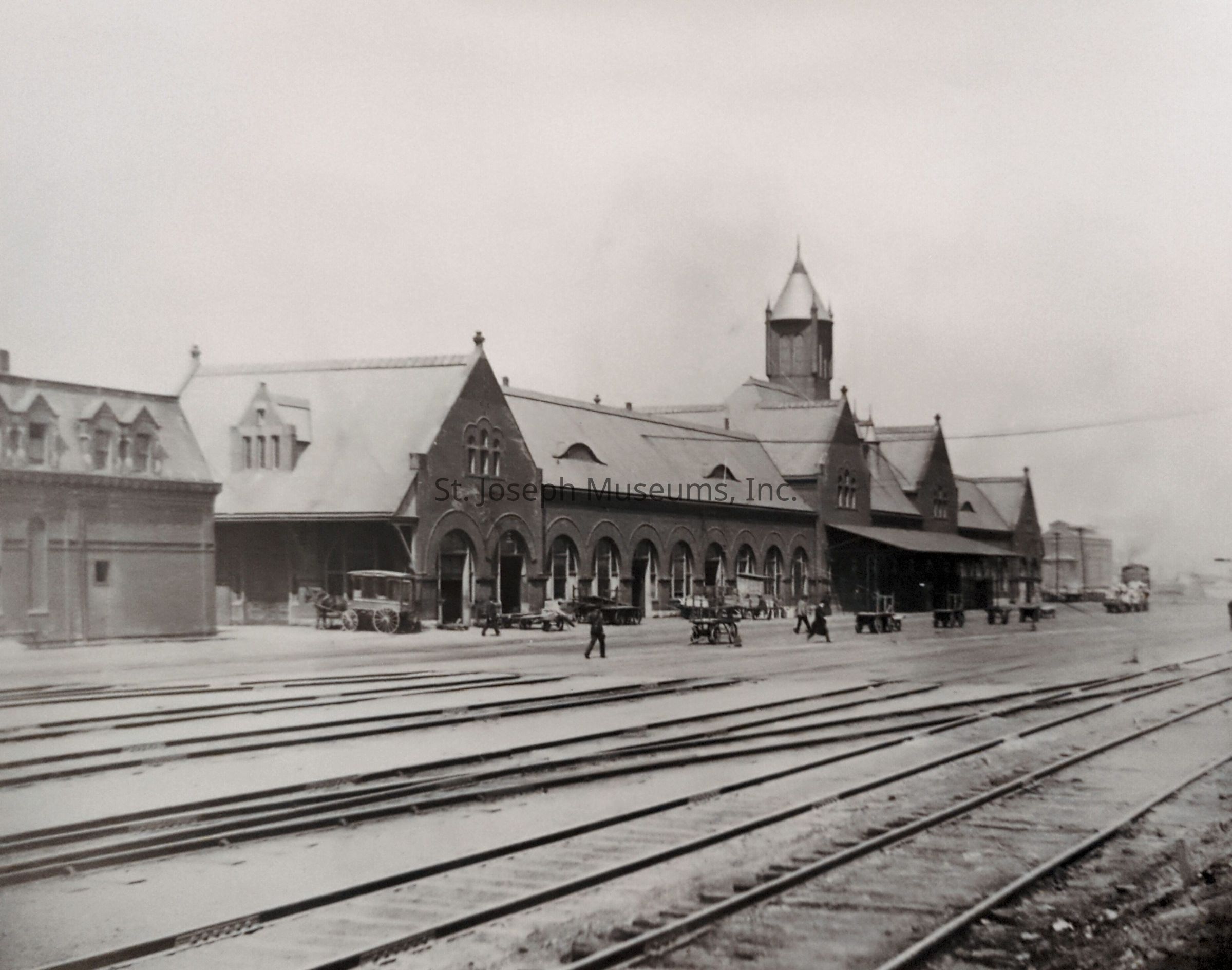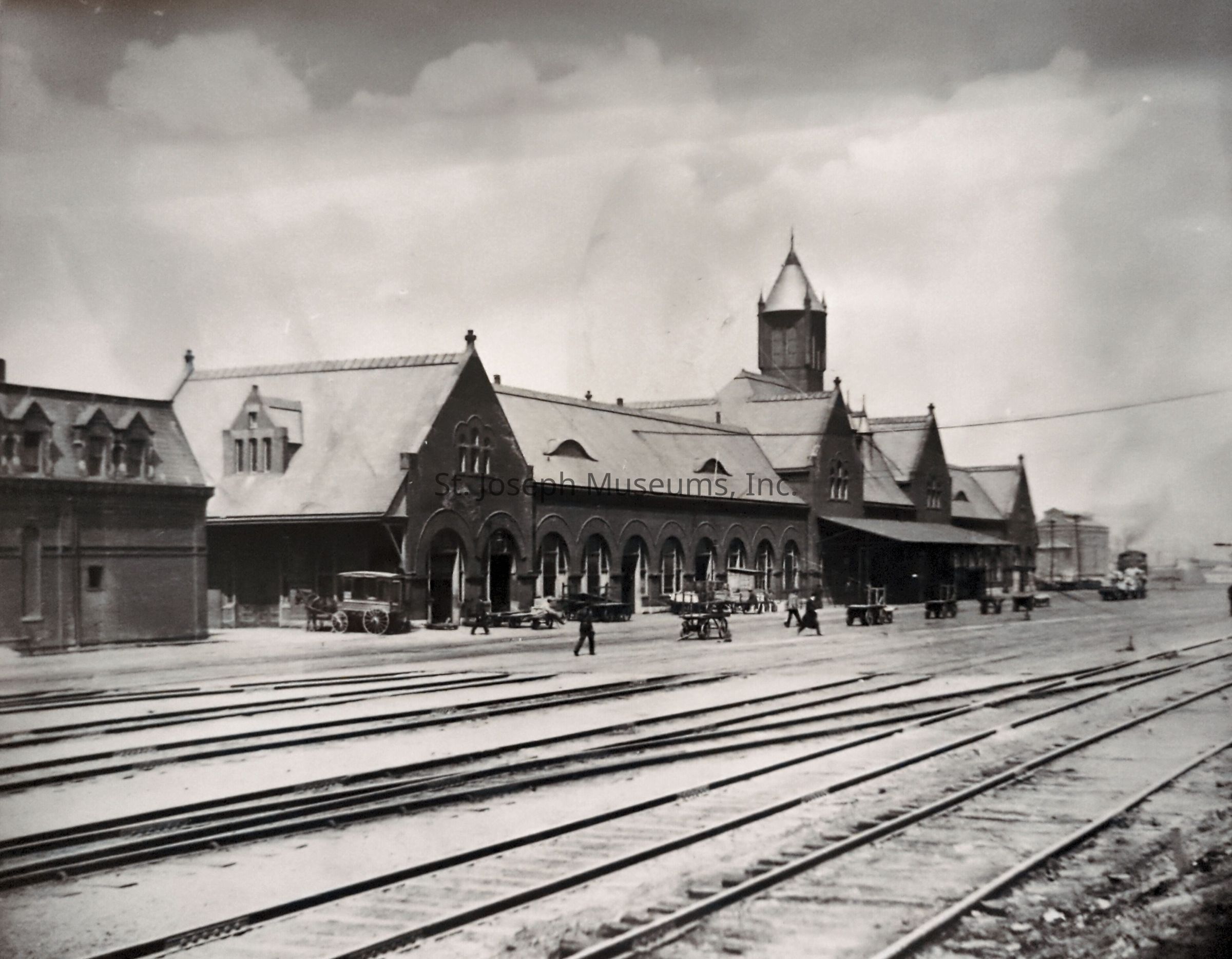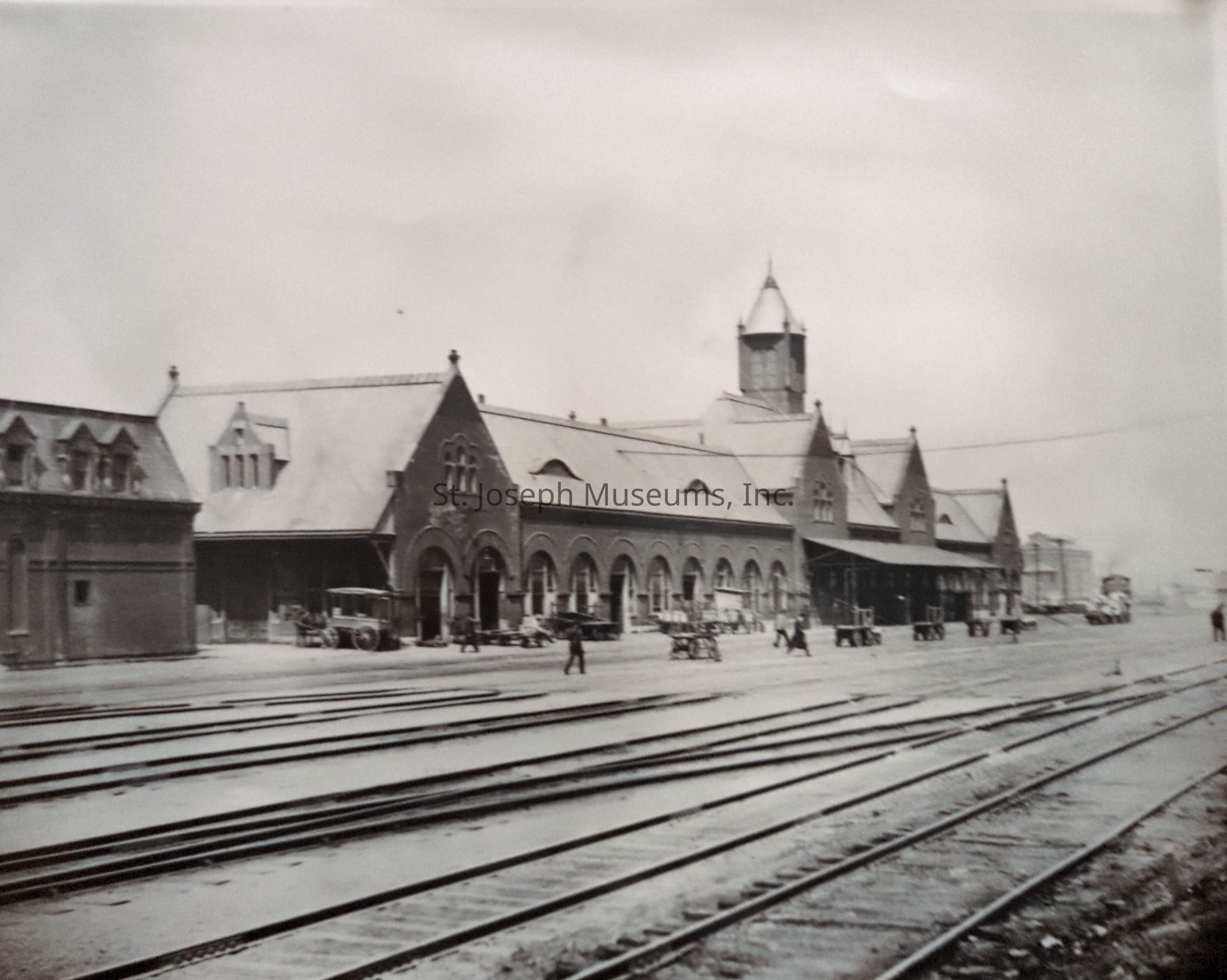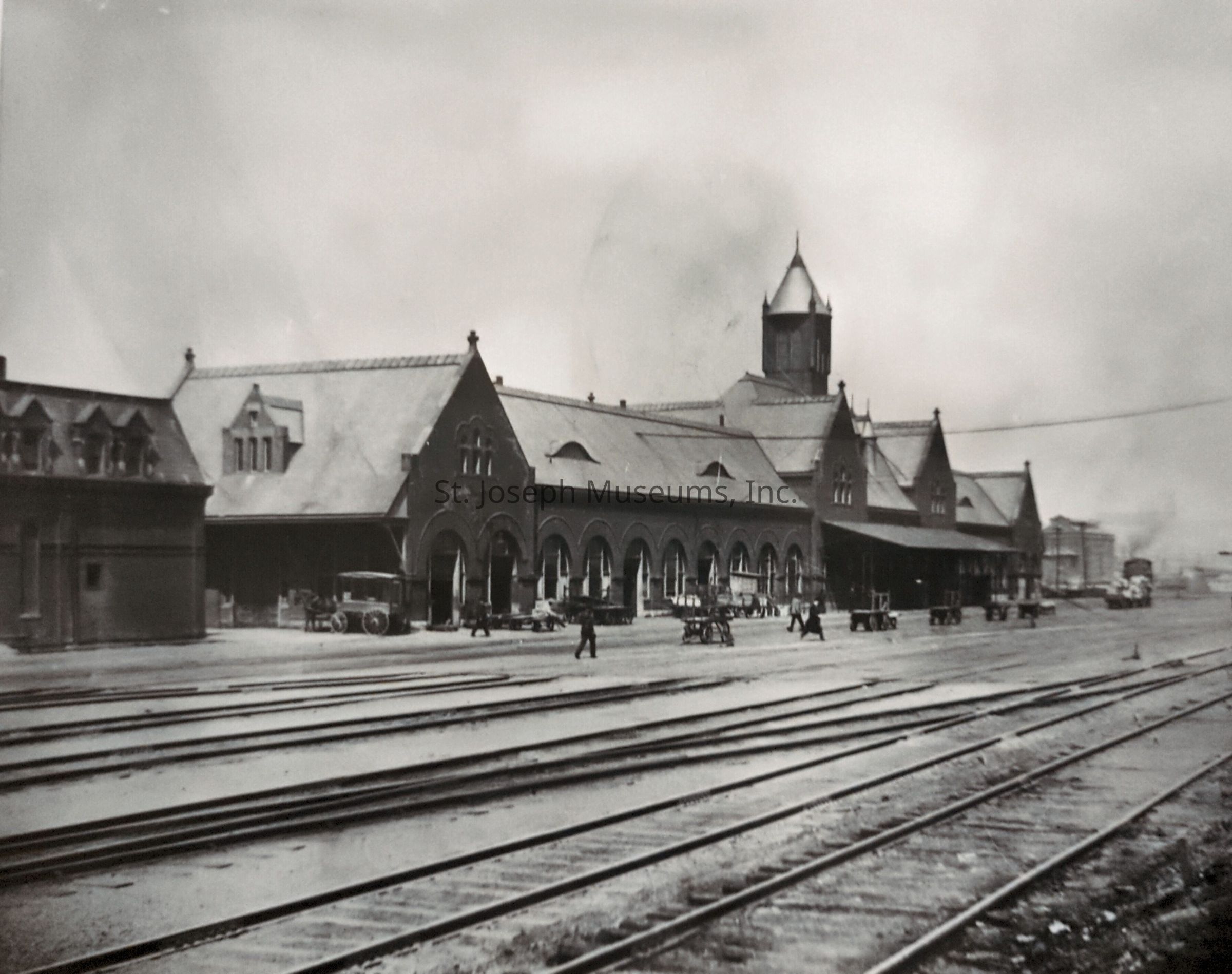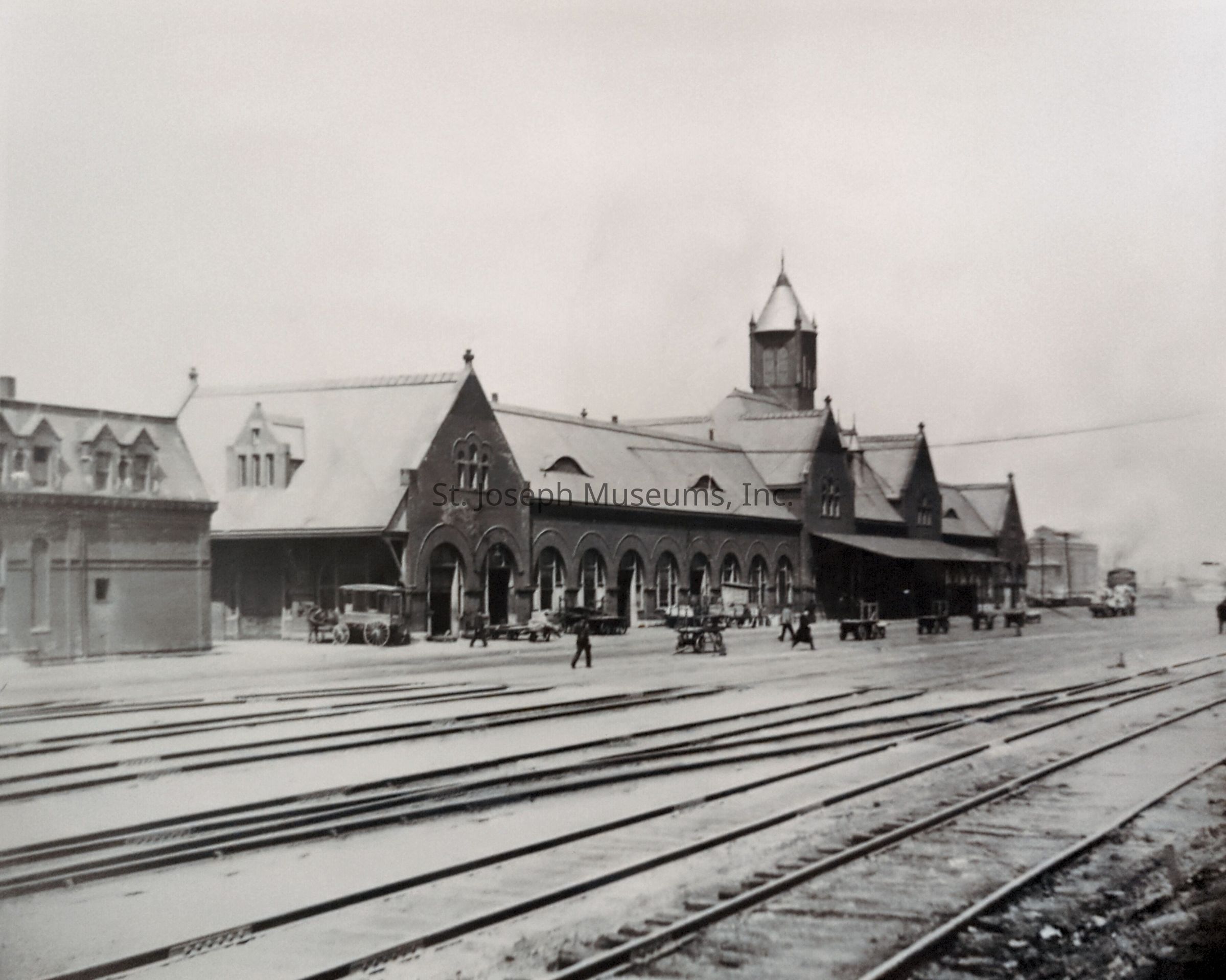 Black-and-white photograph depicting Union Station at 1221 South 6th Street, showcasing an early 20th-century architectural design with arched windows and a prominent central tower, surrounded by several vintage vehicles and travelers, all situated alongside multiple train tracks under a cloudy sky.