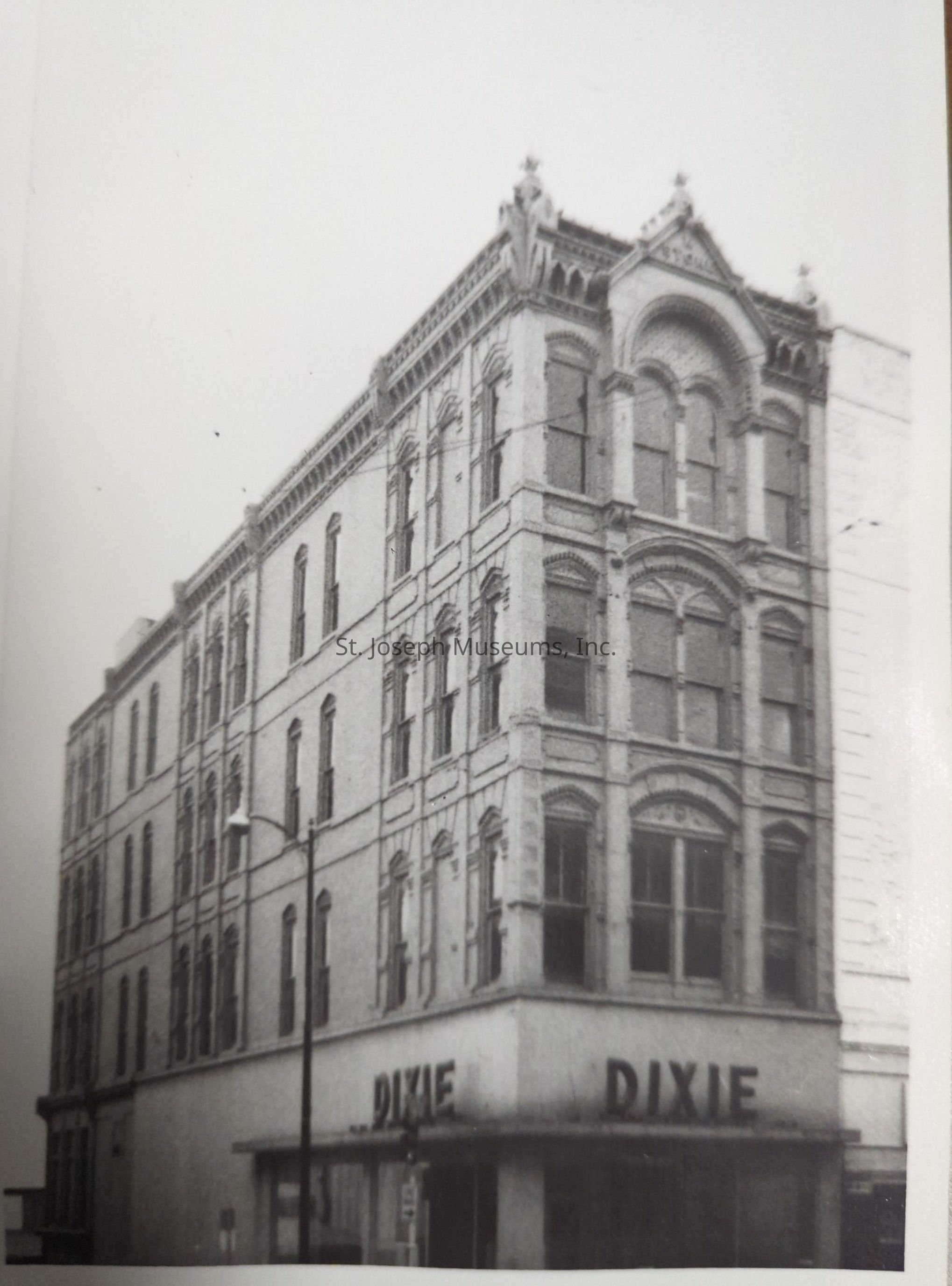 Black-and-white photograph shows a grand, multi-story architectural building located on the southwest corner of Felix Street, prominently featuring the "Dixie" shop at the base, with decorative details that emphasize its historical significance.
