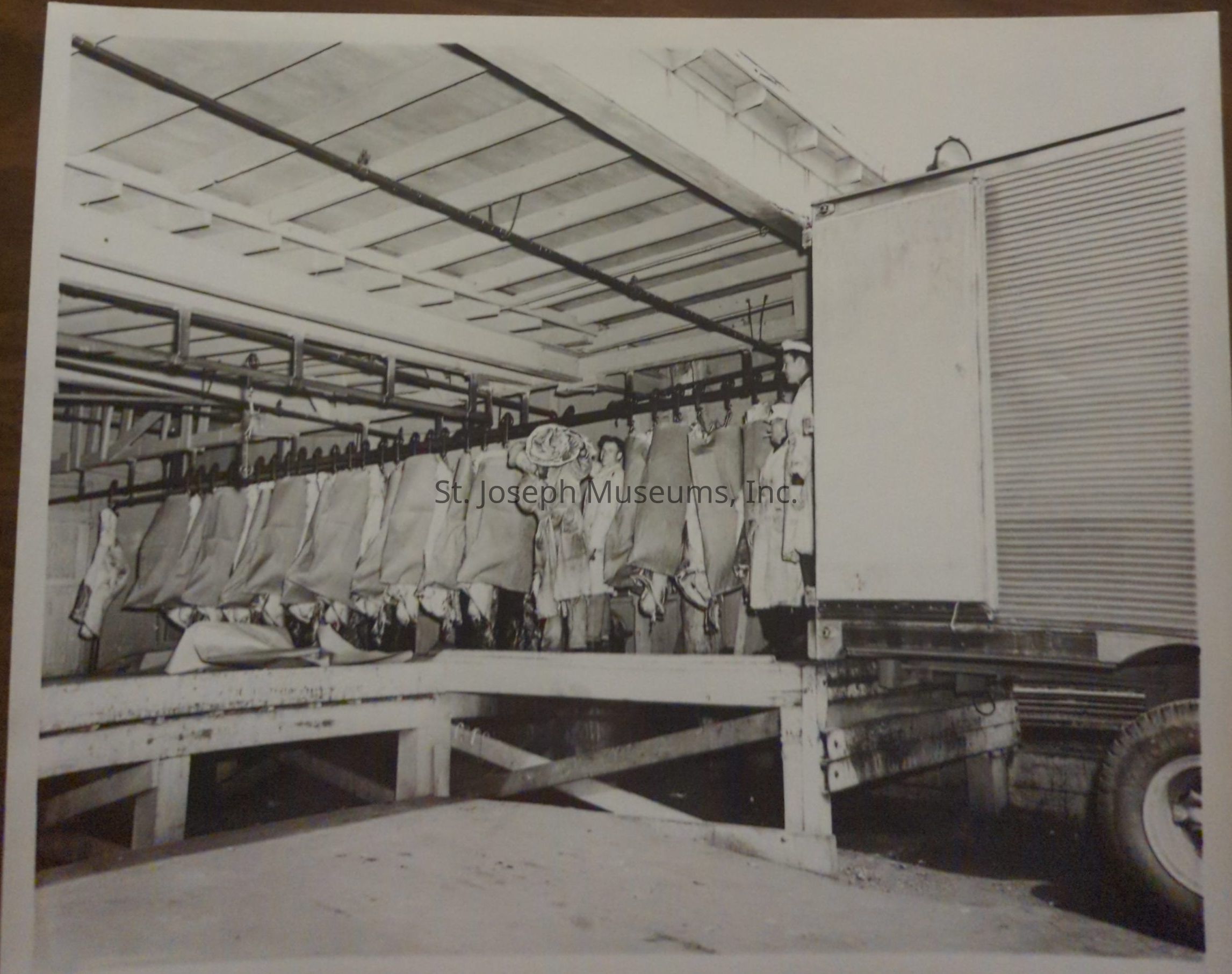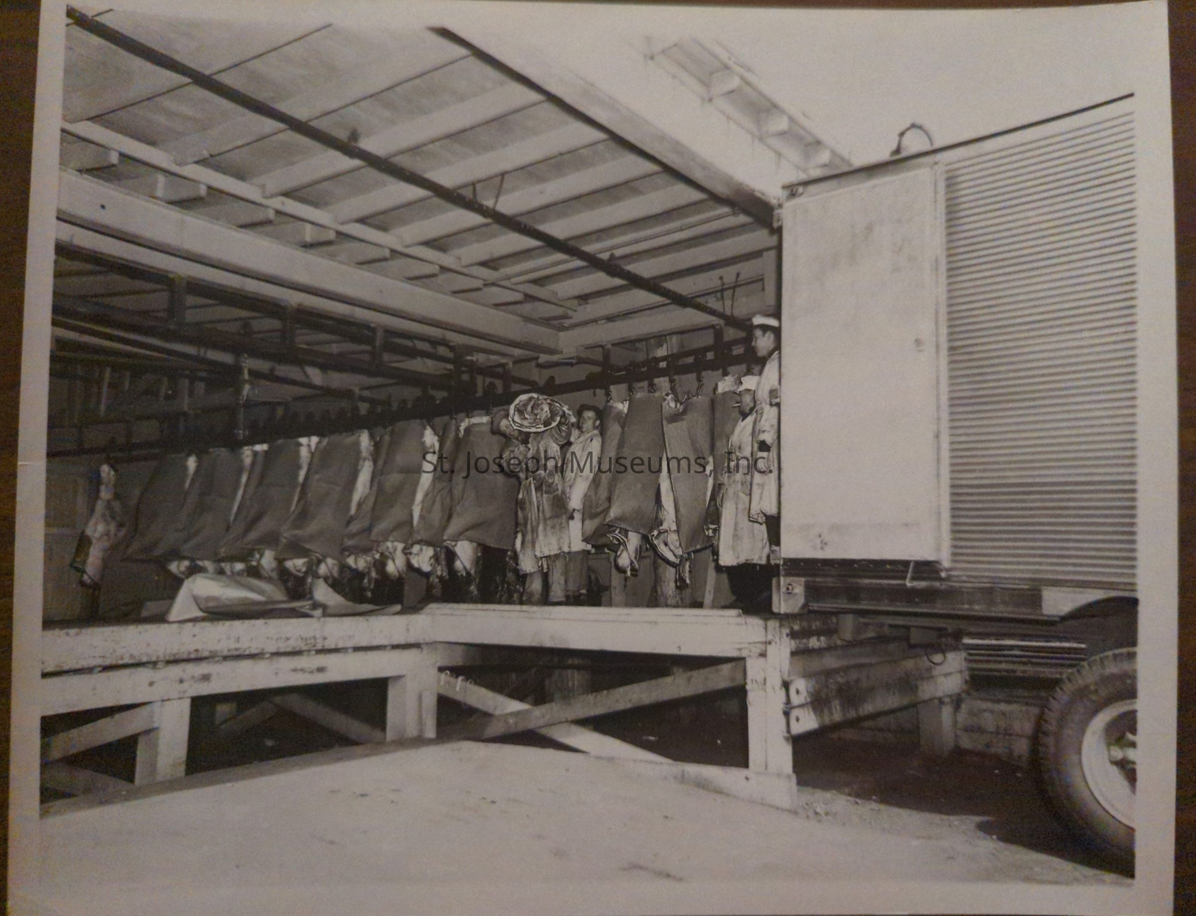 The black and white photograph depicts a refrigerated truck at a loading dock, with several beef carcasses hanging on hooks inside, overseen by workers in white coats and hats.