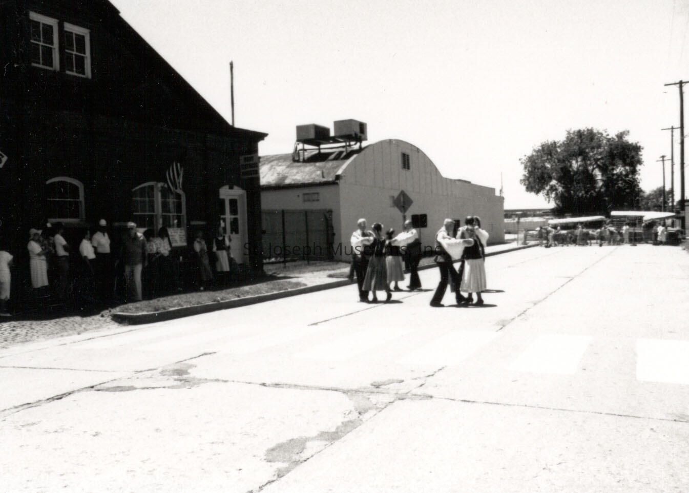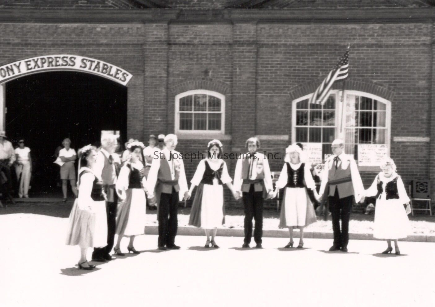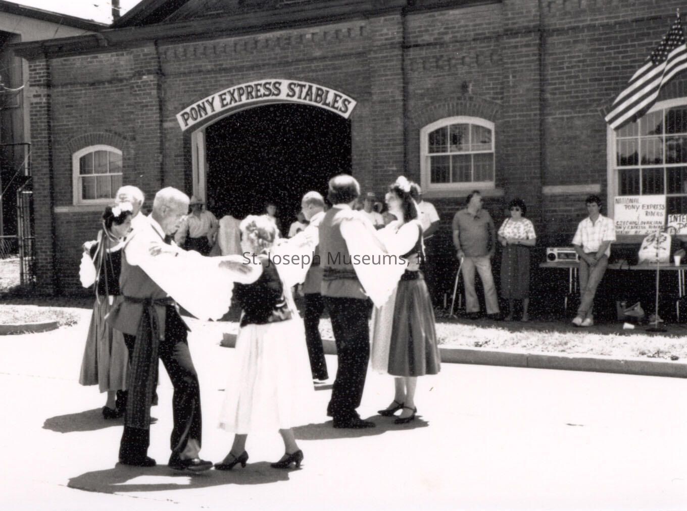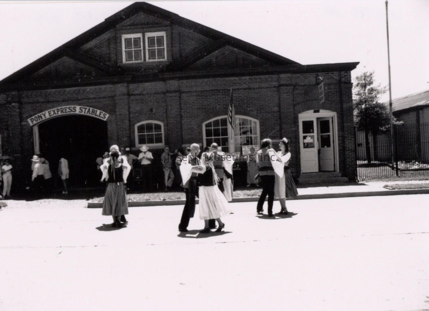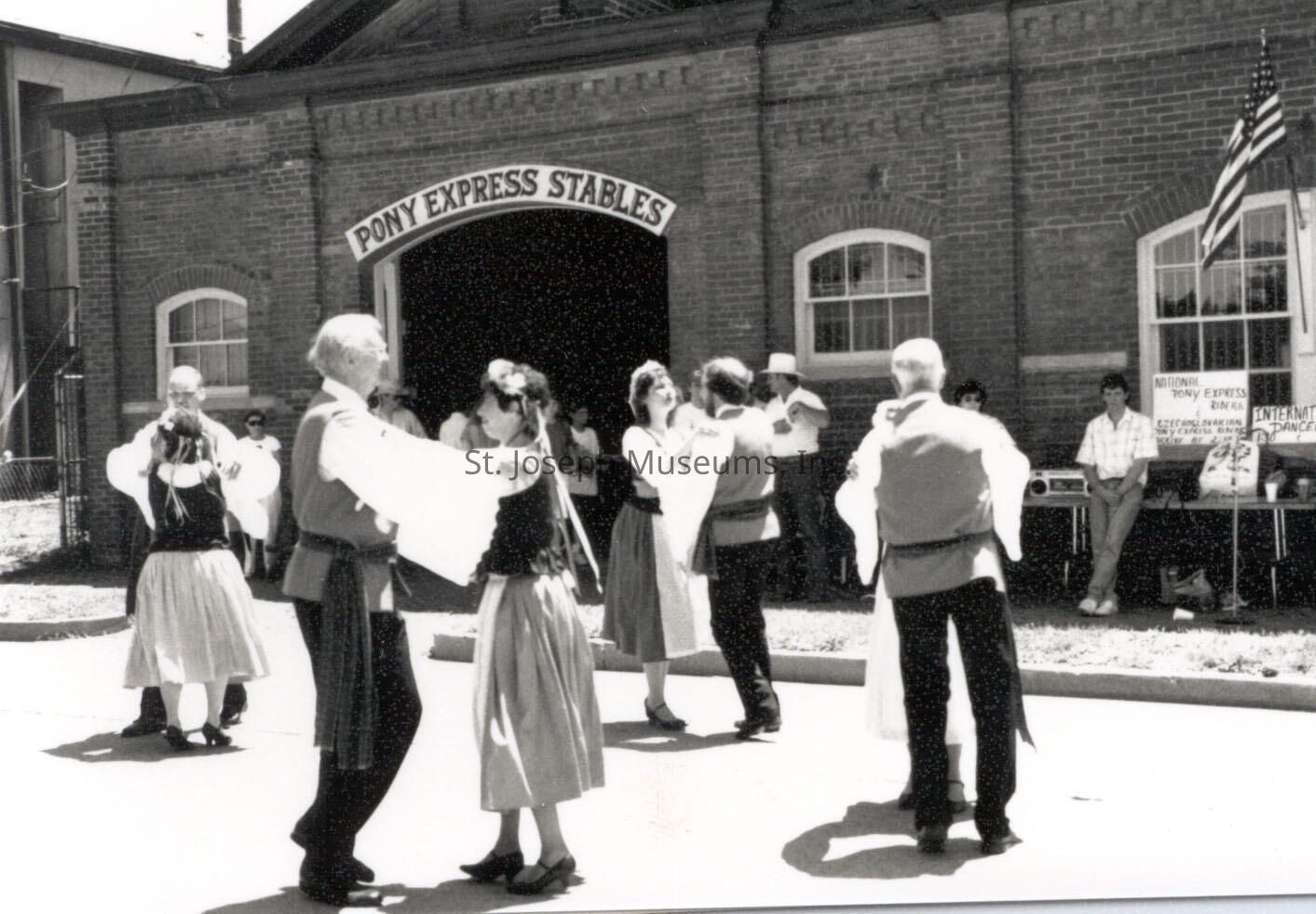 Pony Express 130th Anniversary Missouri Town Dancers at Pony Express Stables, 1990 Celebration sponsored by St. Joseph & Pony Express Museums, which included activities in Patee Park, performances by Missouri Town Dancers, a visit by the Pony Express Riders from Czechoslovakia and the National Pony Express Association start of its re-ride to Sacramento.