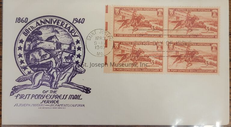 Pony Express 80th Anniversary First Day Cover, St. Joseph, MO, Apr. 3, 1940. First Day issue of commemorative envelope "First Day Issue". with four 3¢ commemorative stamps. Postmarked Saint Joseph, MO, 9 AM, April 3, 1940. unaddressed.