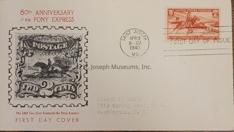 80th Anniversary Pony Express first day issue envelope addressed to Joseph W. Wells, 1319 Spring Road, N.W., Washington, D.C. April 3, 1940. Postmarked St. Joseph, MO Illustration of 2¢ stamp with pony rider on it. (Same illustration as 92.1.119).