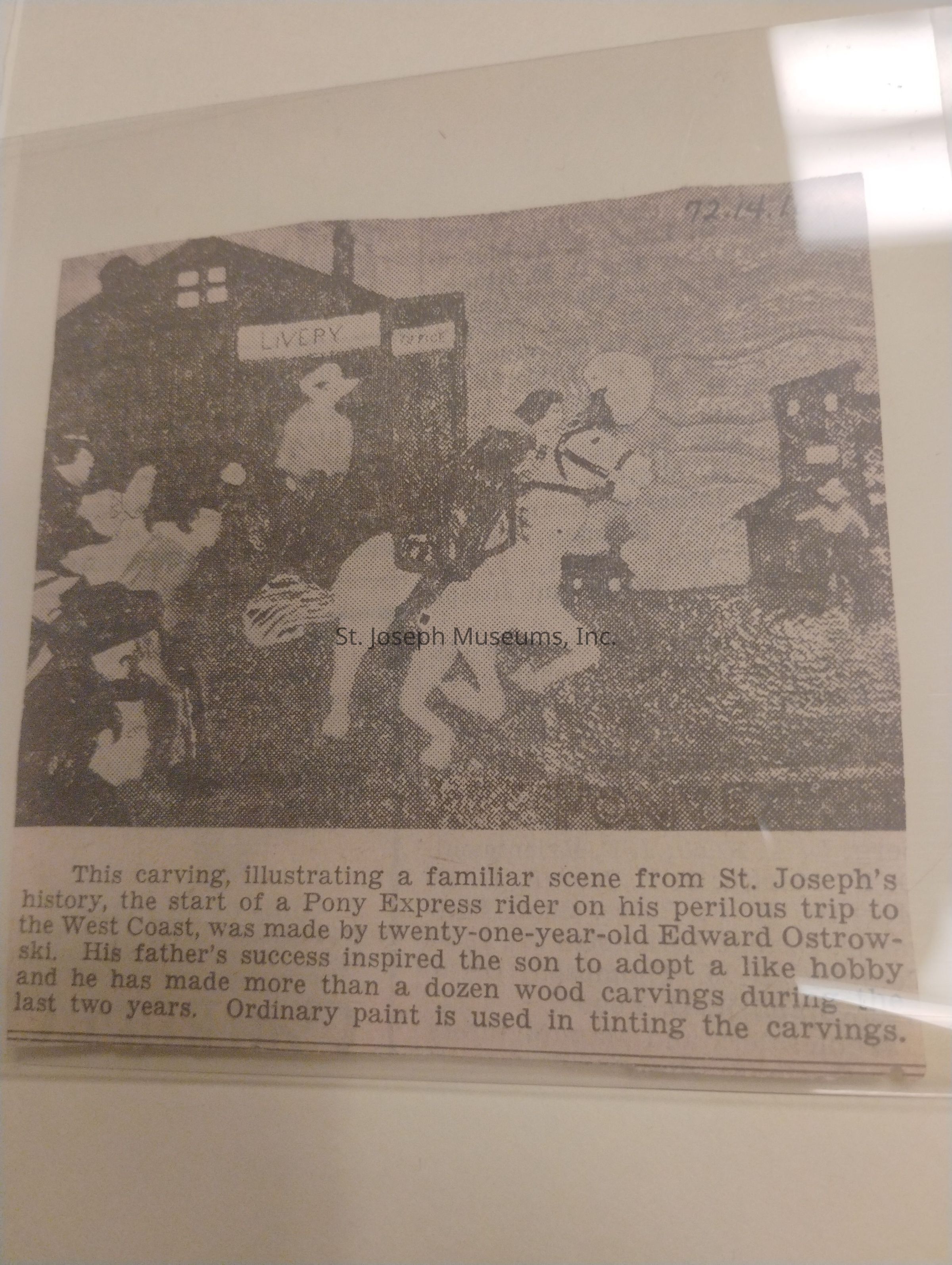 Pony Express Carving, News Photo, c. 1938. St. Joseph News-Press. Small news photo of a tabletop carving of a Pony Express rider leaving the stables, modeled after the Charles Hargens painting, "First Ride". Created by local resident. Caption: "This carving, illustrating a familiar scene from St. Joseph's history, the start of a Pony Express rider on his perilous trip to the West Coast, was made by twenty-one-year-old Edward Ostrowski. His father's success inspired the son to adopt a like hobby and he has made more than a dozen wood carvings during the last two years. Ordinary paint is used in tinting the carvings."