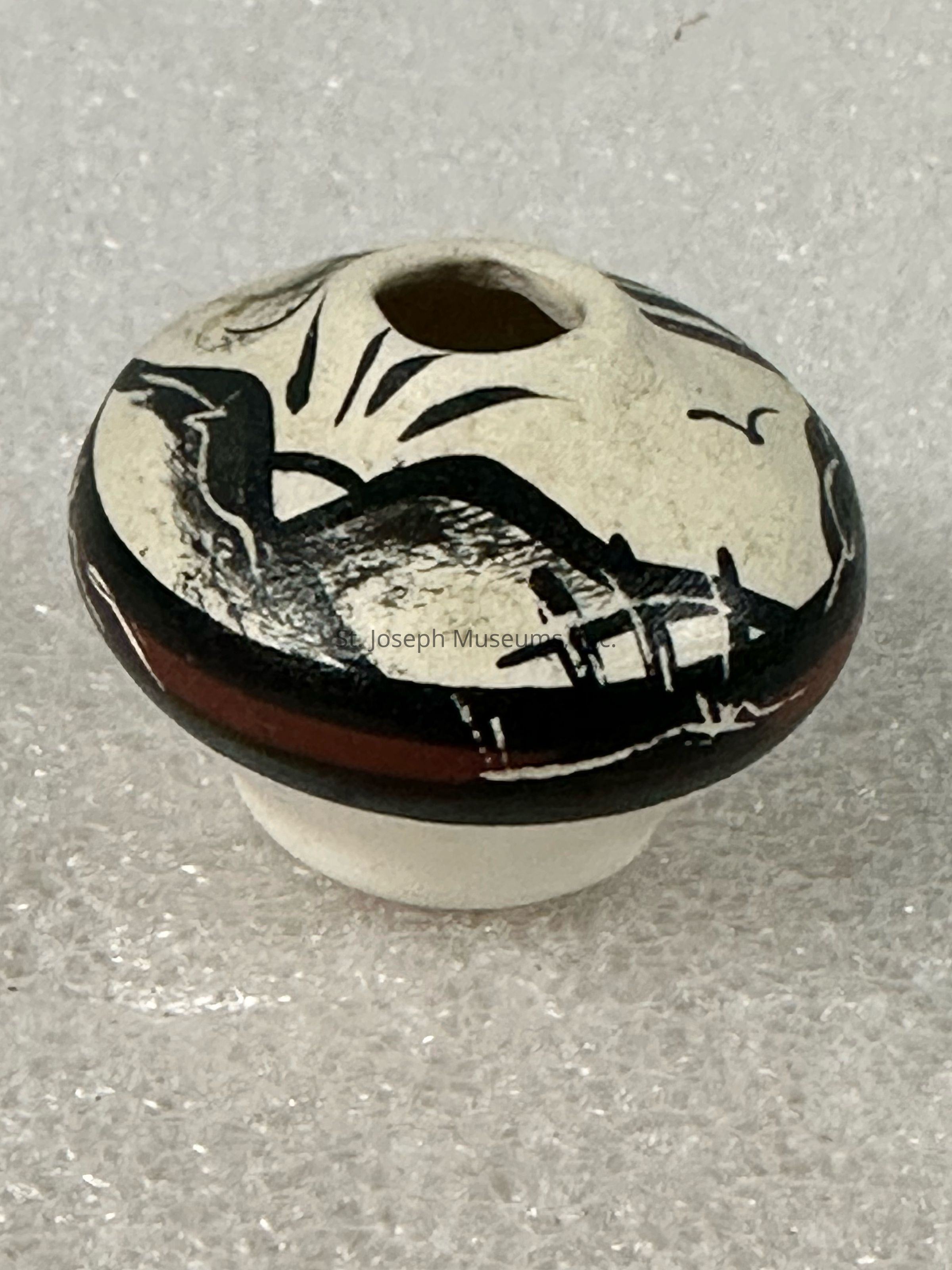 Property P36: Five Small Earthenware Pots & Ollas0, Object: pottery, Artist/Maker: unknown (20th Century, Various Tribes: Southwest), Title/Model: 5 Earthenware Pots & Ollas, Date/Region: ca. 1960-1990 / Southwest, Medium/Technique: polychromed earthenware / coil by hand, Edition/Series: unique, 1 of 1, Size: 3" H x 4" W (largest), Condition: average - good (upper left pot, chipped edge; lower right, abrasions), Signature/Inscriptions: largest: "PB Shebola", redware with grass: "Nena L O", white with black at 5 o'clock: "Betty Shelby", Exhibitions/Literature: n/a, Description/Notes: A variety of miniature pots from various tribes.Collection