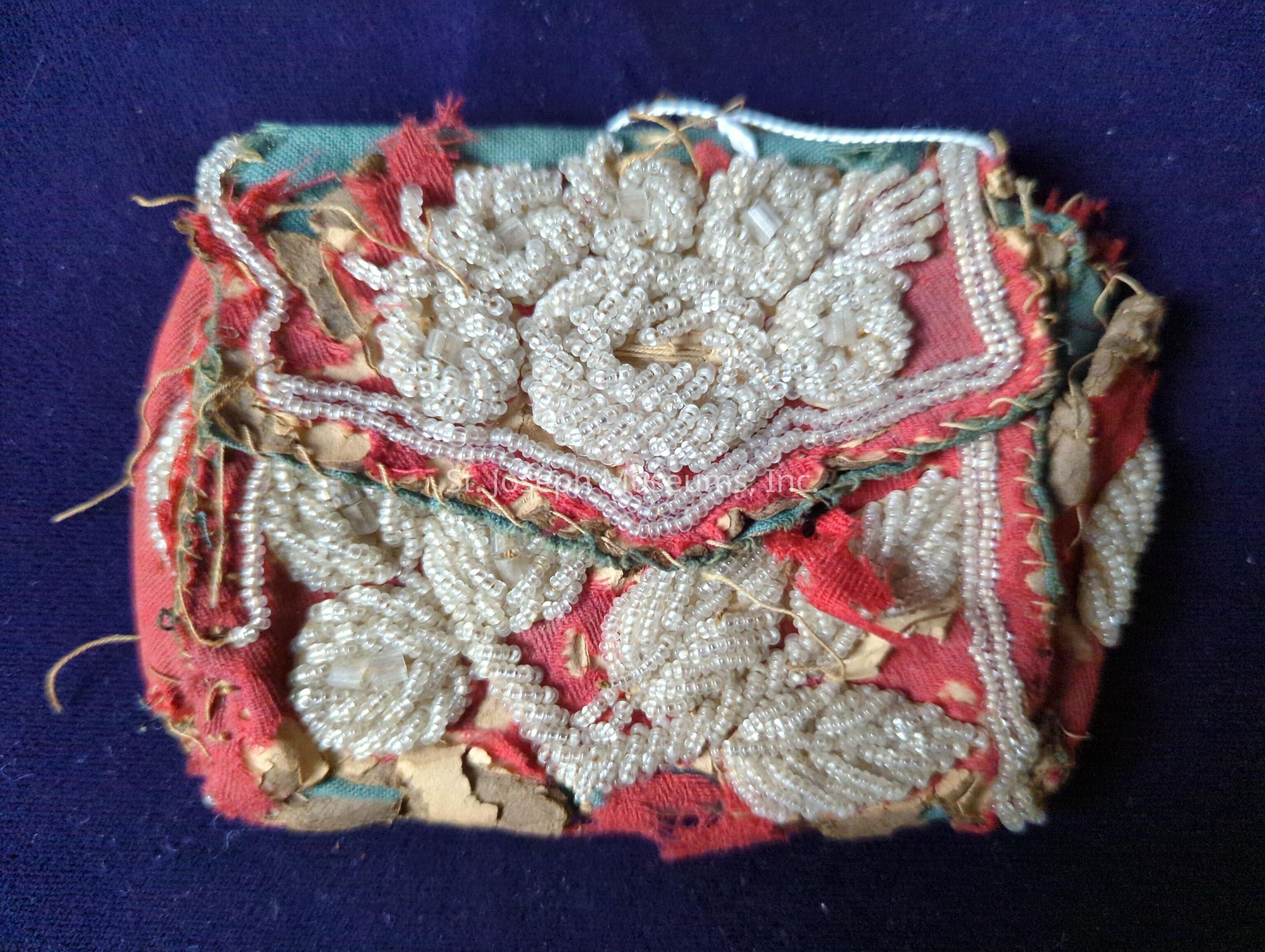 SMALL/RED/WHITE/FLORAL DES./GREEN LINING/FLAP CLOSURE WITH HOOK & EYE/EYE IS MISSING/POOR CONDITION/"IOWA INDIANS"