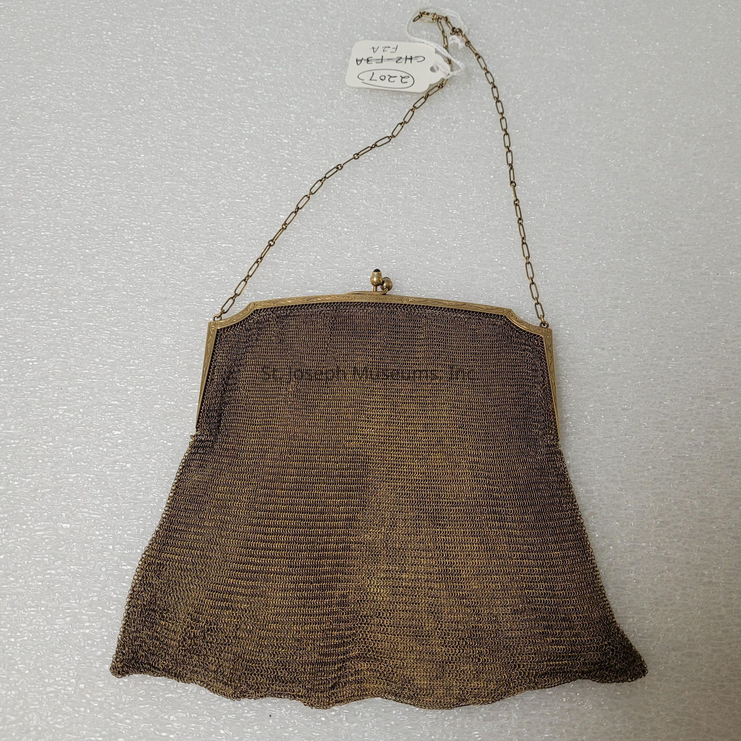 Purse/ mesh bag/ lady's/ 14K gold - :"Hallmark 14-K"/ sapphire chips (blue) in snap closure/ chain handle/ engraved inside "Julia Woodson Edmond - St. Joseph. Mo."engraved on outside/ "J.W.E."