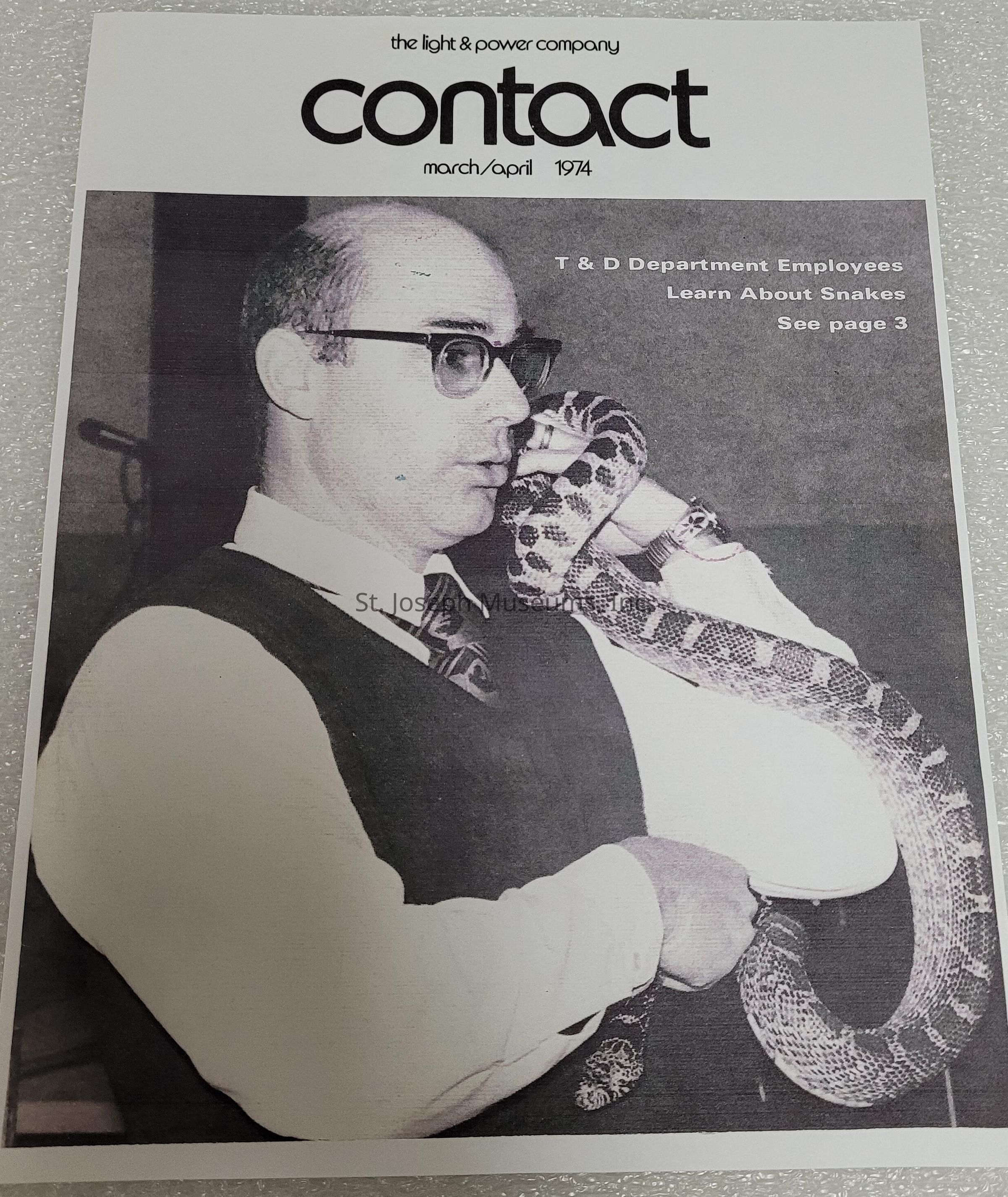 A paper copy from "The Light and Company: Contact" cover of Rich Nolf holding a snake for public programming event. Issue is from March/April 1974.Context