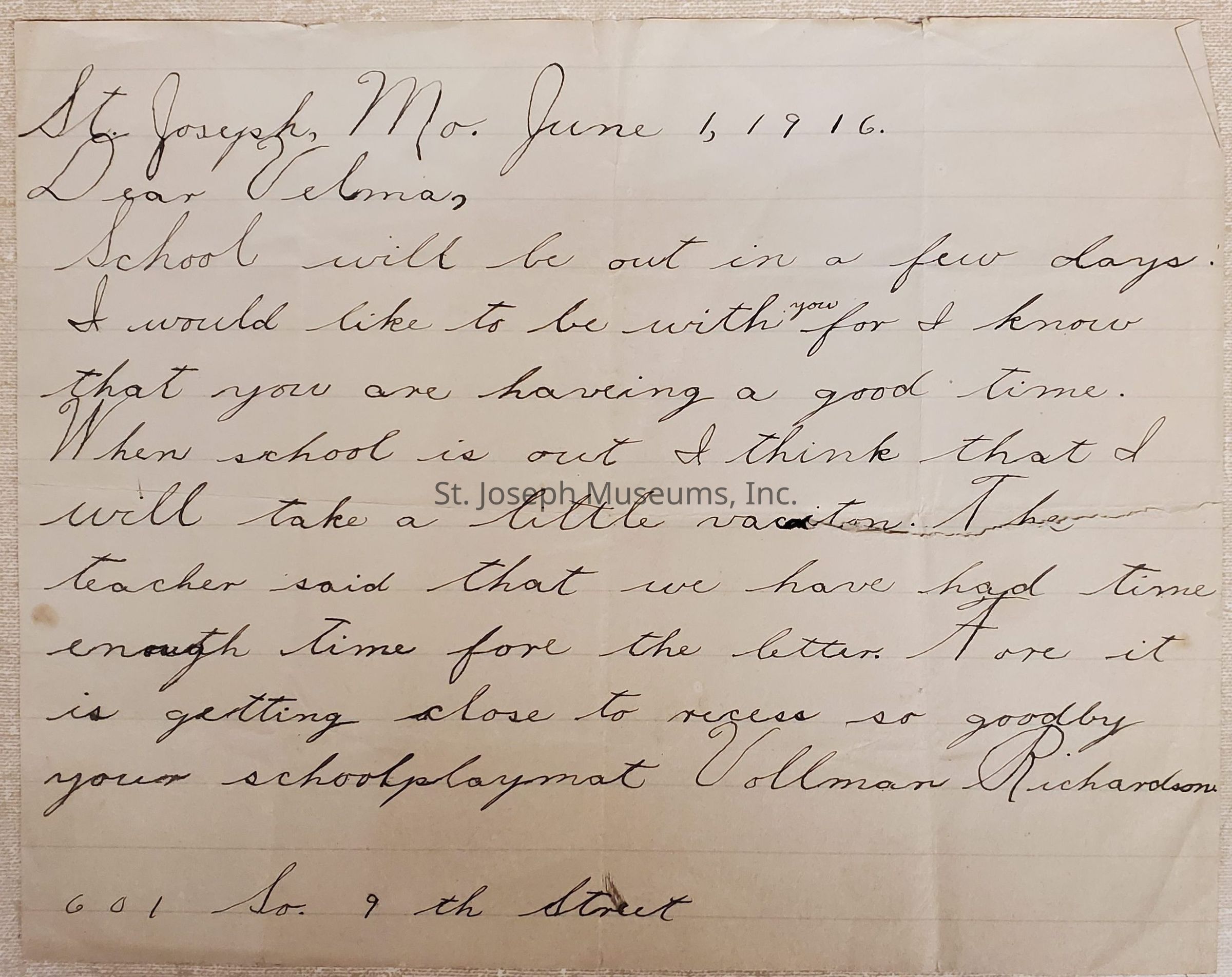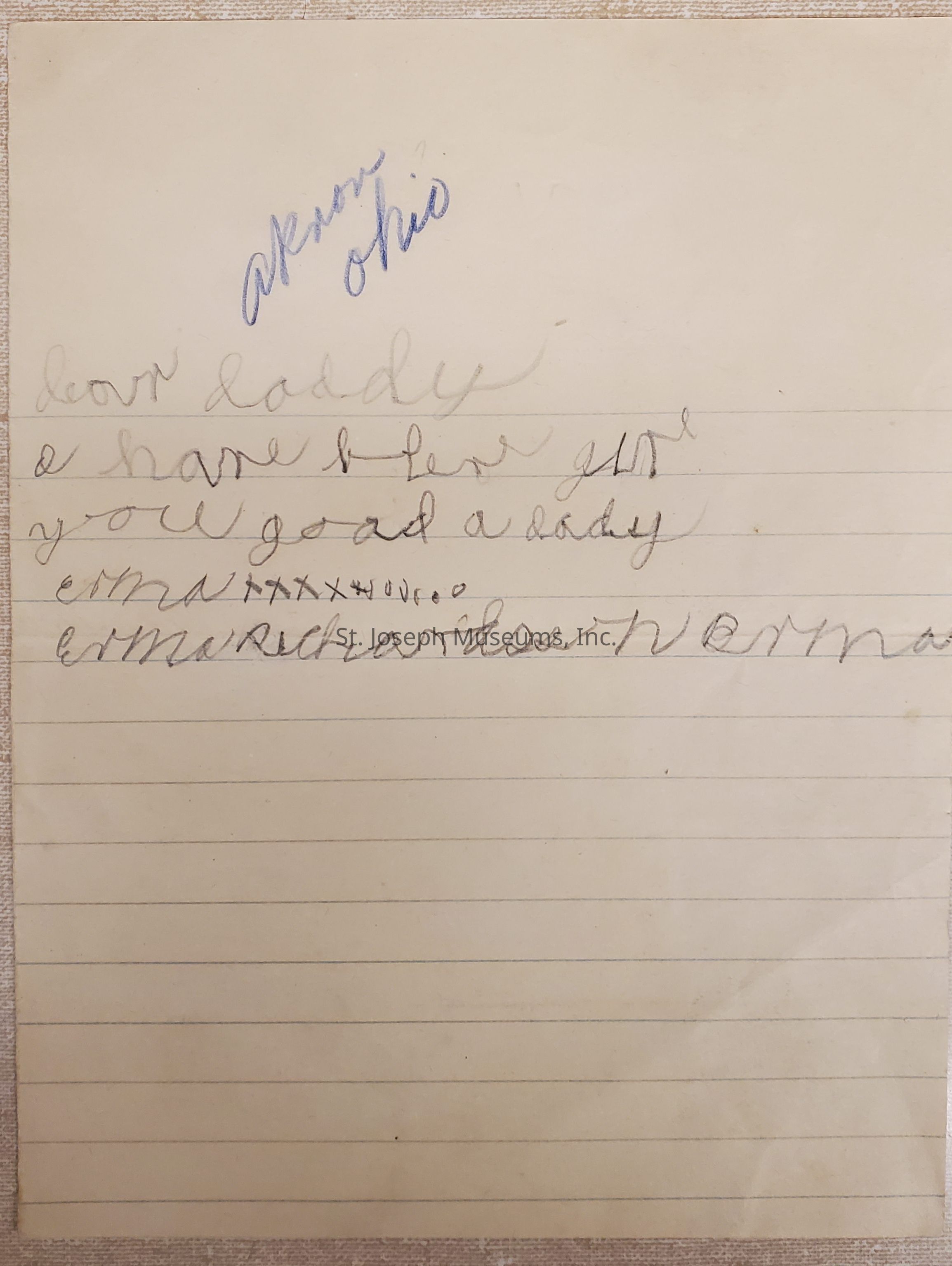 Richardson (Lloyd) Personal Papers, 1916-1949. Variety of personal papers (10) belonging to Richardson. Includes correspondence, notes from children, photographs, and news clippings. A = Dear Velma, Letter dated June 1, 1916. Signed Vollman Richardson, 601 S. 9th St. handwritten on lined tablet paper, 6" x 8" B = Dear Daddy, note signed Erma Richardson, "Akron, Ohio" over-written at top. on lined tablet paper, 5" x 6½" C = Dear Erma, Letter dated January 17, 1949, signed Dona (her sister). on Mt. St. Scholastica College letterhead. handwritten, paper, 7¼" x 10½" D = Photocopy of little girl with bow in her hair, undated, unidentified. 8½" x 11" E = Photo of Young woman in dark coat & hat, taken outside, undated, unidentified. on handmade oblique-angled mat, on folded paper b/w, 2" x 3" photo on 5¼" x 7¼" mat. F = Photo, tiny, Young woman in light coat with dog, taken outside at foot of porch steps. undated, unidentified, b/w, I" x 1½" G = Photocopy, Lloyd & Nadine Richardson driving an open touring car in a parade. Crowds line sidewalk in front of Rix & Co. and Cook's Paint Store. undated. 8½" x 11". H = Postcard, Photo of girl holding basket of flowers, handwritten message on back. undated, unmailed. Sepia, 3¼" x 5¼" I = Motorcycle Club Here Two Years Old, Has Two Sets of Grandparents, News clipping, June 20, 1948. Mentions Lloyd & Nadine Richardson as member.