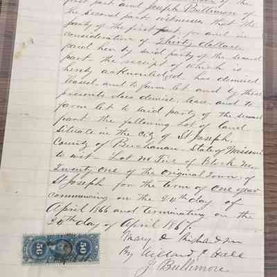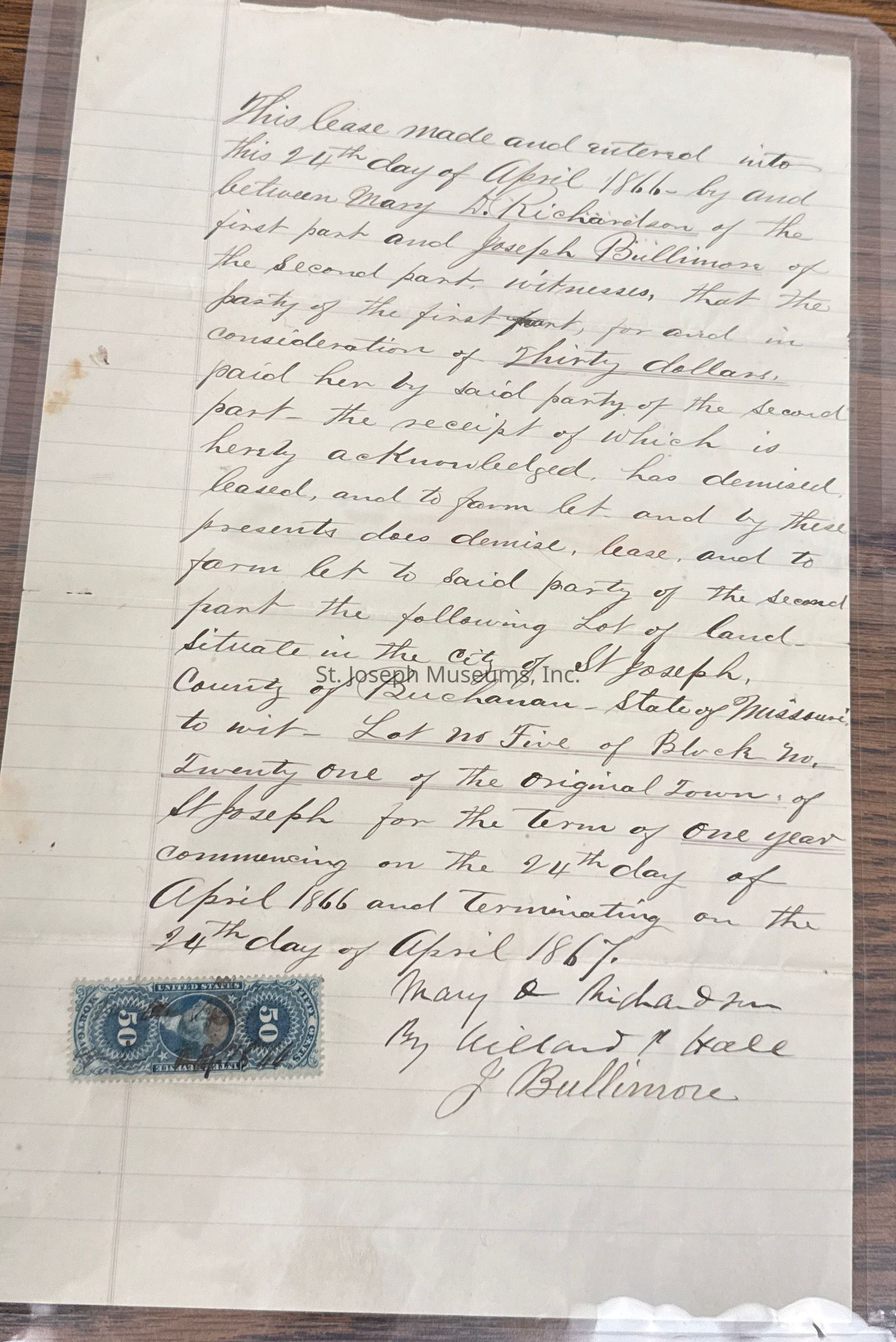 Richardson, Mary D., Lease between she and Joseph Bullimore, 1866. Lease between Mary D. Richardson and Joseph Bullimore for $30 for a farm lot for a term of one year, signed by Mary Richardson, by Willard Hall, and signed by Joseph Bullimore. The lease was dated April 24, 1866. A 50 cent stamp was affixed.Lexicon