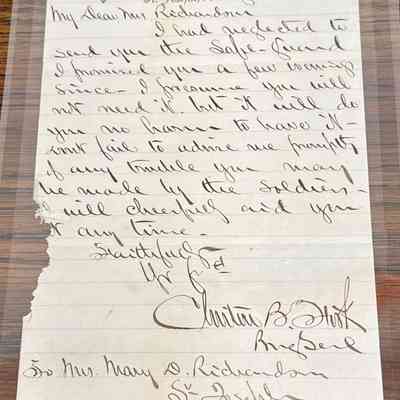 "I had neglected to send you the Safe-Guard I promised you a few evenings since. I presume you will not need it but it will do you no harm to have it. Don't fail to advise me promptly if any trouble may be made by the soldiers. I will cheerfully aid you at any time.